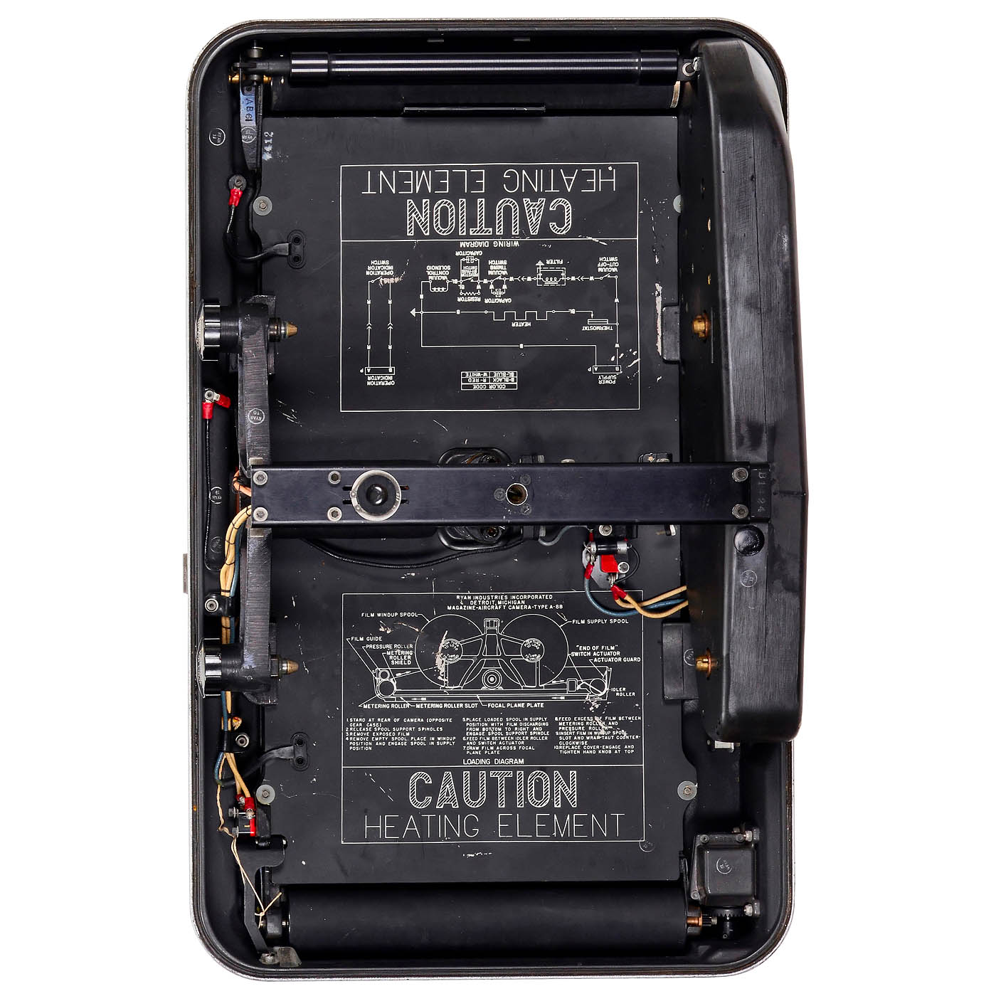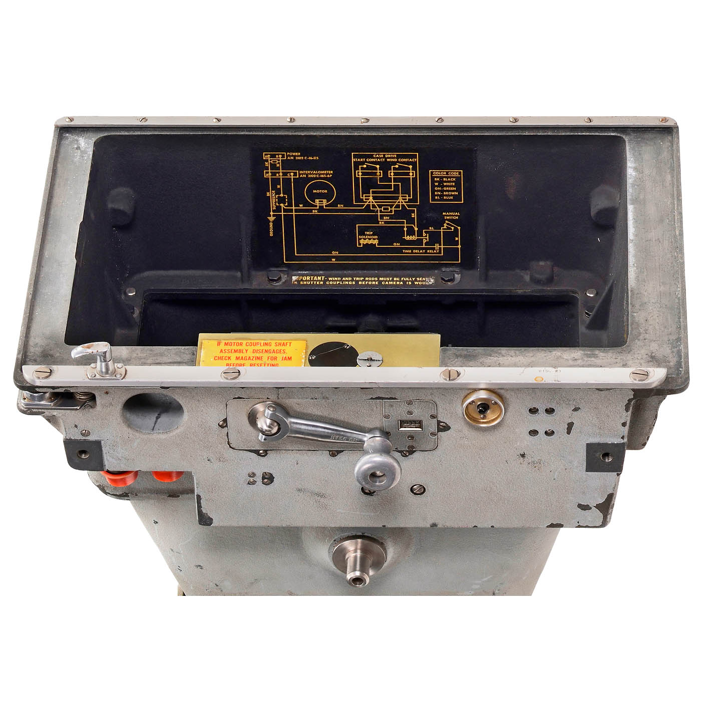 Fairchild Camera and Industry Corp., Syosset, N.Y. K-38 reconnaissance camera, serial no. 54-492, for 23 x 46 cm on aerial film, consisting of camera body, cone with lens, and film magazine. Mechanism and lens are in correct working order. Electrical components are untested (28 V/6 A). Dimensions with magazine: 100 x 54 x 35 cm. Camera: The shutter cocking mechanism (crank) and release, as well as the optical shutter, function (the loud bang is original). Camera counter reads 09329. Optical cone: "Lens Cone 36 inch for K-38 Camera", with Bell & Howell, Chicago Type I 8/36 inch (923 mm) Telephoto lens, serial no. 3207, yellow dot for coating, movable aperture, testing with a point light not possible, but front and rear lens groups clean when illuminated with a point light. Magazine: Ryan Industries Inc., Detroit. Magazine Film Aircraft Camera Type A-8B MIL-M-1421 B, serial no. AF-53-4327, film suction plate with heating element, both rubber rollers clean and grippy. – Camera was in active use, clear signs of wear; this type of camera is also said to have been on board U-2 flights (U-2 still in service until 2022, for example over Ukraine). An impressive exhibit for any aviation and military museum – as for aerial reconnaissance, the aircraft were built around the cameras, not the other way around!