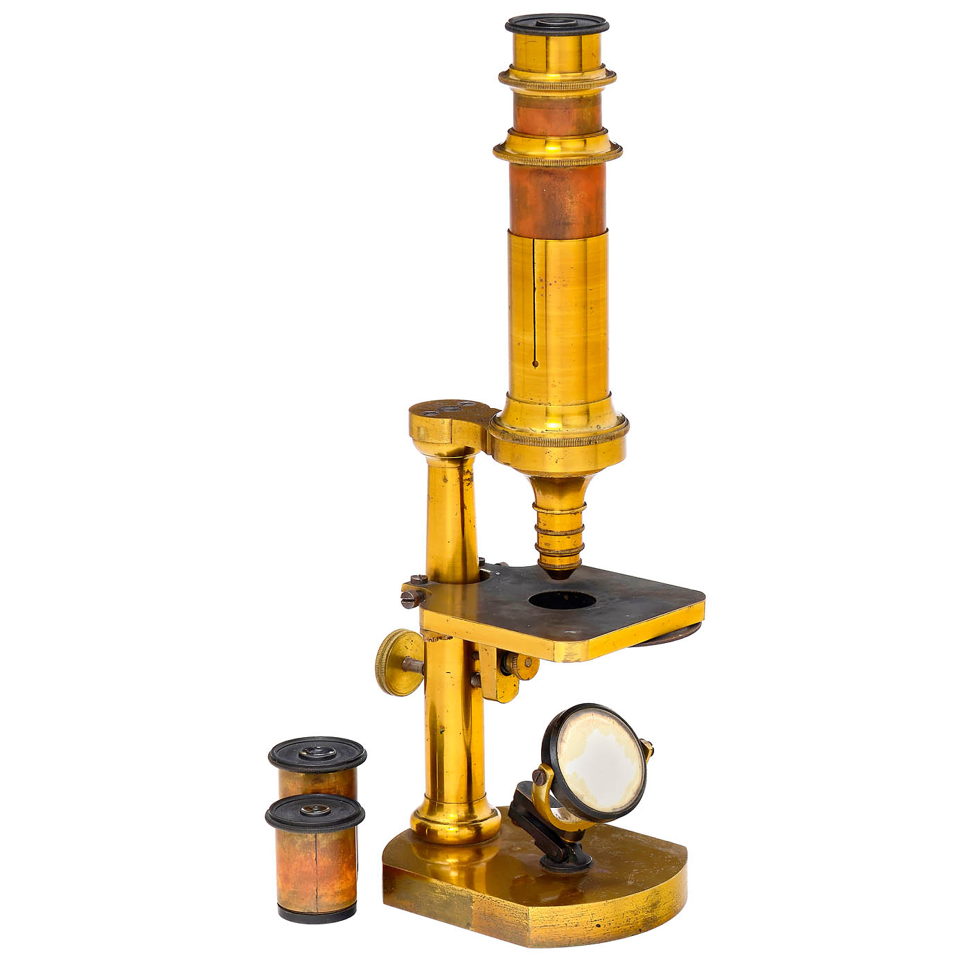 Signed on the column "Schiek in Berlin No. 1212", original lacquered brass, 3 eyepieces (nos. 0, 1 and 2), one combination objective lens (no. 4), coarse adjustment by moving the tube, fine adjustment by asymmetrical tilting of the stage with the knurled screw on the column, pinhole aperture disc under the stage, multi-element double mirror on the base, 2 horn specimen holders (slightly damaged), height 10 ? in., in fitted mahogany case lined with brown velvet. – A rare microscope from a renowned Berlin manufacturer.