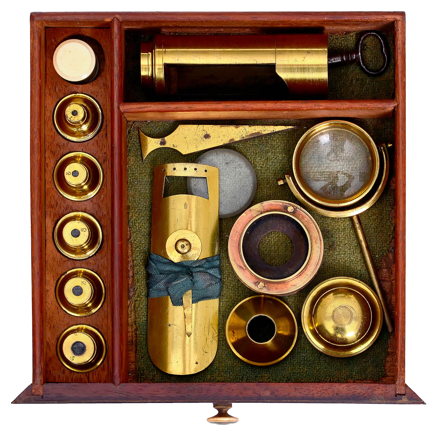 Original lacquered brass, 3 scrolled legs, separately-mounted concave mirror, rack-and-pinion coarse focusing to the tube, 1 screw-in eyepiece, 5 numbered objectives (all with lenses), on mahogany base with drawer, with reflected-light magnifier, Bonnani stage, fish plate, table condenser, Lieberkühn with silver mirror in a brass box, tube extension, tweezers, bone box for mica plates, total height 15 in., in matching pyramid-shaped mahogany case.