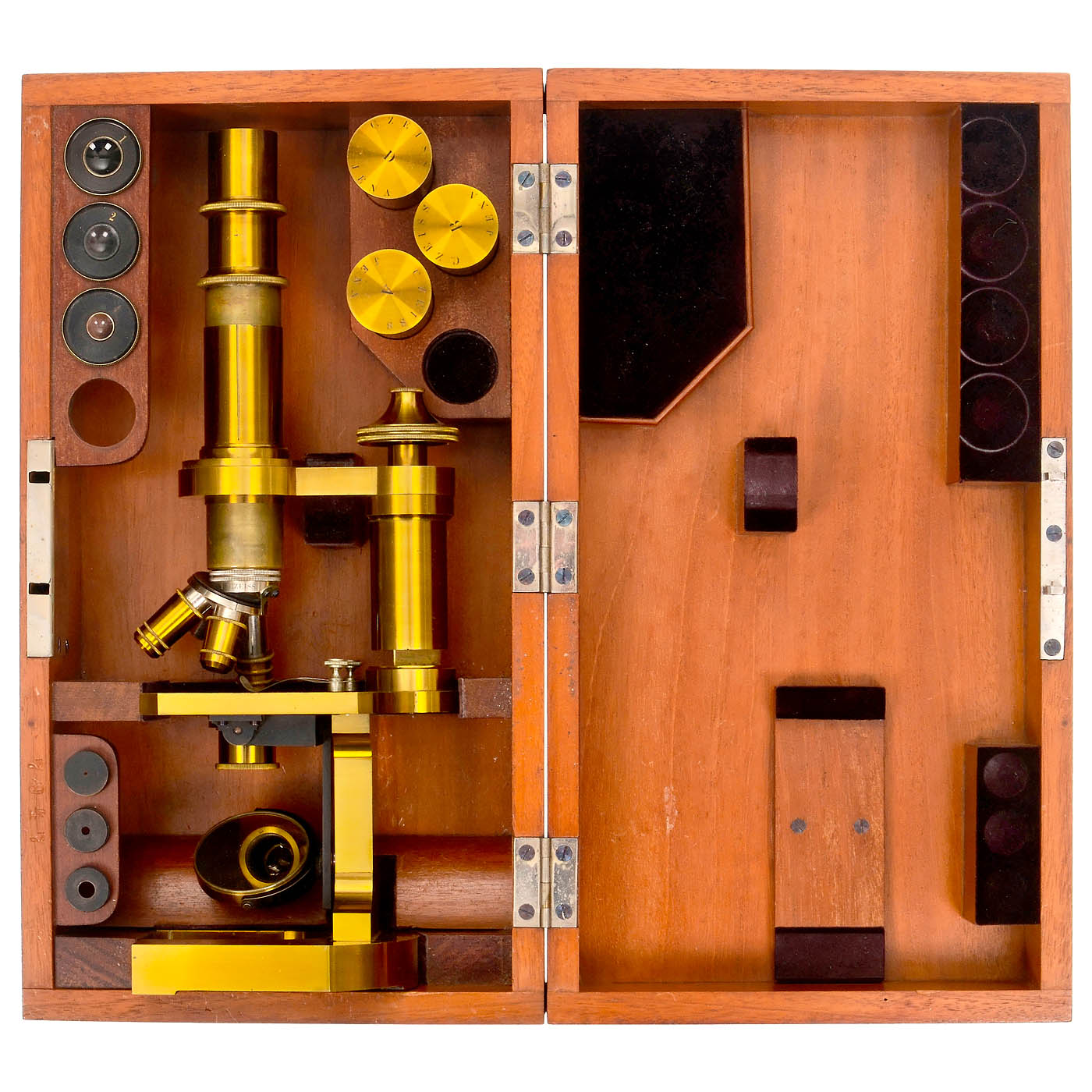 No. 7947, signed on the tube holder "C. Zeiss Jena", original lacquered brass, horseshoe base model Vb, draw-tube coarse adjustment, fine adjustment with knurled screw on the column, the double-mirror can be swiveled over the table, 3 signed lenses (A, B and D) in 3 brass boxes, also signed, 3 signed eyepieces (1, 2 and 4), signed triple-revolver, condenser sleeve in dovetail guide under the table, with 3 aperture inserts, height 12?? in., in matching mahogany case with identical serial number. – This microscope was delivered to Kristiania (now Oslo) on 23 October 1884. The recipient was zoologist Birgitte Esmark (1841–1897). In very good mechanical and optical condition.