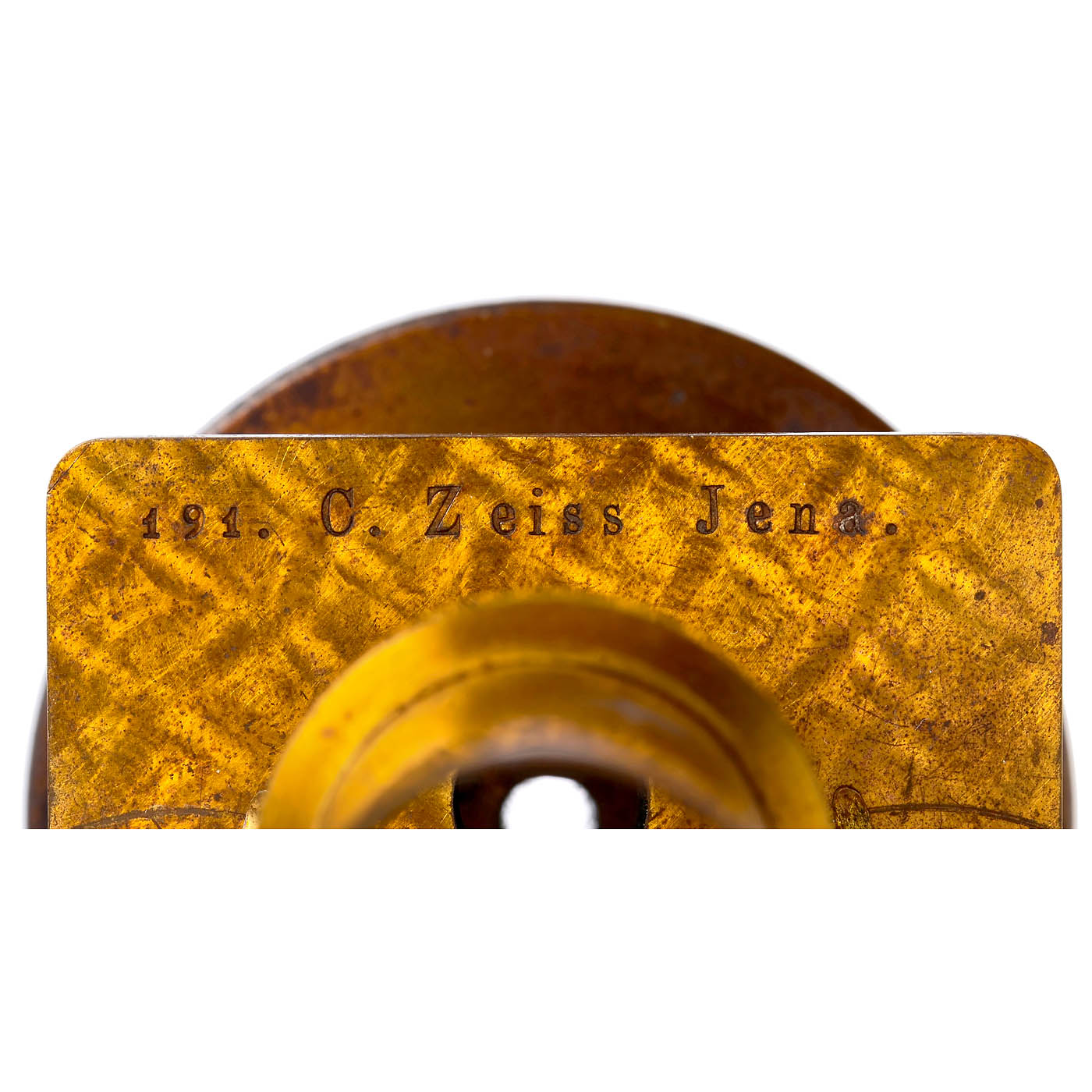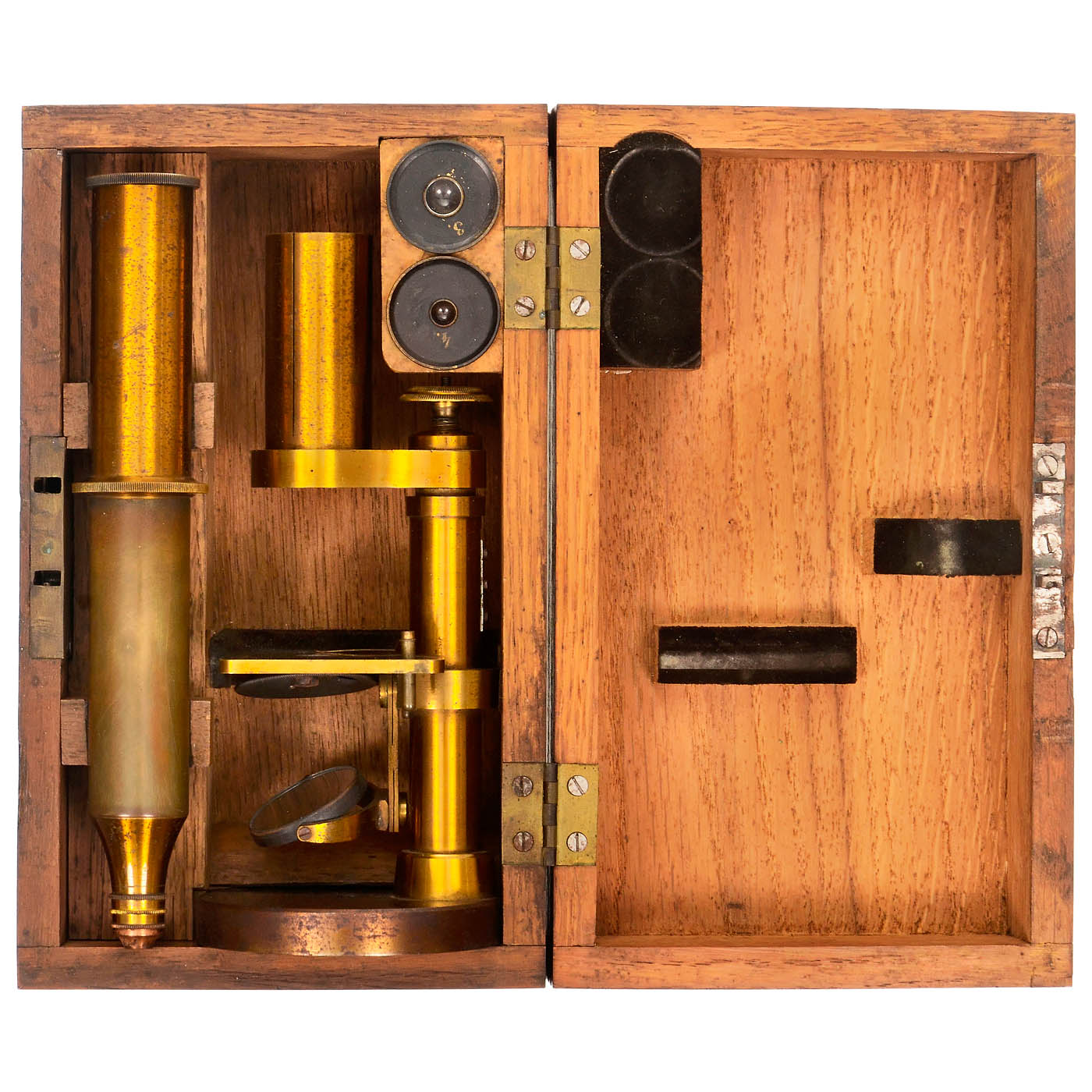 No. 191, stamped "C. Zeiss Jena" at the base, original lacquered brass, round stand model IV, single mirror, curved aperture disc under the table, objective lens C, sliding tube, fine adjustment with knurled screw on the column, eyepieces nos. 2, 3 and 4, height 11 in., in fitted oak case. This microscope was delivered to Mr Lingke in Freiberg on 8 October 1864. It is an extremely rare model and dates back to the time when simple and compound microscopes were numbered separately. All parts, including the object clips, are completely original! In good mechanical and optical condition.
