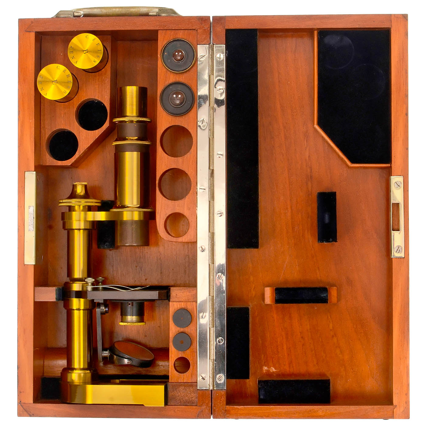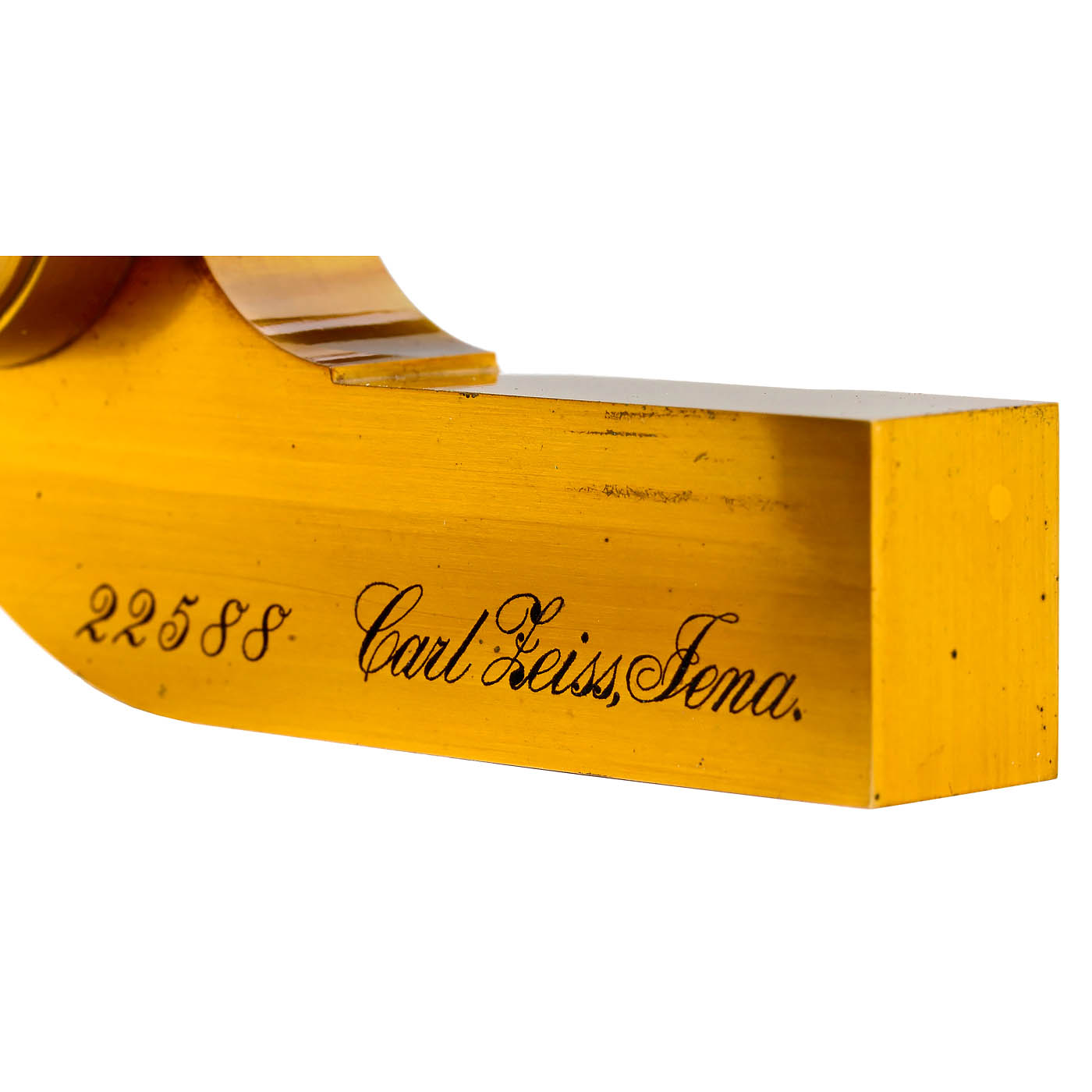 No. 22588, signed on the horseshoe base "Carl Zeiss Jena", original lacquered brass, base model VIIa, draw tube coarse adjustment, fine adjustment with knurled screw on the column, double-mirror, 2 signed lenses (B and E) in 2 brass containers, also signed, 2 signed eyepieces (2 and 3), condenser sleeve under the table, with 3 aperture inserts, height 11 in., in matching mahogany case, with lock and Zeiss (Z) key. – This microscope was delivered to Gand (Belgium) on 5 January 1894. The recipient was the L'Administration Comunale. – Mechanically and optically in near-mint condition.