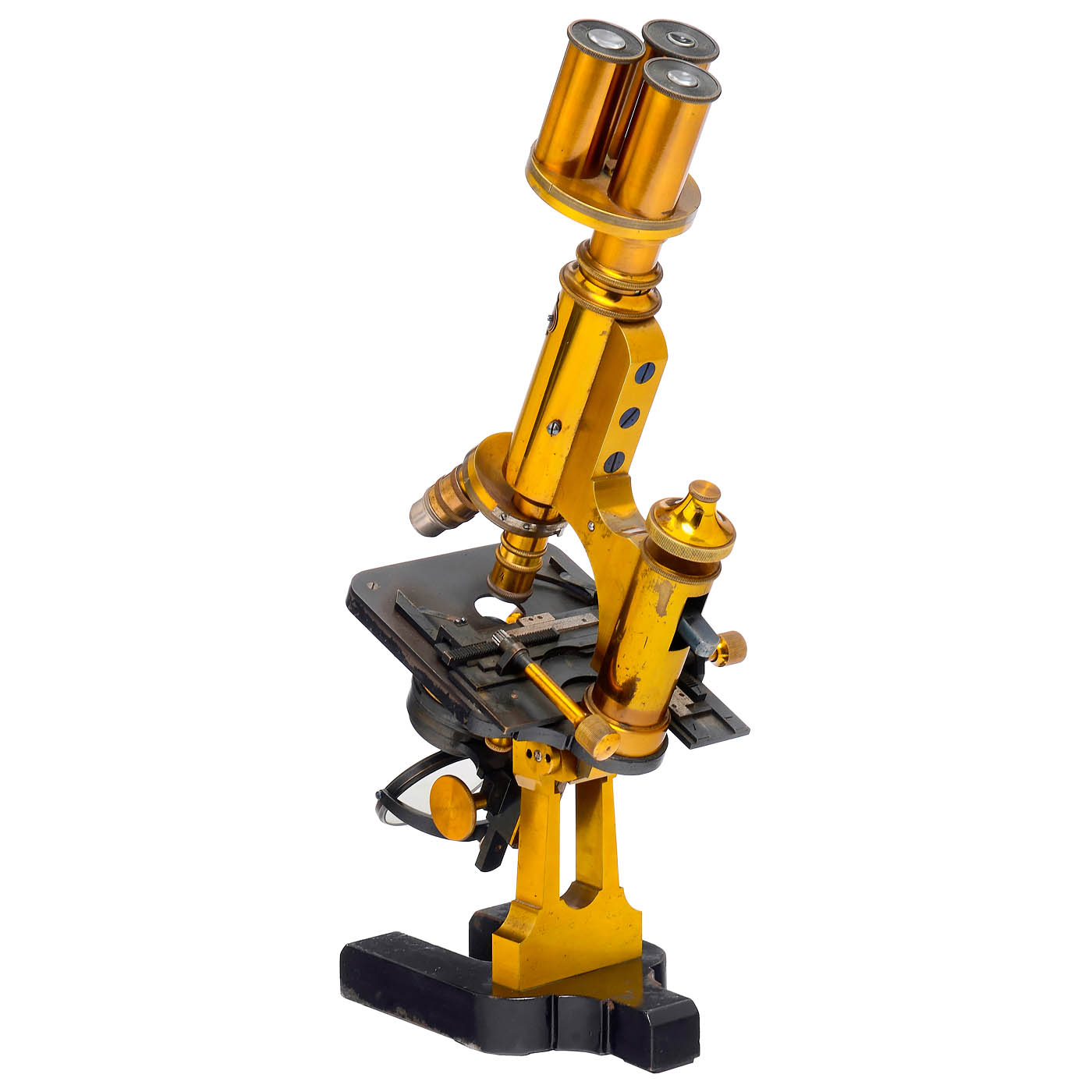 Signed on plaque on the tube "Ed. Messter, Berlin, N.W.", serial no. 31205, original lacquered brass, black-painted iron horseshoe base, triple eyepiece with the oculars no. 1, 3 and 4; triple nosepiece with 4, 7 and oil immersion objectives, micromillimetre-screw secures the fine adjustment, a lever under the micrometer-screw effects a raising or lowering of the tube, double mirror, condenser, adjustable iris diaphragm, and stage with ebonite cover, cross table, height closed 14 ? in. – A microscope of most unusual construction and size, very rare! With case.