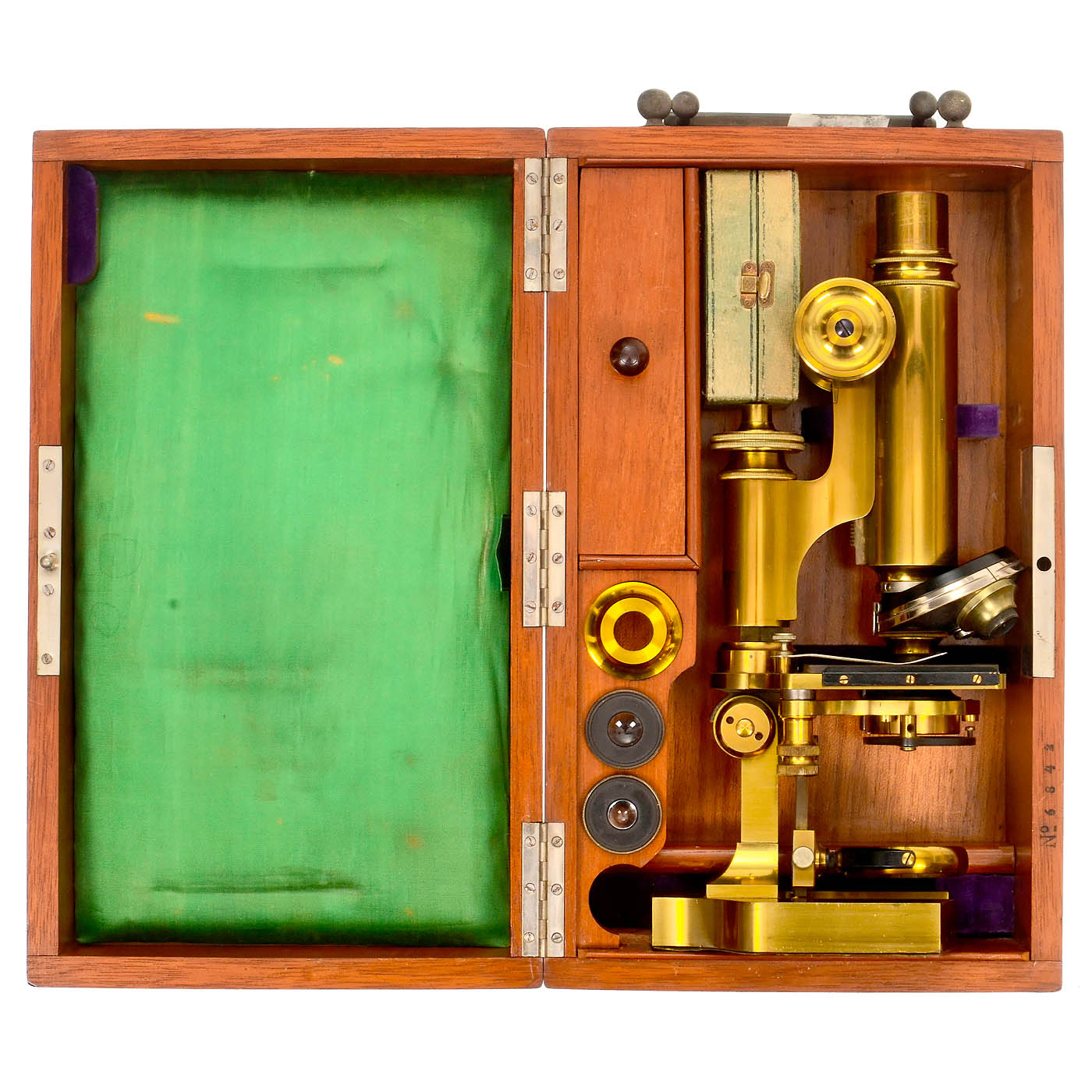 Signature on the base "C. Verick 43 rue des Ecoles Paris", original lacquered brass, 12 ? in. high, 3 numbered and signed objectives (nos. 2, 6 and 7) in a small leather case, triple revolver, 2 eyepieces (nos. 1 and 3), coarse and fine adjustment, tilting stand, removable and swiveling condenser, attractive case with the number "6842", in good mechanical and optical condition. – Constant Verick set up his own workshop in 1871 after working for Edmund Hartnack.