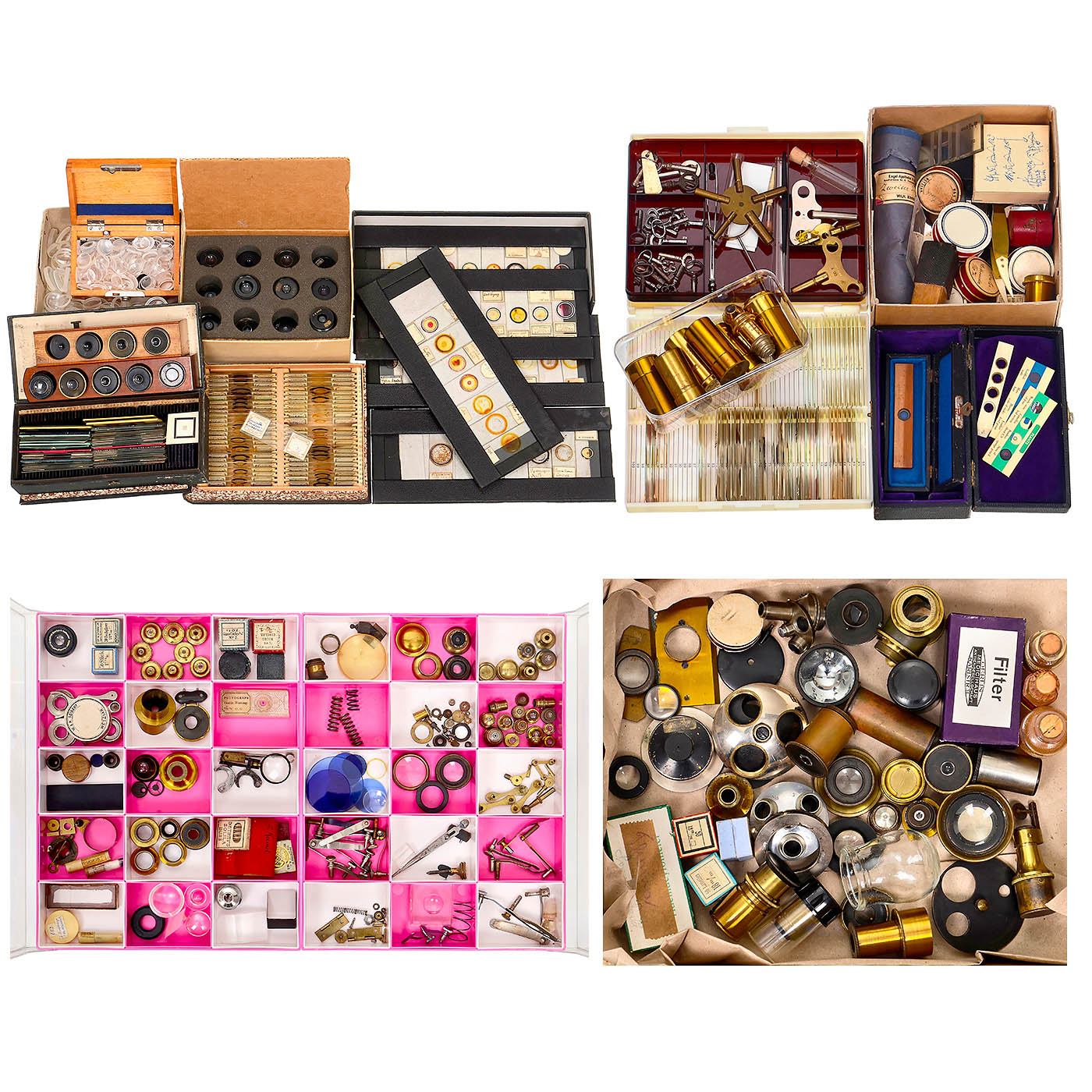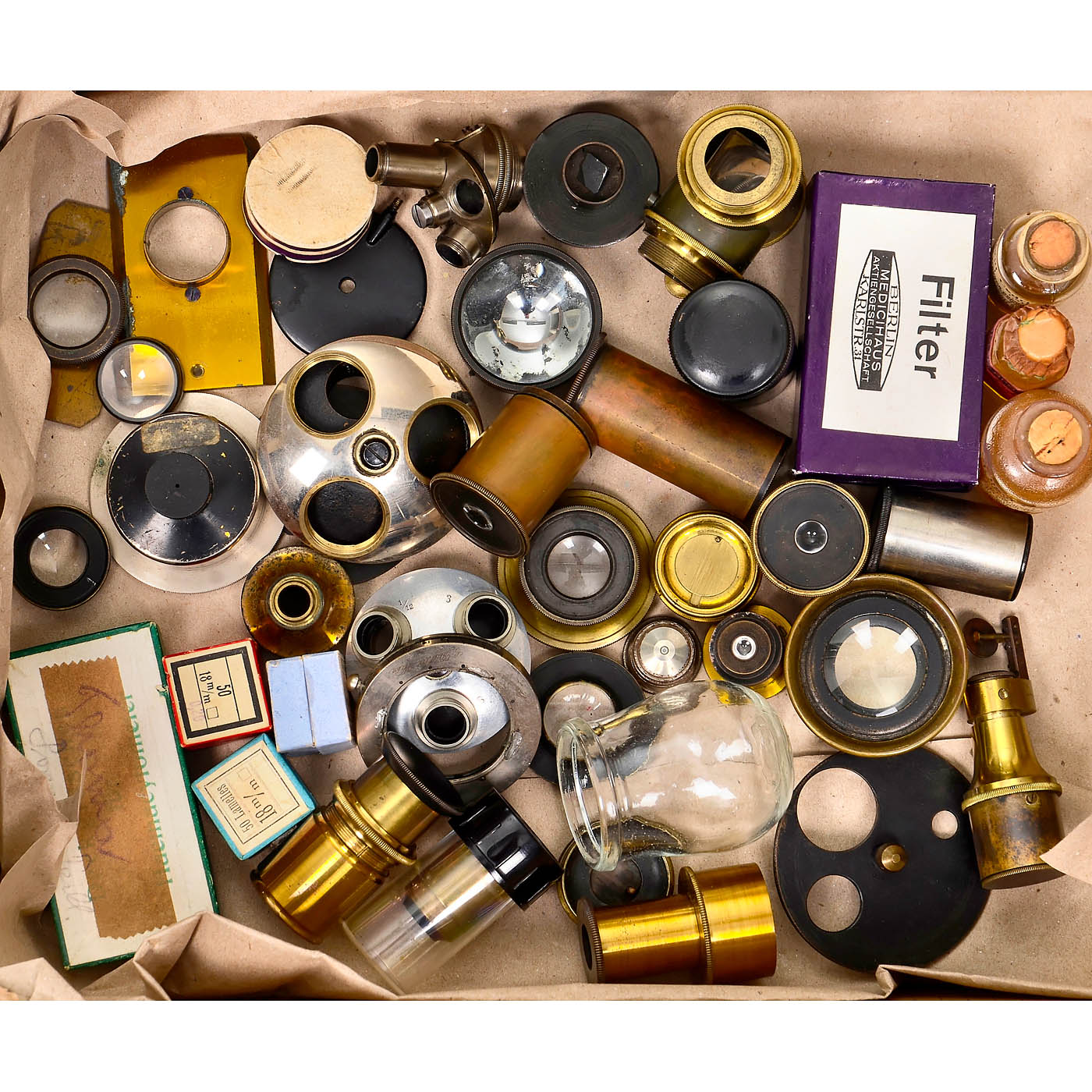 1) Microphotograph "Gentle Warning" by William Overend Geller (W.O.G.), c. 1855, glass on the right side broken, photograph undamaged. – 2) 35 early preparations, loose in cardboard box. – 3) Cardboard box with 5 trays, England, with 37 slides by "W.A. Rogerson" and others. – 4) Cardboard box in book form, c. 1900, containing 49 microscopic specimens by "Heinrich Boecker from Wetzlar". – 5) 50 recent microscopic specimens in plastic box. – 6) 25 eyepieces from Zeiss and other manufacturers. – 7) Approx. 300 lens blanks, various shapes and diameters. – 8) Lens Emil Busch Glyptar Anastigmat 3.5/3.5 cm. – 9) Approx. 50 objective lenses, mostly brass-framed, c. 1875–1920. – And: 10) Many more parts: Stage clamps, case keys, revolver nosepieces, mirrors, glasses, prisms and other.