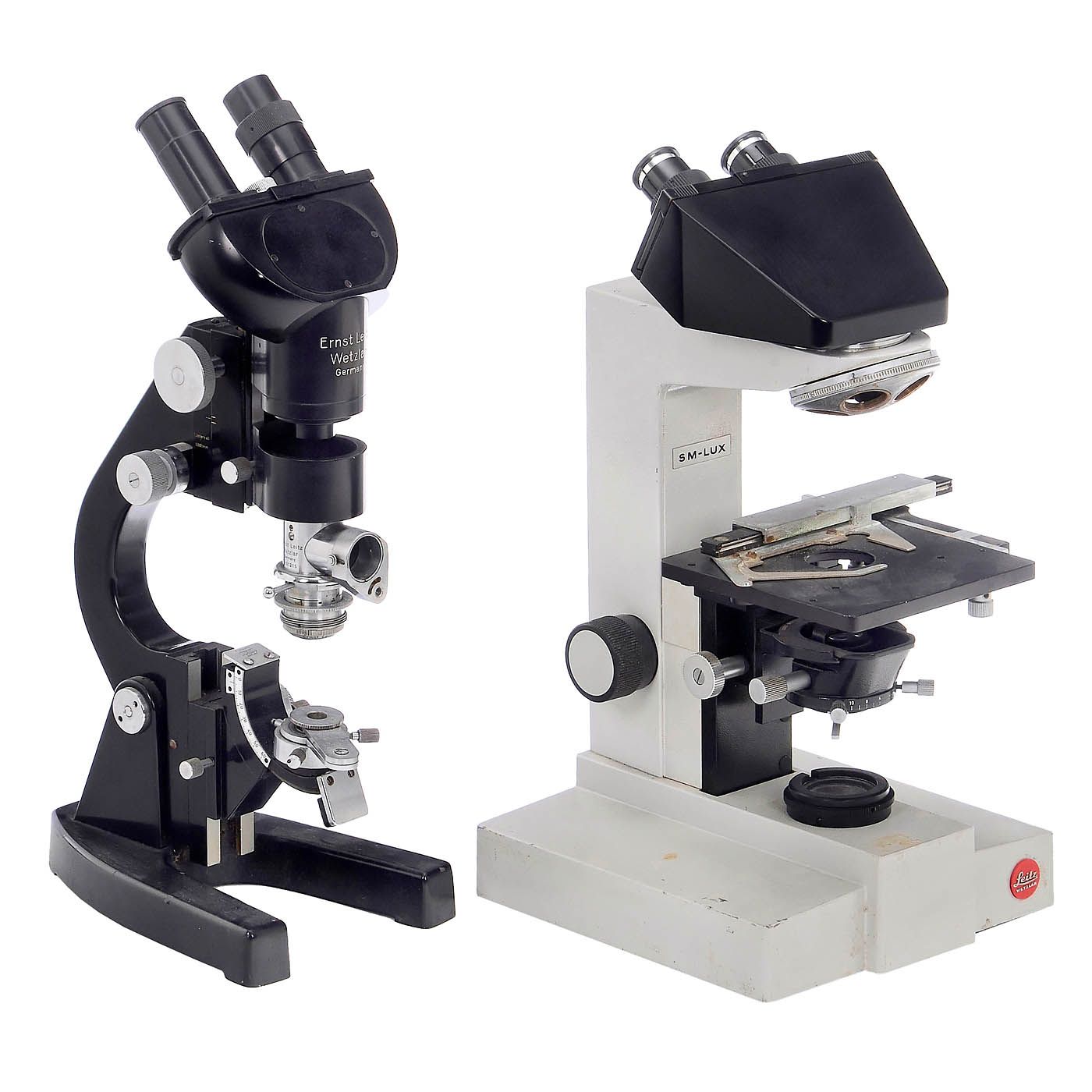 Wetzlar. 1) Laborlux SM, binocular microscope, no. 496227, 1956, electric illumination, condenser, rectangular stage, quadruple turret with objectives, binocular tube l.25x, height 36 cm. – 2) G-stand, c. 1960, no. 422219, triple turret, with heatable table, height 42 cm. – 3) SM-Lux, c. 1963, no. 635522, binocular tube, electric illumination, five-part turret, without objectives. – And: 4) Binocular re?ected-light microscope, c. 1957, no. 510972, without stage and illumination, height 45 cm.