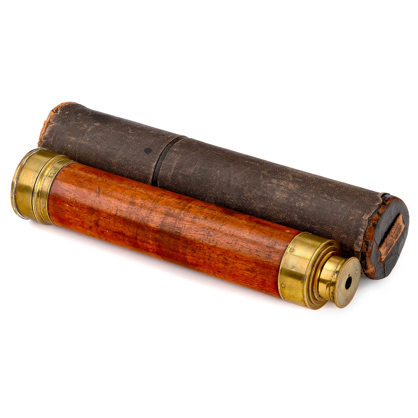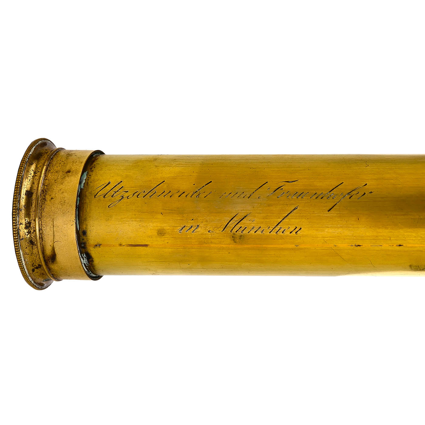 Signed on the first extension: "Utzschneider und Fraunhofer in München", clear lens, mahogany-covered tube (without cracks), later protection cap, length open 26 in., closed 9 in., with fabric-covered cardboard case.