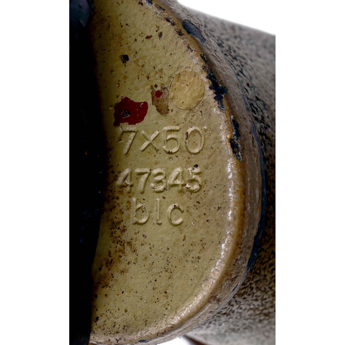 Marked "7 x 50 47345 blc" (with Zeiss code designation), height 8 ? in., rubber-armored aluminum housing, green rough lacquer finish, internal lens adjustment (waterproof), side-swiveling rubber protection on the eyepieces, rubber protection also on the housing cover and lenses, screwed-in desiccant cartridges; with original bakelite rain cover held in place by an elastic band ("user cap"), same device as in Hans Seeger: "Milit?rische Ferngl?ser und Fernrohre" (Military Binoculars and Telescopes), p. 376 and p. 378 (fig. 255 left); good external condition with relatively few signs of use, one front lens with flaw in the cement, with leather strap; a very rare piece!