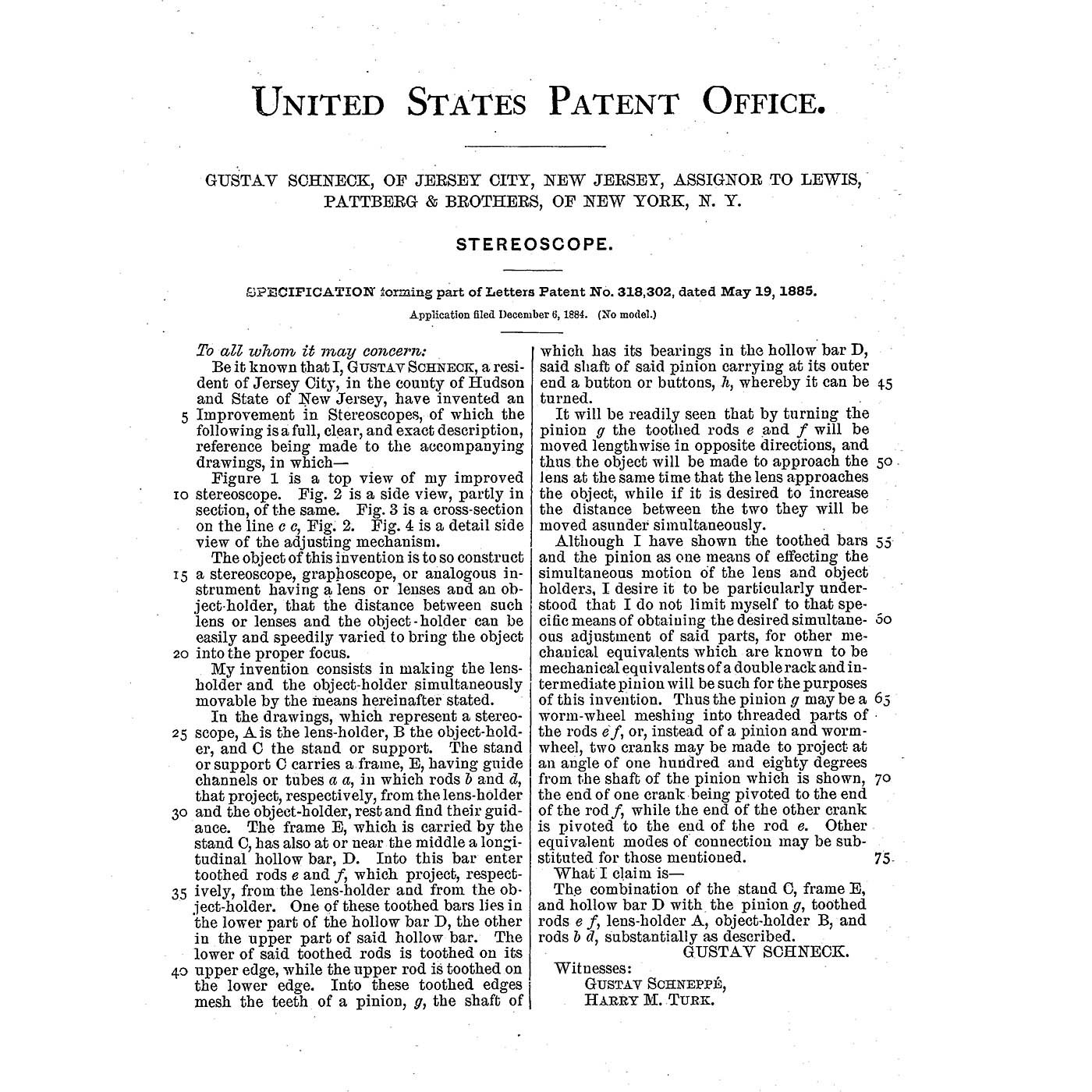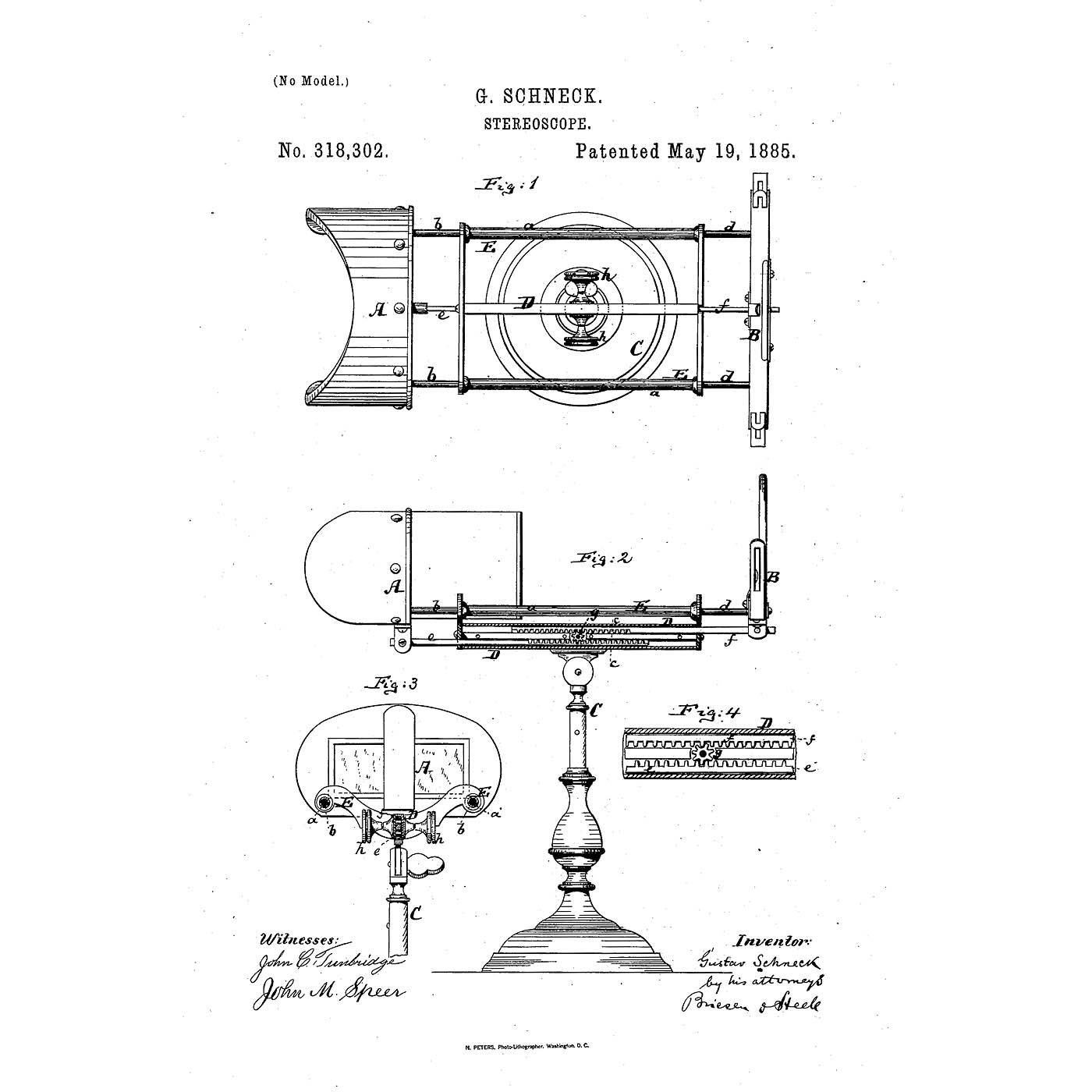 Gustav Schneck, USA. Patent no. 318302, stamped patent date 19 May 1885, the patent relates to focusing with a rack-and-pinion drive to the lens holder and object holder, a unique process for Holmes-type stereo viewers, for stereo cards 9 x 18 cm, nickel-plated metal body, base and eyecups covered with velvet, total height 13 1/3 in., with one stereo card "The Statues of Thebes", in very good working order, original condition, very rare, we are only aware of one other example.