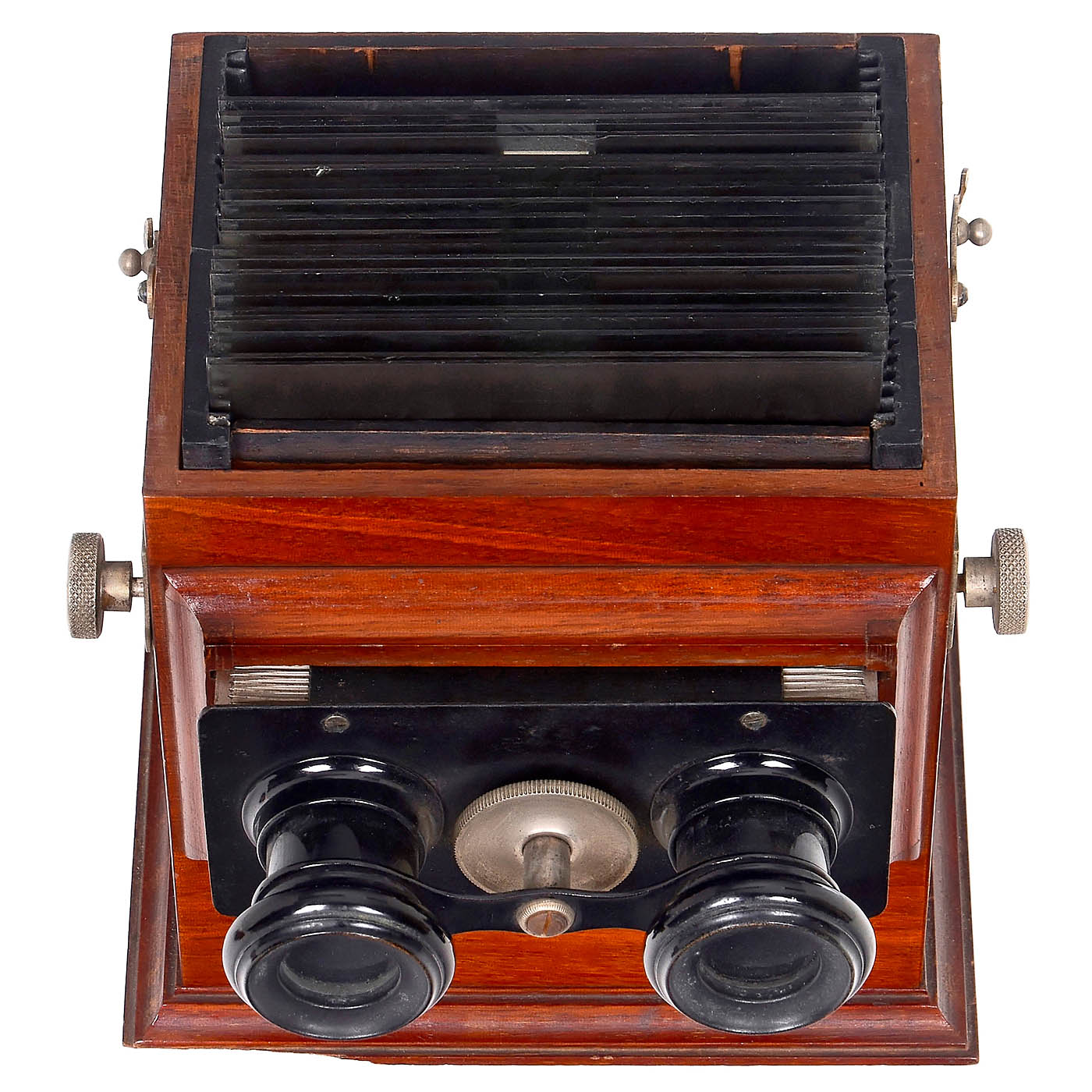 Small French stereoscope for 45 x 107 mm glass slides, patented 23rd Feb. 1907 by Lucien Bize and Simeon-Louis Claparède, magazine for 24 slides, focusing lenses, tropical hardwood cabinet, size only 6 x 4 ? x 7 in., base with small split. With 24 glass stereo images, mainly children's motifs. The smallest known table stereo viewer.