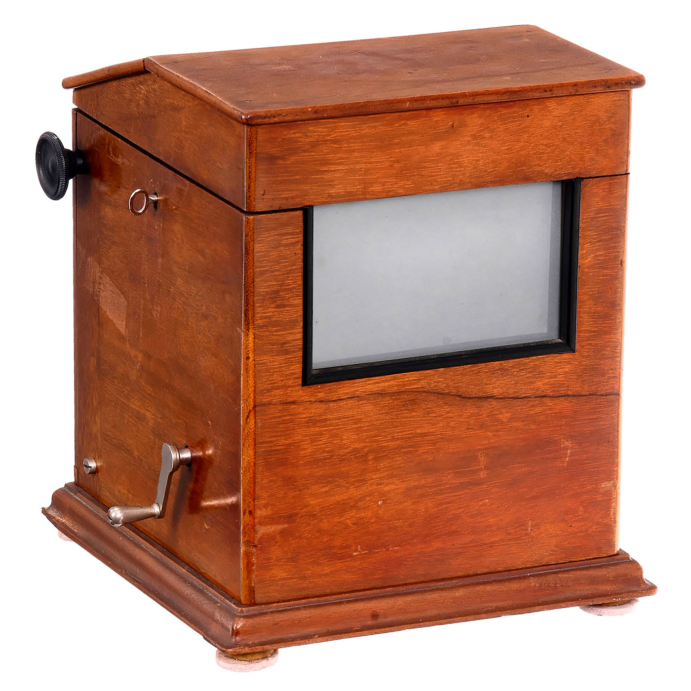 Jules Richard, Paris. Serial stereo viewer for 45 x 107 mm glass slides in magazines, serial no. 12062, rack-and-pinion focusing, inter-ocular adjustment, image counter. The image title can be displayed using external controls. With this model, the stereo slides can be moved in both directions. Precious wood case, dimensions: 9 x 9 ? x 10 in., with 25 stereo slides in one magazine: Algerian population in traditional clothing, village and city views, military with long weapons and members of the French colonial minority in formal attire. – Very good working condition, high-quality images, a very interesting documentation of French colonial history.