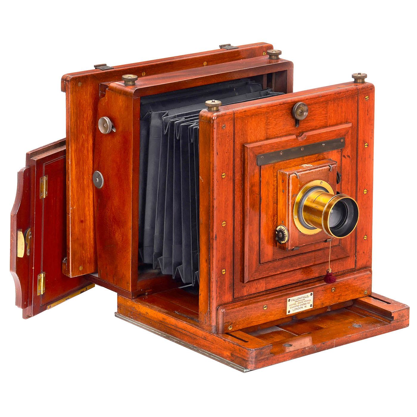 Fallowfield, Manufacturer, London. For full 16 x 21 cm plates, compact studio camera, suitable for travel photographers, adjustable front standard, extension via rear crank, swiveling and rotating back, with multiplier device, swing-in focusing screen 215 x 215 mm and matching good, light-tight studio cassette, interchangeable plate with Thornton Pickard shutter, working, brass lens E. Fran?ais Paris Rectilinéaire Serie A No. 3bis 9/27 cm no. 17392, glass clean, set up for Waterhouse stop, illuminates the format, camera dimensions: 31 x 32 x 38 cm. Good user camera.