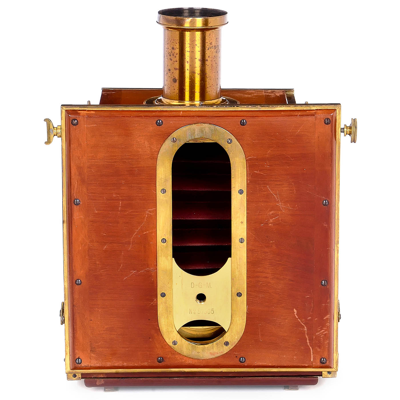 According to the consignor: Bentzin, G?rlitz, Germany. Serial no. 74, for 13 x 18 cm plates, burgundy-red bellows, abundant brass fittings, lens board slides laterally onto one of two crossbars (front for standard focal length, rear for wide-angle lenses from 5 cm), lens board tilts forward and backward, maximum extension 37 cm, removable back panel (easily detached by lifting slightly) and interchangeable for portrait and landscape formats, spring-loaded focusing screen, removable, D.-G.-M. no. 57307, with Steinheil Munich brass lens 8/28 cm, serial no. 9095, a sliding plate along the entire length of the baseboard allows for adjustment of the center of gravity for tripod mounting. Includes 5 original film holders for 13 x 18 cm plates. High-quality camera; unfortunately, this innovative design concept was not further developed after 1910.