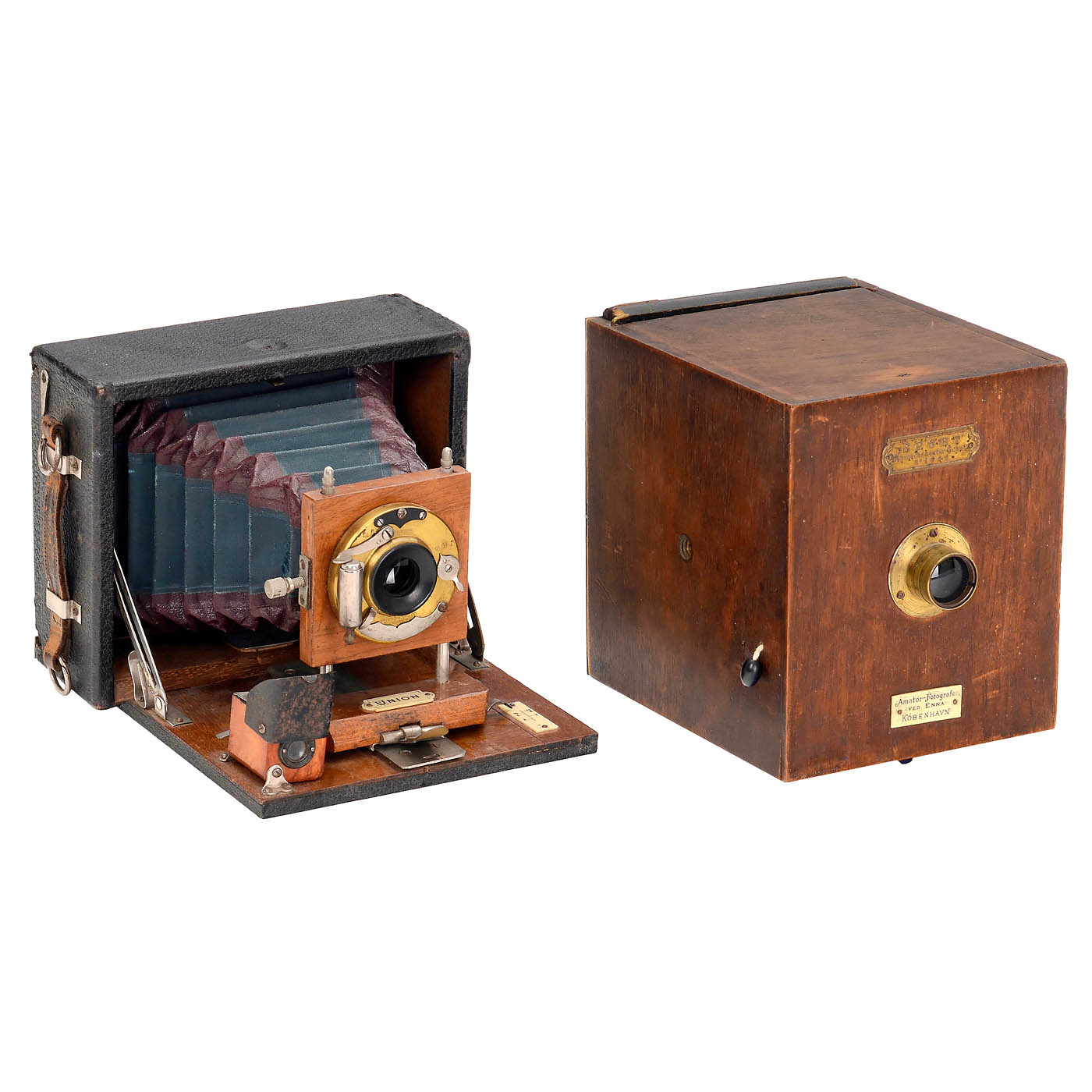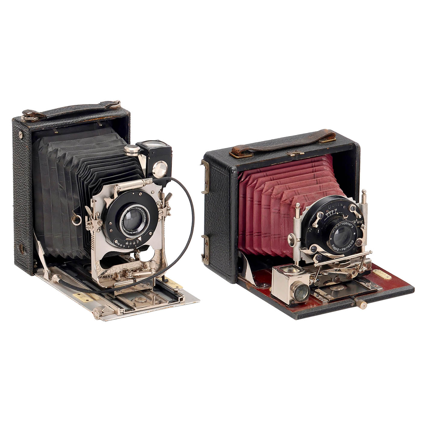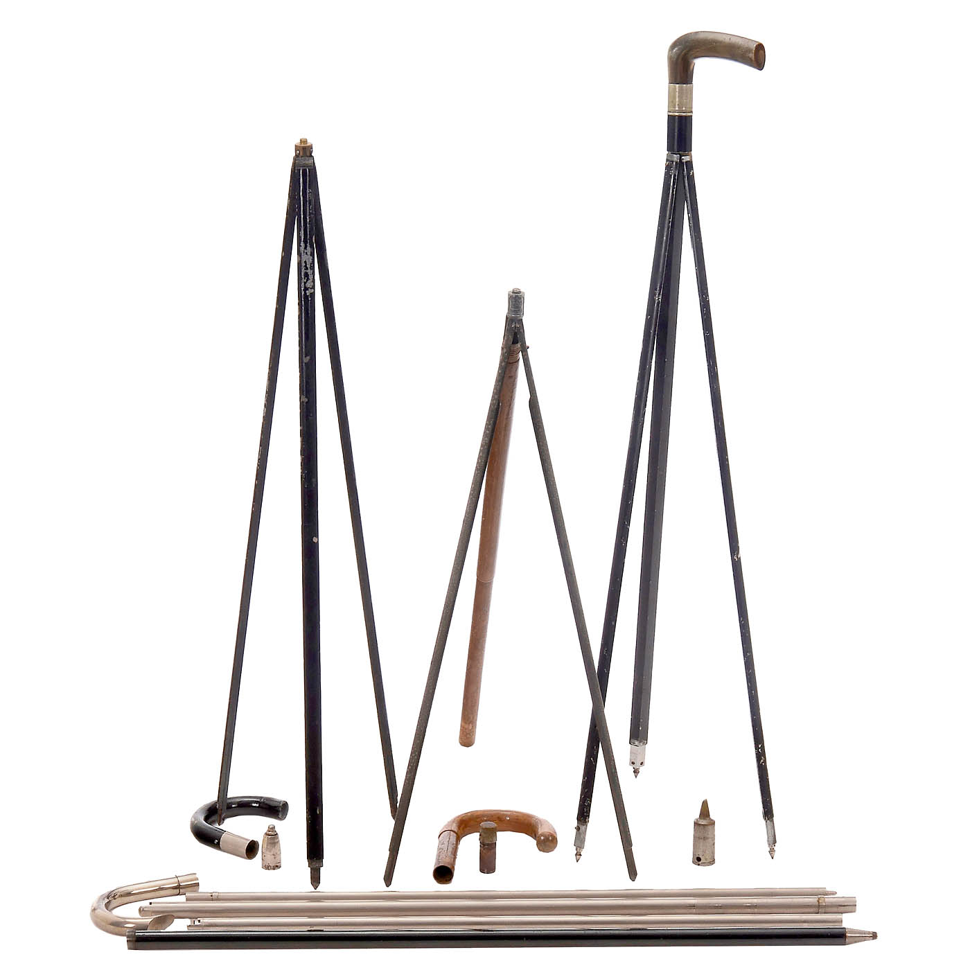 All cameras with focusing screen backs. 1–2) Tripods in the shape of walking sticks, 90 cm long, 2 variations, after unscrewing the handle and removing the base cap, legs with double extension. – 3) Jaki D.R.P., wooden handle and wooden sleeve, 87 cm long, inside a leg connected to the wood with 2 fold-out legs. – 4) Elegant walking stick, tube only 19 mm thick, 89 cm long, inside 5 nested tubes, function unknown, no space inside for further parts. – 5) Germany. Student camera 9 x 12 cm "Sport" Utility Model Protection No. 1500, centrifugal shutter still movable. (3-/4) – 6) Germany. Union, for 9 x 12 cm, fir wood interior, green bellows, brass shutter with achromatic lens. (3/3) – 7) Krügener, Frankfurt. "Periscop" camera No. 760, for 9 x 12 cm, red bellows, shutter running. (3+/3) – And: 8) Hüttig, Dresden. Nelson, for 9 x 12 cm, Helios 8/12.5 cm, shutter running. (3/3)