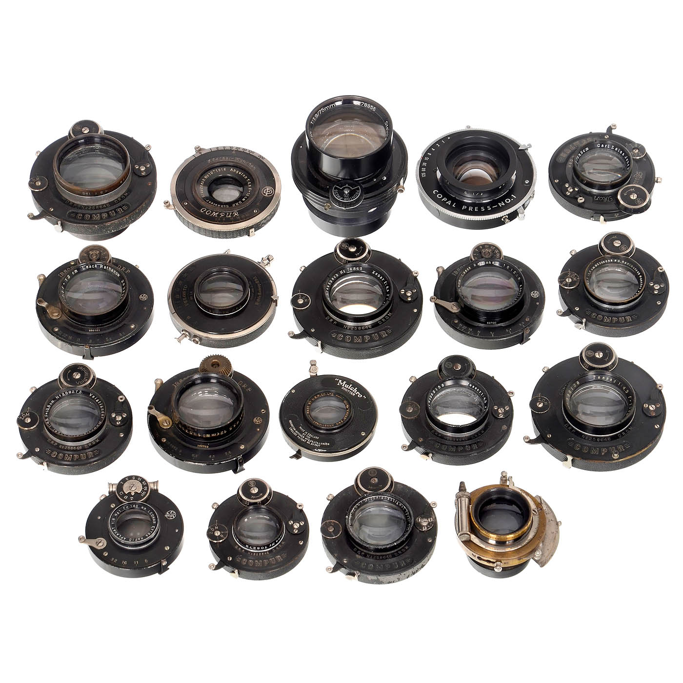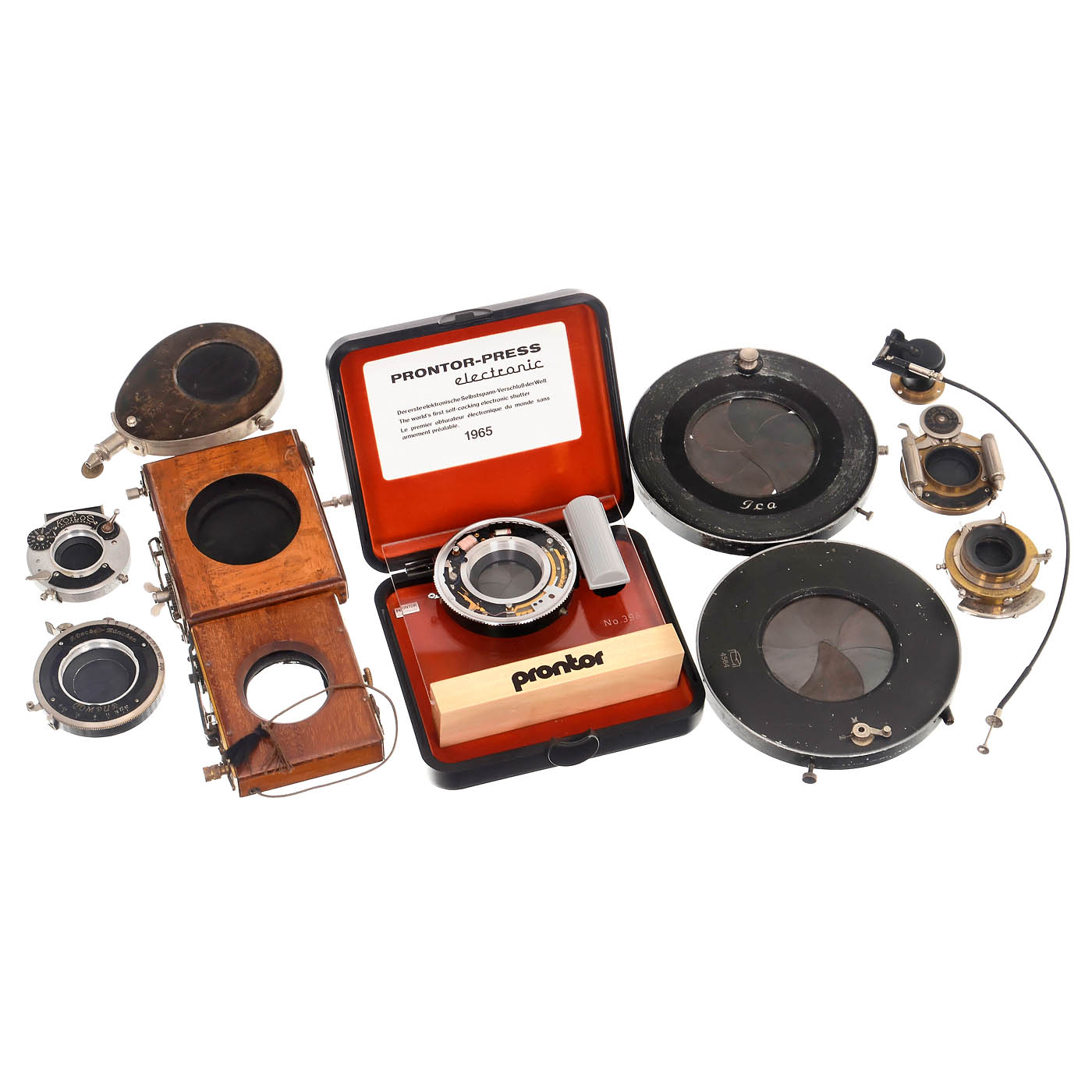 1–22) Collection of shutters, from the flap-shutter to H.I., Paris L’Express clip-on shutter and Koilos to the Prontor-Press electronic 1965, the world's first electronic self-cocking shutter, as a Plexiglas model with presentation box. – And: 23–40) Shutters with complete lenses c. 1910 to 1960, from the Angulon to the Tessar, almost all in good condition and functional when released, shutter speeds untested. (3/3)
