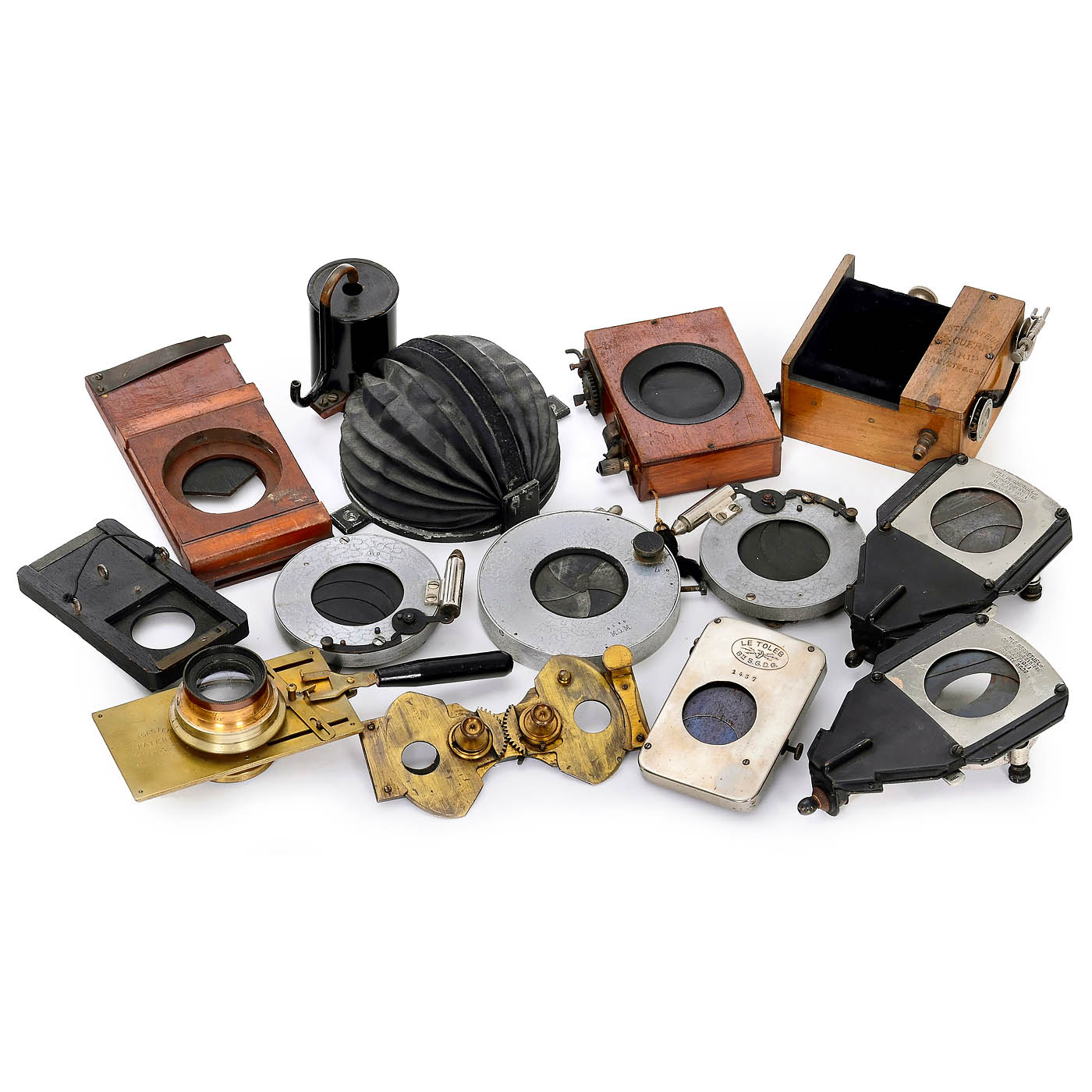 1–2) Gravity shutters using a falling shutter plate. – 3) Guerry-Paris leaf shutter. – 4–5) Mattioli "Le Perpetuel". Ideal for stereo photography. – 6) Mattioli "Le Toleb". – 7) Lancaster See Saw Shutter, with Lancaster Rectigraph lens. – 8–9) G.M. bayonet shutter, ideal for a stereo camera. – 10) Early brass stereo shutter, 75 mm focal length. – 11) Small Grundner shutter. – 12) MGM bayonet shutter. – And: 13) Thornton Pickard roller shutter.