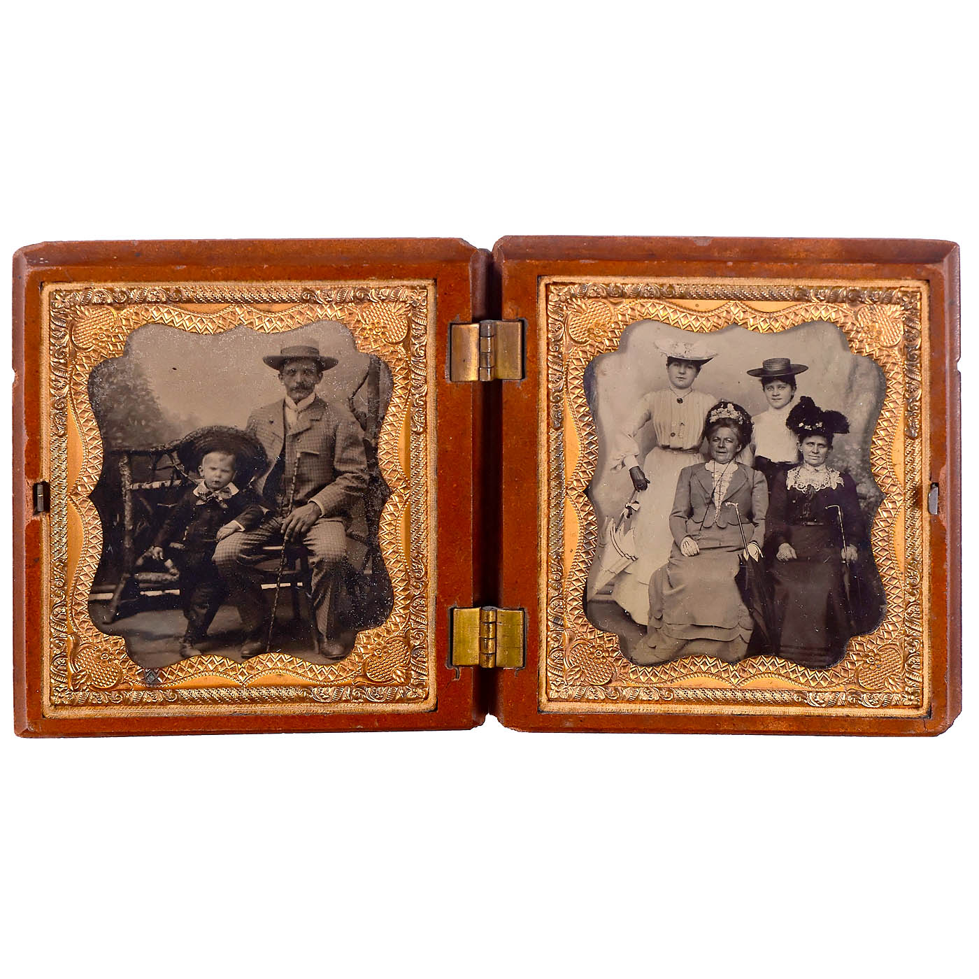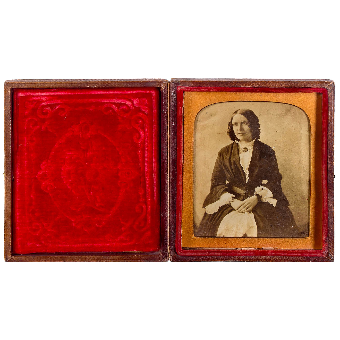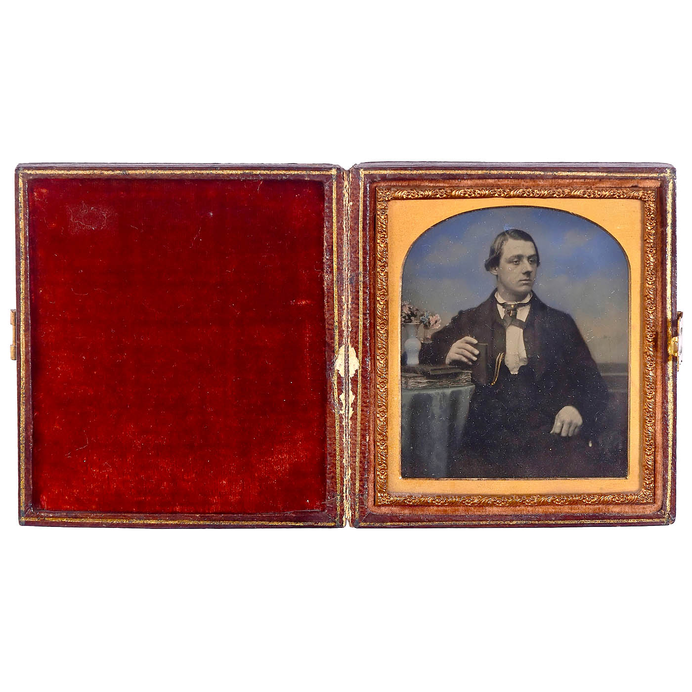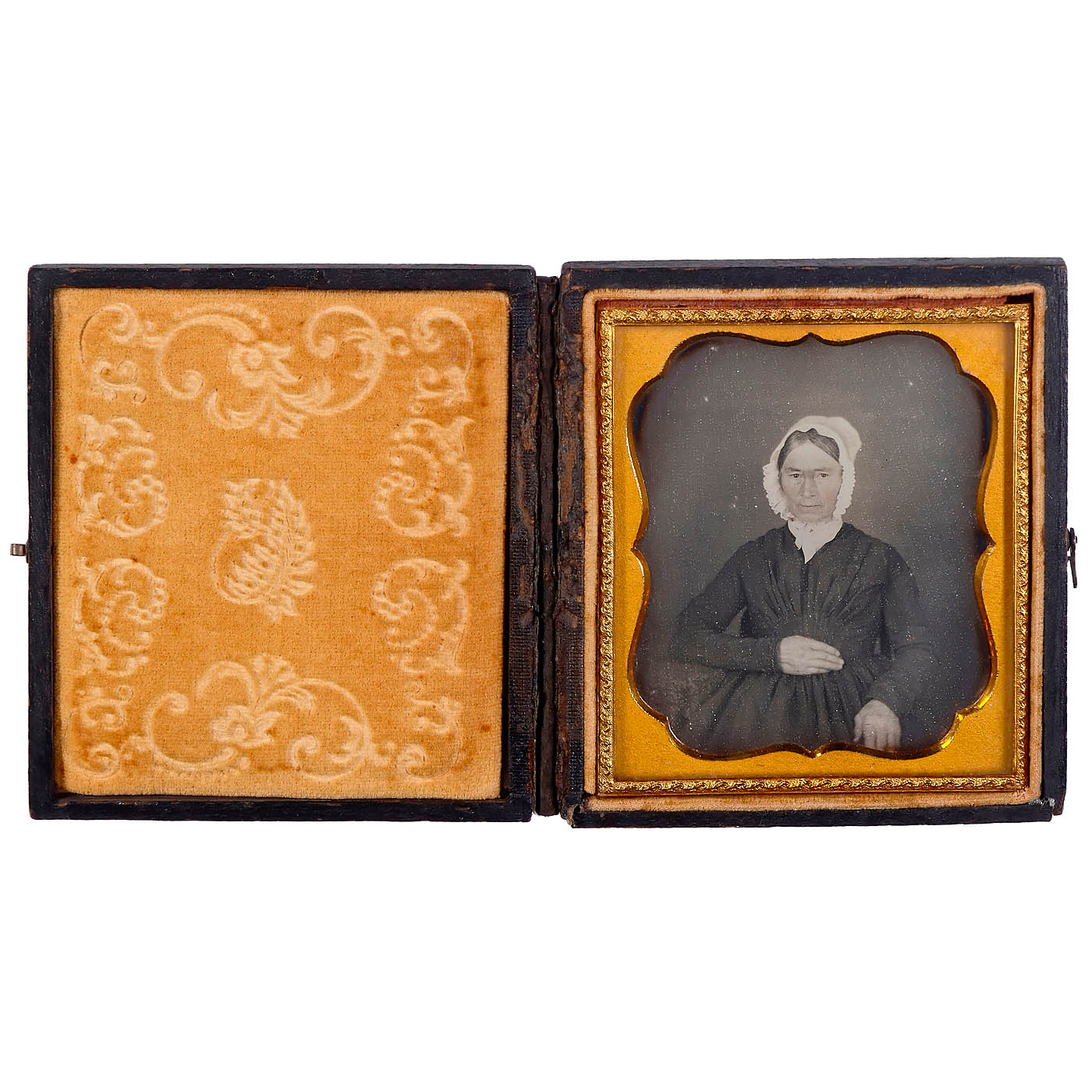 1) American daguerreotype, c. 1855. Anonymous, 1/9 plate in case, female portrait, face lightly colored, brass mount, case glued to the spine. (2–3/–) – 2) Professionally hand-colored ambrotype, c. 1850–60. Anonymous, 1/9 plate. Portrait of a gentleman, hand-colored and additionally gold-toned, brass mount, original case. Excellent professional work! (2/–) – 3) Union case with two tintypes, 1856 onwards. Anonymous, dimensions 6.5 x 8 cm each, presumably from the USA. Case labeled: "Genuine Union Case – S. Pack's Patent, 1854–1856". Union Case was the first process for producing plastic (bakelite). (3/–) – And: 4) Case with salted paper photograph, c. 1845–50. Anonymous, 6.5 x 8 cm, mounted on cardboard, portrait of a woman. The clasp on the case is missing. (3/–)