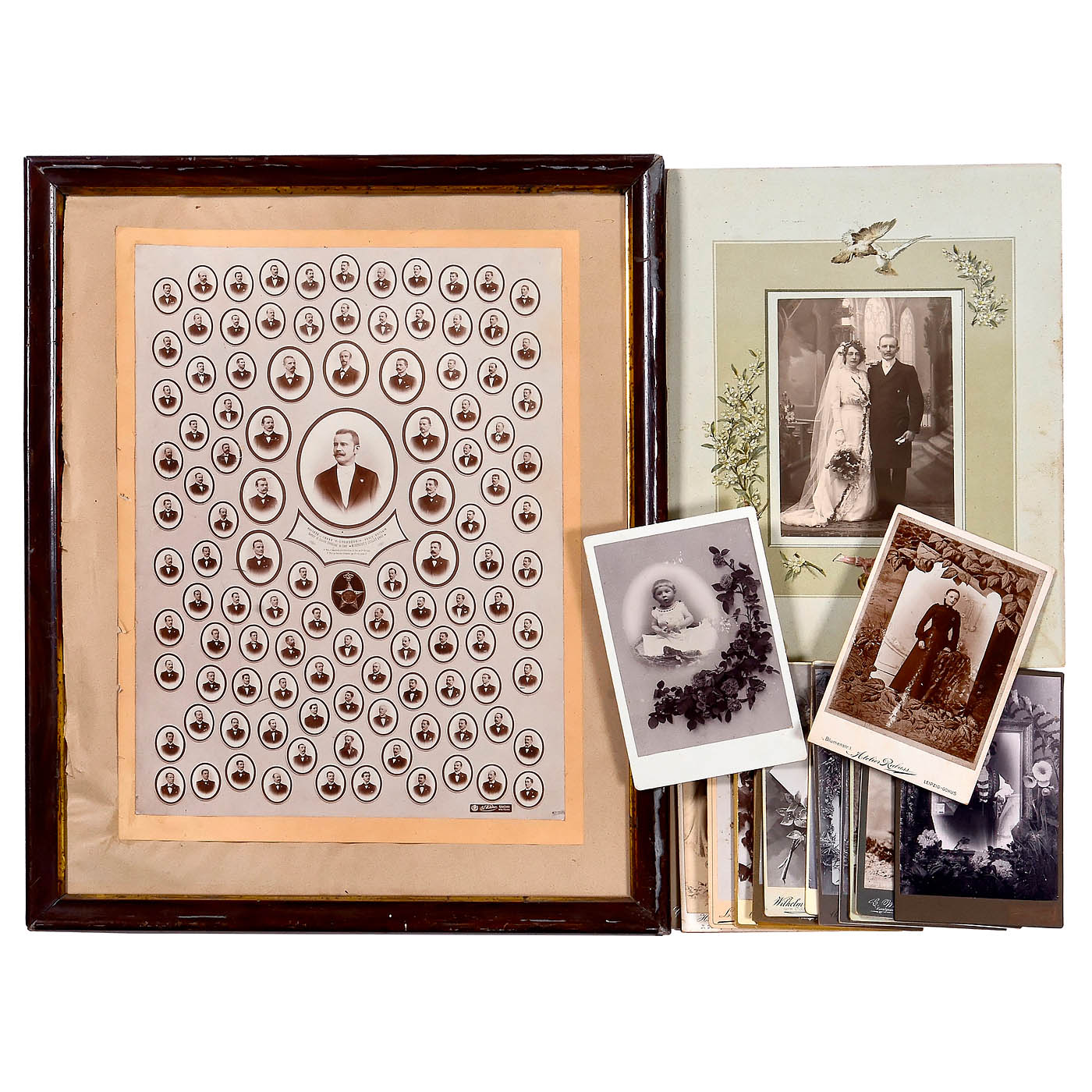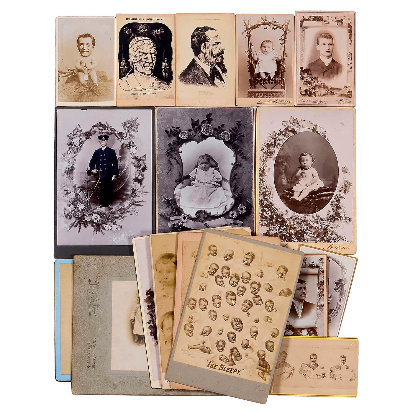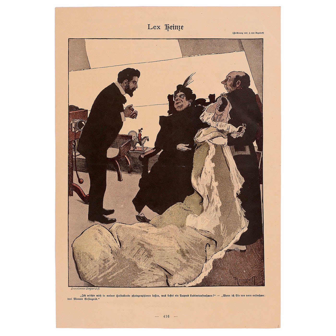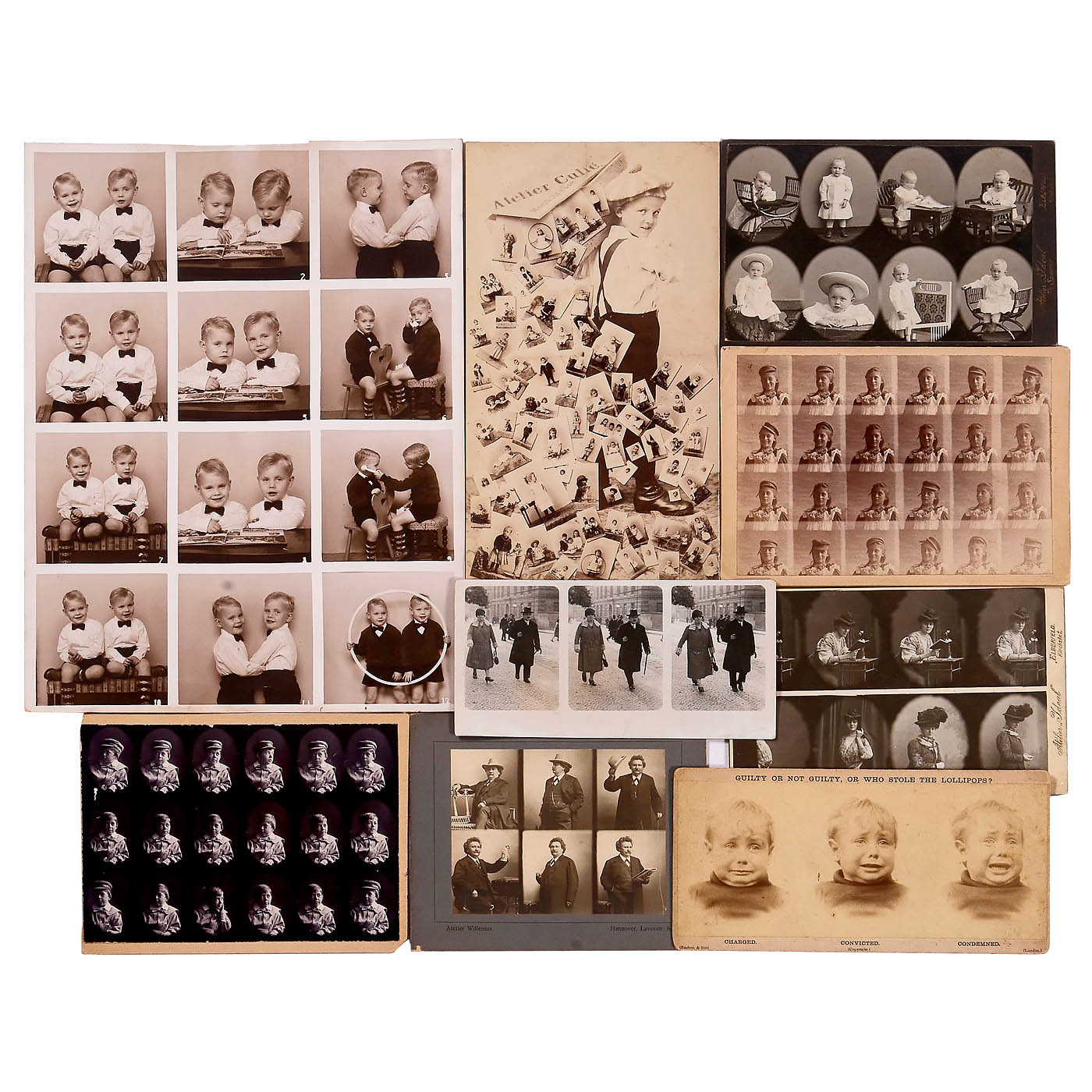 1) Multiple photography encompasses the series of images created during the portrait session, which are presented as a selection. It was rarely used, as the client was satisfied with this series of all shots, not with the "high-quality retouched image." This genre is extremely rare, with seven outstanding examples of museum quality. – 2) The obvious desire was to capture the different expressions of the same face, with seven examples. – 3) Based on the desire for photomontages of many people, the montage technique of "virtual photos" emerged, with 27 examples of up to 108 portraits in one image, in formats ranging from 27 x 37 cm to carte de visite. – 4) Critical montages or distortions, three cartes de visite (photography of the Magic Lantern, Galleria Fantasmagorica dei Lampione) of personalities of the time. – And: 5) The counter-reaction with Wilhelm II's initiative from 1892 onwards even permeated theater, and as a satire from the fourth year of Simplicissimus, the caricature by Lex Heinze (see Wikipedia) quoted: "I would like to be photographed in my court ball gown. How much will it cost...? – If I take the picture from the front: three months in prison." Today, this rule has been reintroduced in some countries. The caricature as a timeless document.