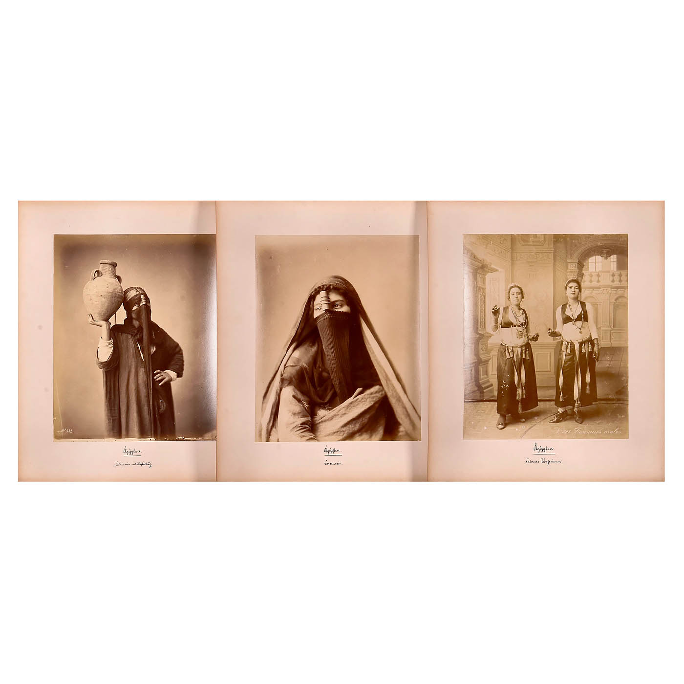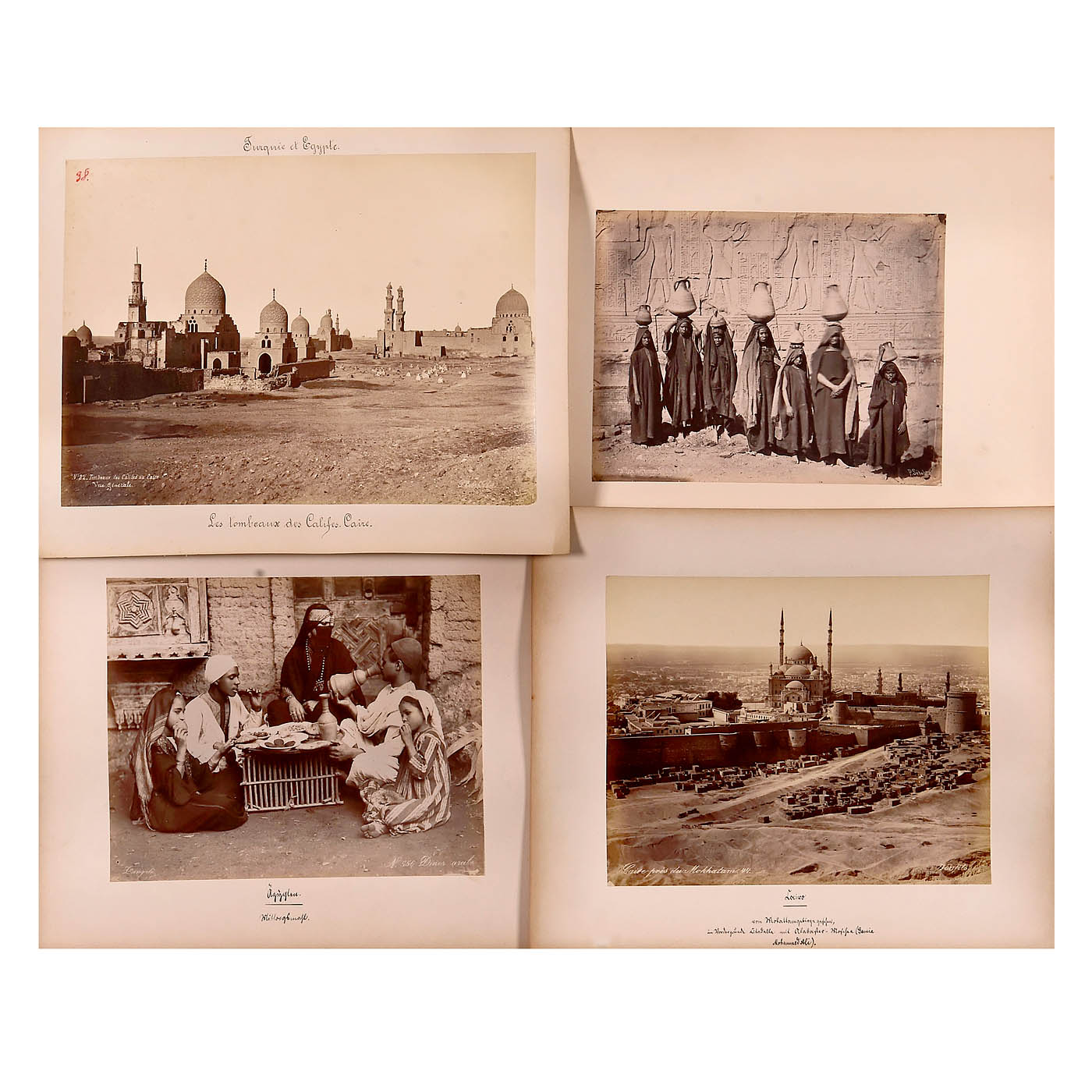 34 titled photographs of Egypt depicting its buildings, streets, squares, mosques, and inhabitants, all mounted on card stock ranging from 43 x 33 to 33 x 24 cm, in good condition. The set includes 6 photographs by Sebah, 3 by Bonfils, 4 by Zangaki, 1 by Beato, 1 by Lekegian, and 13 photographs without photographer attribution or with names that are difficult to read. Also included are 6 interesting ethnographic plates, each containing 4 images, including 11 images by Sebah.