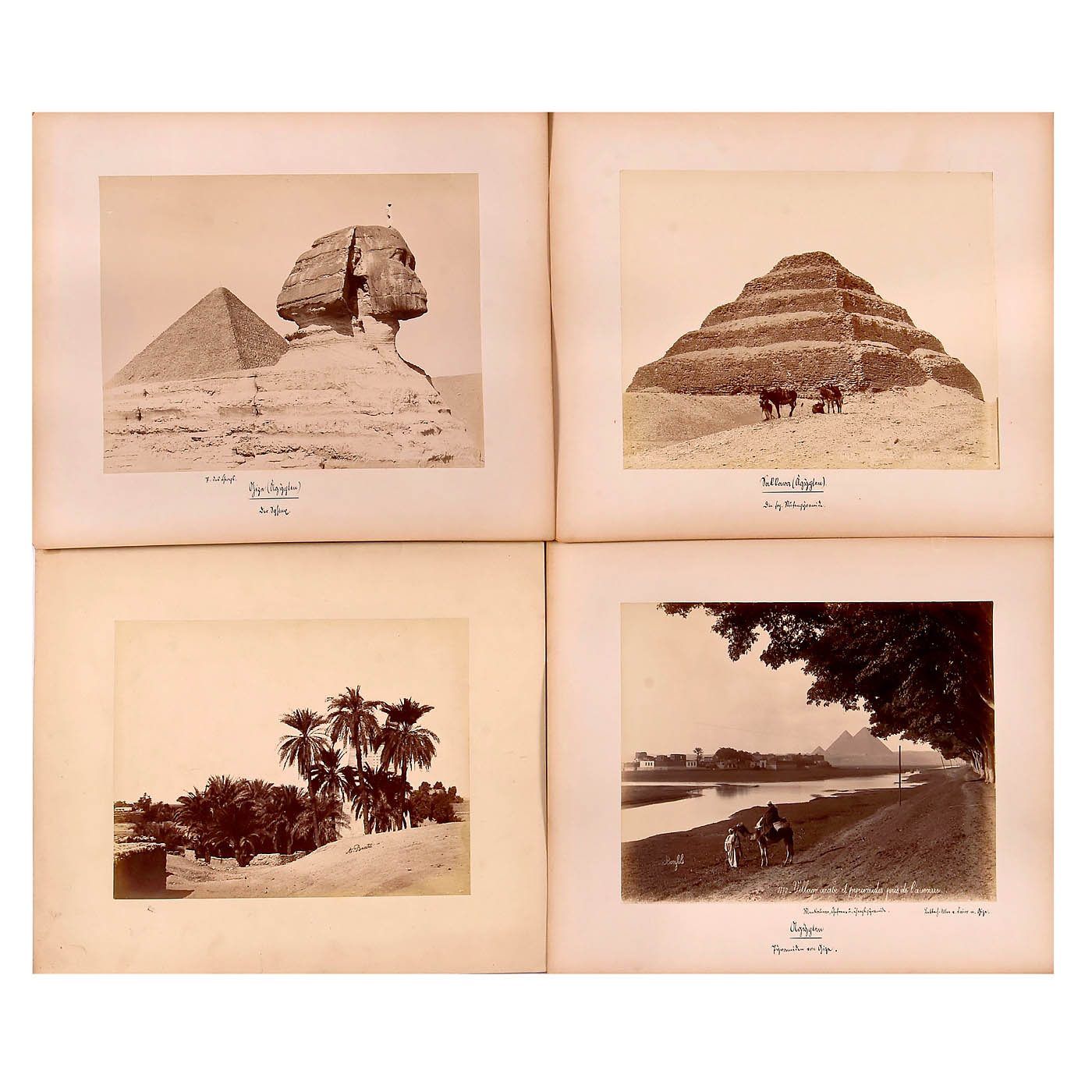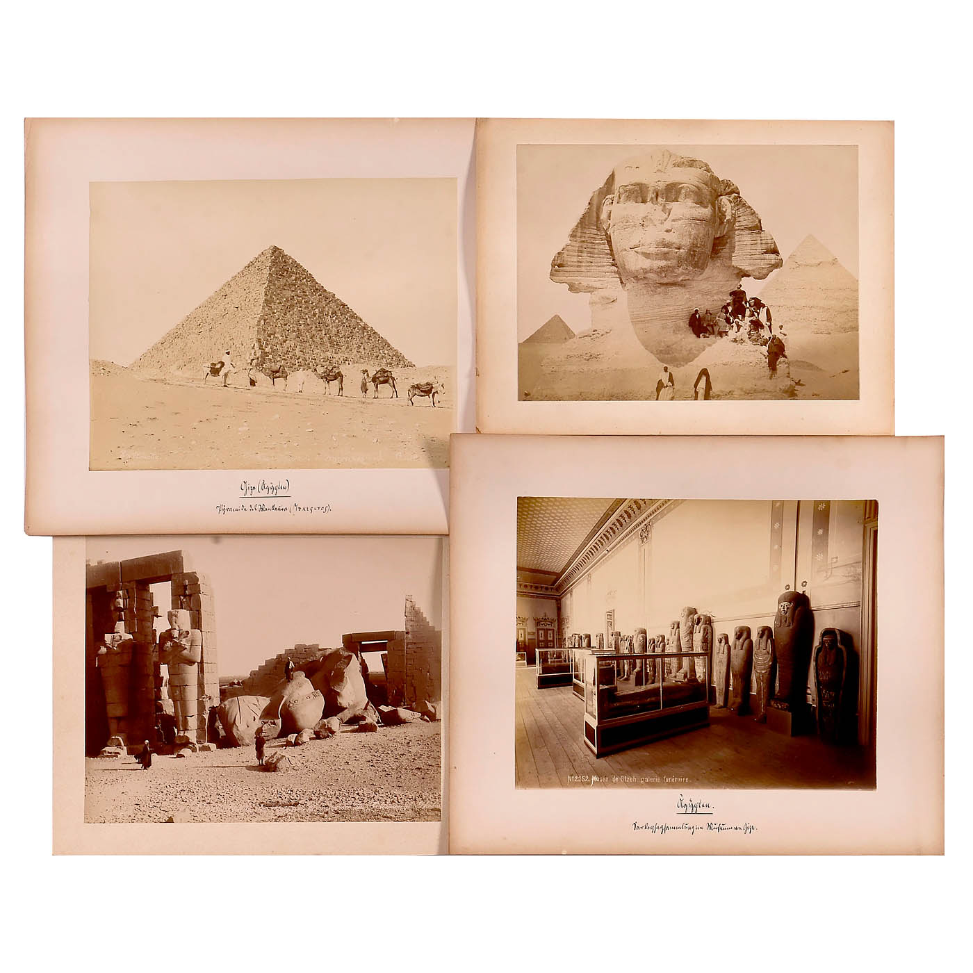 18 titled photographs of ancient Egypt with its pyramids, temples, and pharaohs, all mounted on card stock ranging from 45 x 38 cm to 33 x 25 cm, in good condition. The set includes 4 photographs by Beato, 1 by Bonfils, 1 by Frith (1857), and 1 by Zangaki; 5 by Arnoux (difficult to read); and 6 without photographers' names but with titles.
