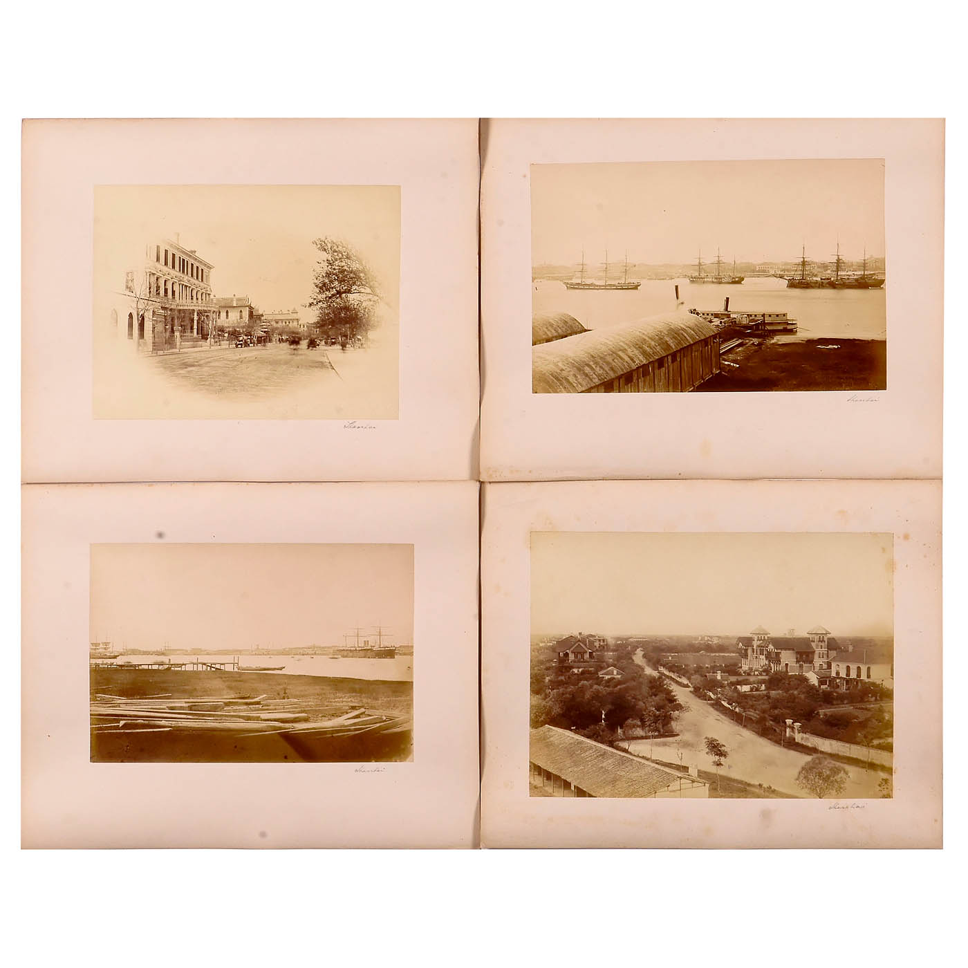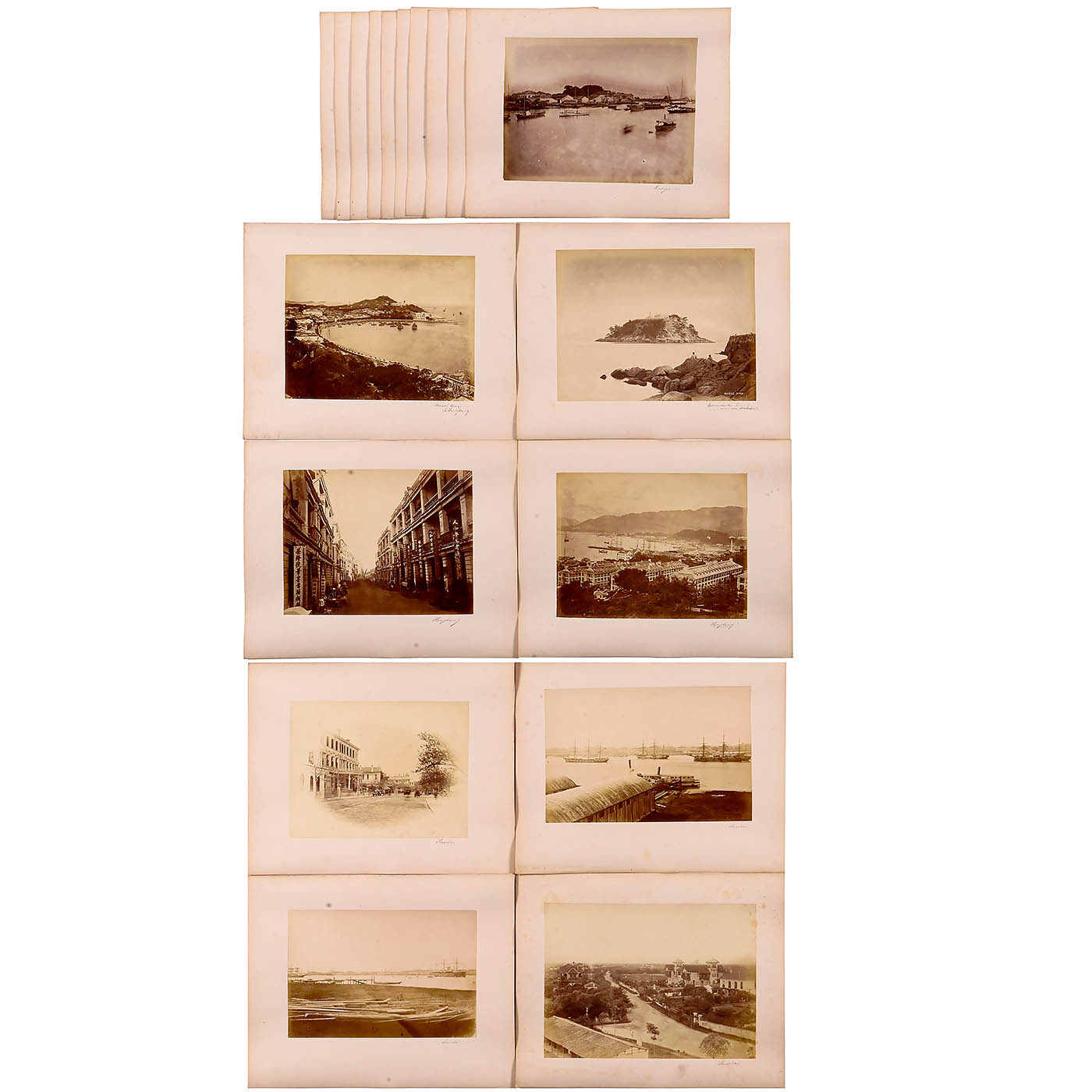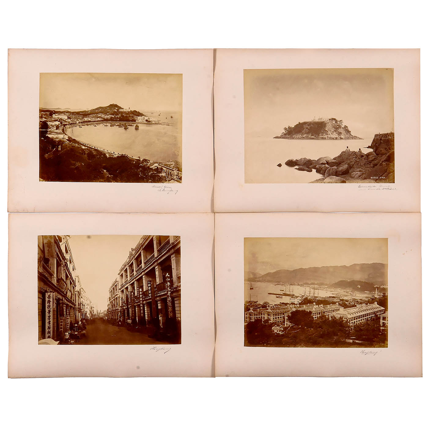 19 albumen photographs, 27 x 21 cm, depicting Asian port cities, streets, and inhabitants, all mounted on 31.5 x 39 cm card, in good condition. The set includes 7 photographs of Shanghai, 4 of Singapore, 2 of Hong Kong, 1 of Macau, 1 of the Sunda Archipelago, and 4 unlabeled views.