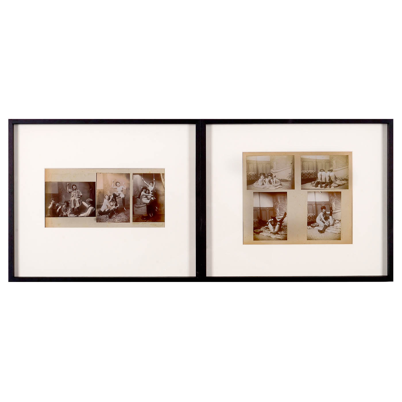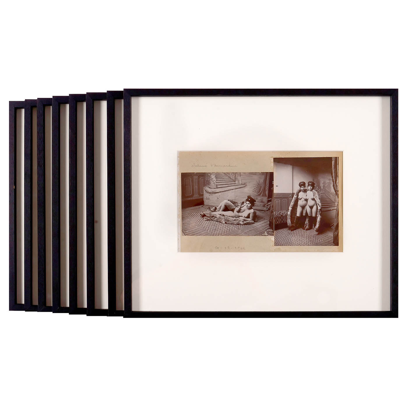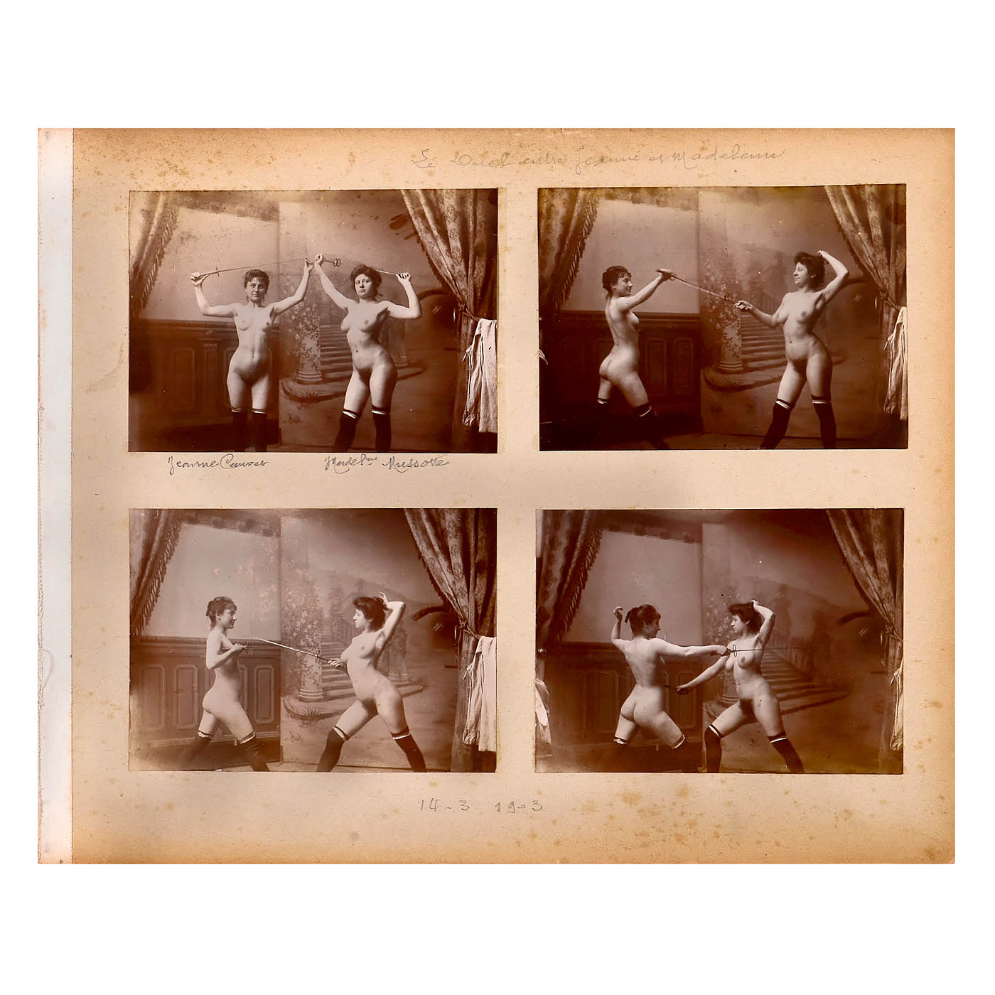 In modern, neutral frames (45.5 x 38.5 cm), sealed on the back and professionally matted: 47 celloidin photographs in sizes from 9 x 12 to 13 x 18 cm in excellent condition. Also included are 7 original 29 x 23 cm plates from the establishment's former presentation album, all double-sided and containing a total of 32 photographs, where handwritten notes mention the names of the people depicted – an extremely rare find. Particularly noteworthy are the 8 photographs of female foil fencers in the Amazonian style, "Le duel entre Jeanne et Madeleine (Jeanne Cauvaz and Madeleine Mussotte)". Provenance: from the Ronny van de Velde Collection, catalog "Cristal Palace", pages 30–31 for the exhibition March 26 – June 21, 2021 at Rossaert, Antwerp.