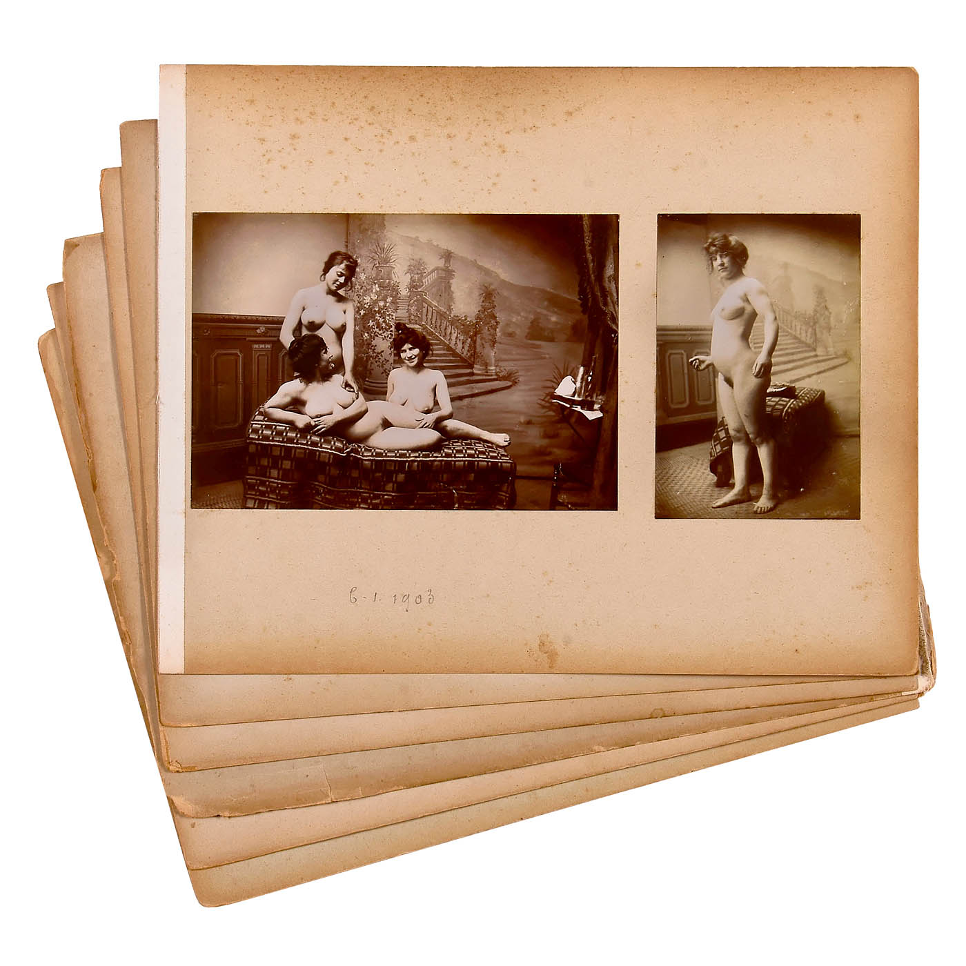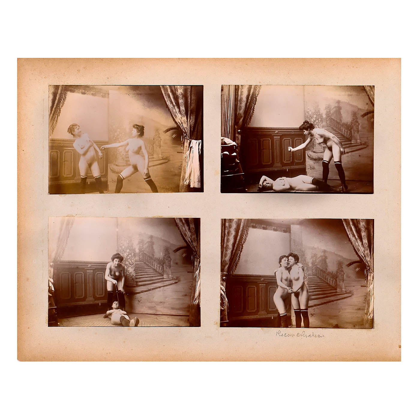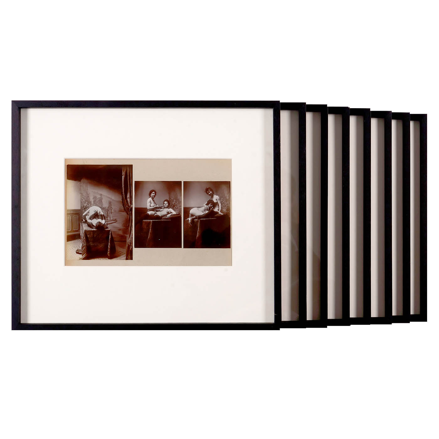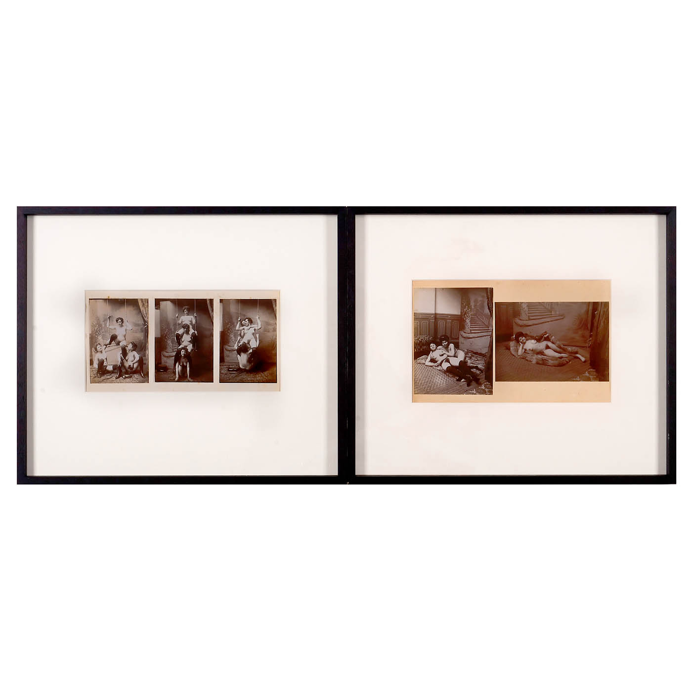 In modern, neutral frames (45.5 x 38.5 cm), sealed on the back and professionally matted: 47 celloidin photographs in sizes from 9 x 12 to 13 x 18 cm in excellent condition. Also included are 7 original 29 x 23 cm plates from the establishment's former presentation album, all double-sided and containing a total of 32 photographs, where handwritten notes mention the names of the people depicted – an extremely rare find. Particularly noteworthy are the 8 photographs of female foil fencers in the Amazonian style, "Le duel entre Jeanne et Madeleine (Jeanne Cauvaz and Madeleine Mussotte)". Provenance: from the Ronny van de Velde Collection, catalog "Cristal Palace", pages 30–31 for the exhibition March 26 – June 21, 2021 at Rossaert, Antwerp.