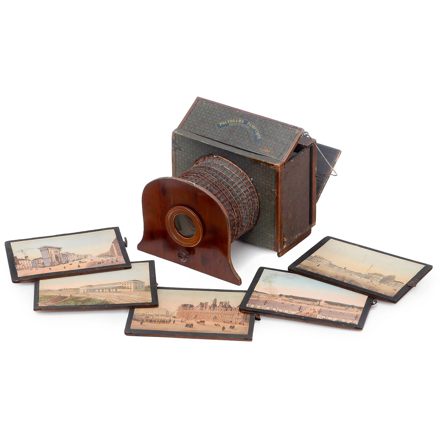 France. Polyorama Panoptique, the large picture viewer for tinted paper day/night metamorphic pictures in the format 20 x 14.2 cm, size of the viewer 22 x 31 cm, height 18 cm, green/red bellows interior with adhesive seals, front in mahagony with framed lens of diameter 4.5 cm, housing with green/red decorative paper. It features 5 day-and-night picture panels (the Hotel de Ville panel is the only one without cracks and flaws) with views of Paris, where the night image usually shows a dramatically changed motif.