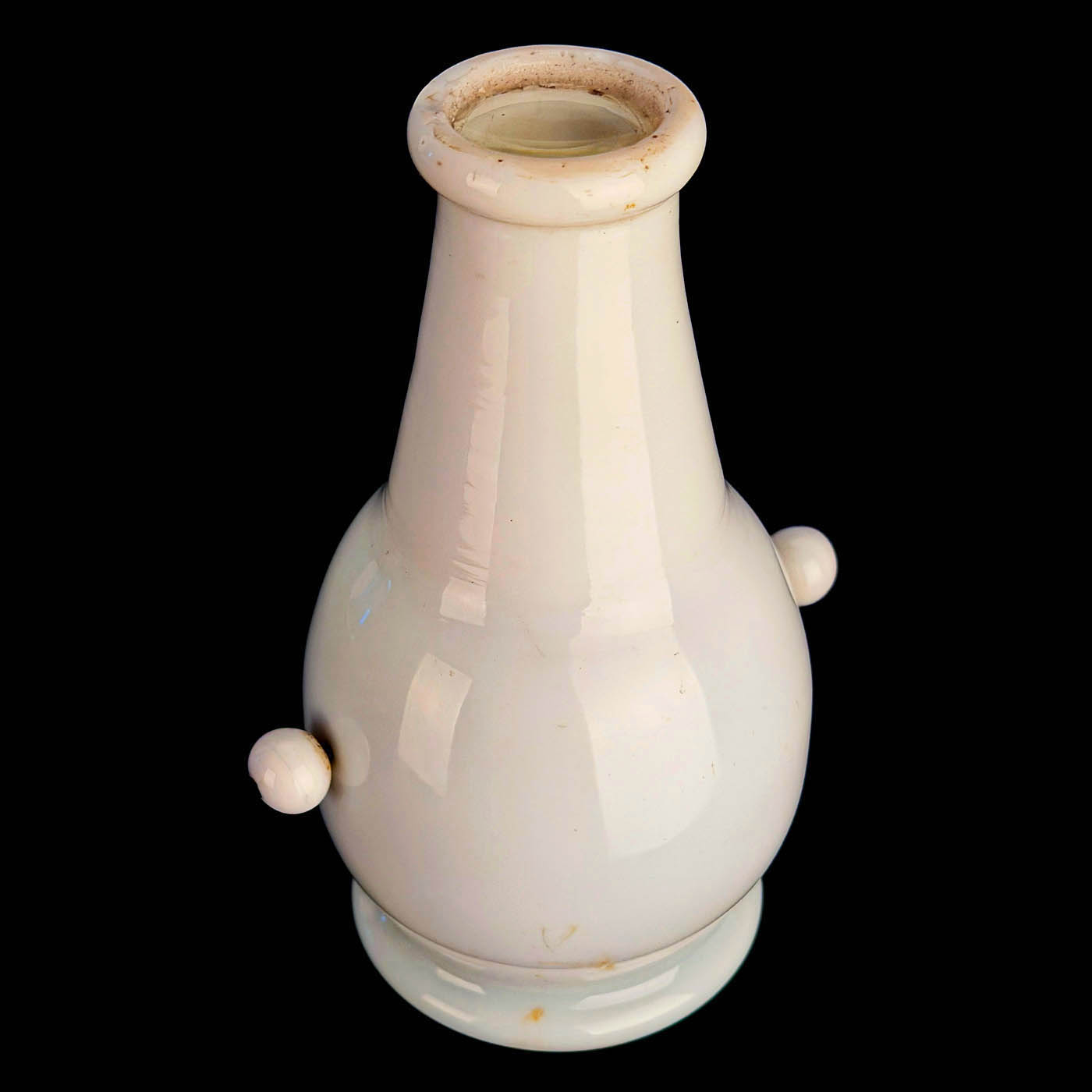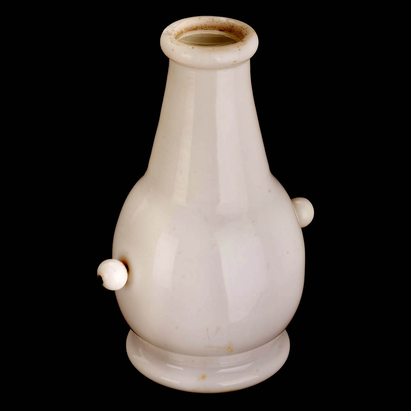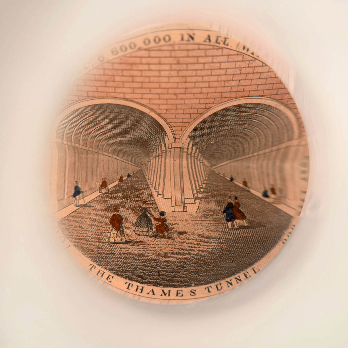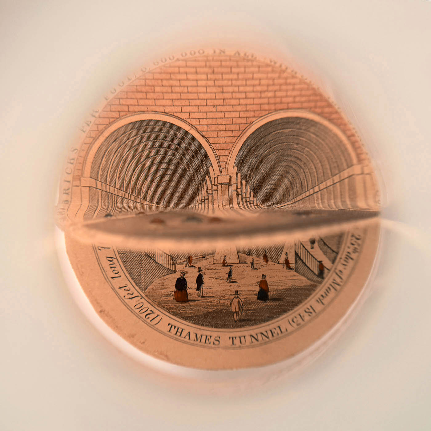A viewing device made of thin, transparent porcelain for four rotating, colored engravings. The 90-degree angles between the images, when viewed through the 22 mm magnifying lens, create a sharp, three-dimensional illusion. The first image bears the inscription: "The Opal Views are Manufactured by J.J. Mathewson, Nos. 4, 21, 51 & 59 Thames Tunnel and will always preserve their color in any climate". It shows two superimposed colored engravings: Above, a paddle steamer on the Thames; below, the double Thames Tunnel, each with three levels. The three other engravings, with their detailed, surrounding titles, are: "Interior of the Crystal Palace Opened by Her Majesty, May 1st, 1851", "Thames Tunnel (1200 feet long, 76 feet high, water mark was 8 years building and cost ? 446,000. Opened the 25th day of March 1843)" and "The Thames Tunnel took 50,000 bricks per foot, 6,600,000 in all without the shaft, cost ? 446,000.". The device is 13 cm high, with a maximum diameter (for the engravings) of 67 mm. An original cardboard insert is glued to the base. The device bears a certain resemblance to an alabaster peep-egg, but appears much earlier and more elaborate. According to the description, Mathewson had four shops in what was then the eighth wonder of the world and sold souvenirs to visitors who admired technology. Our research indicates that it is not currently known from the literature.