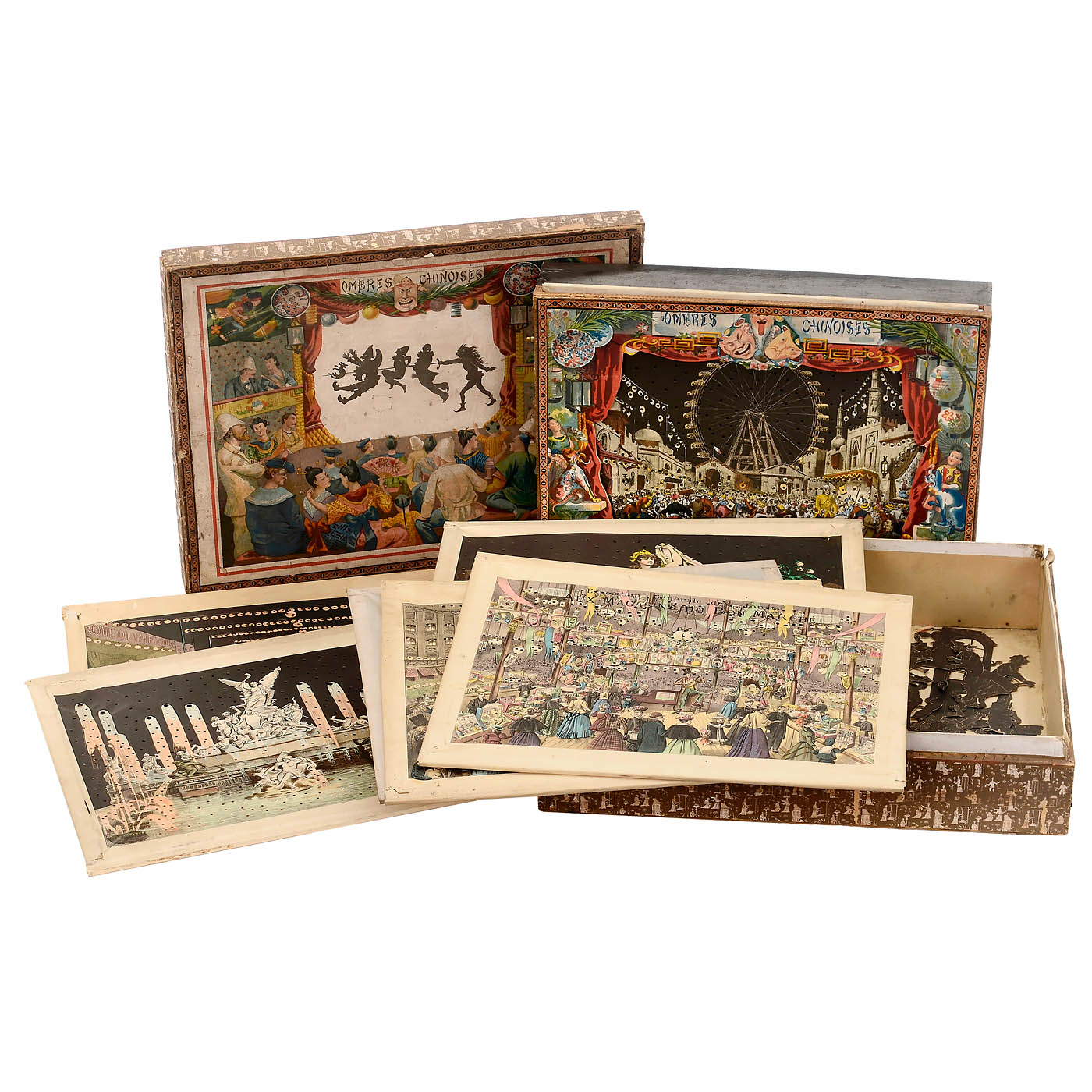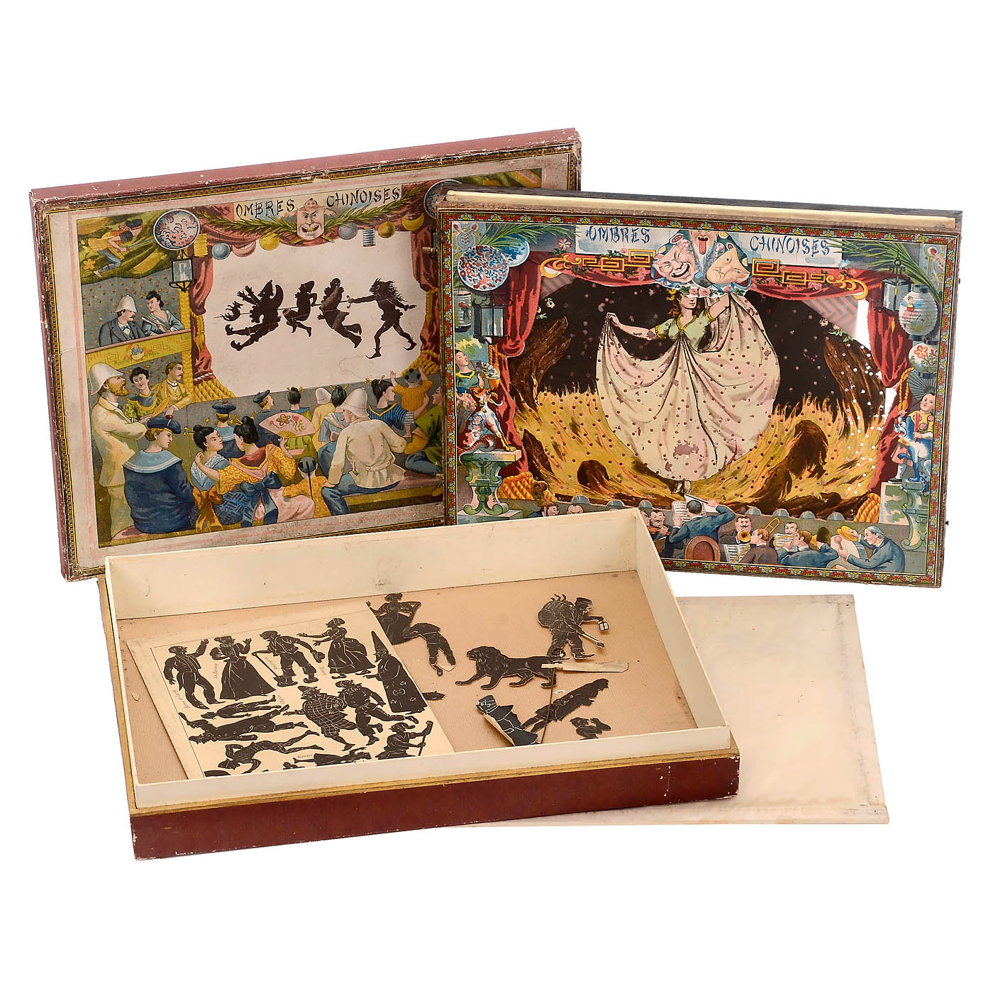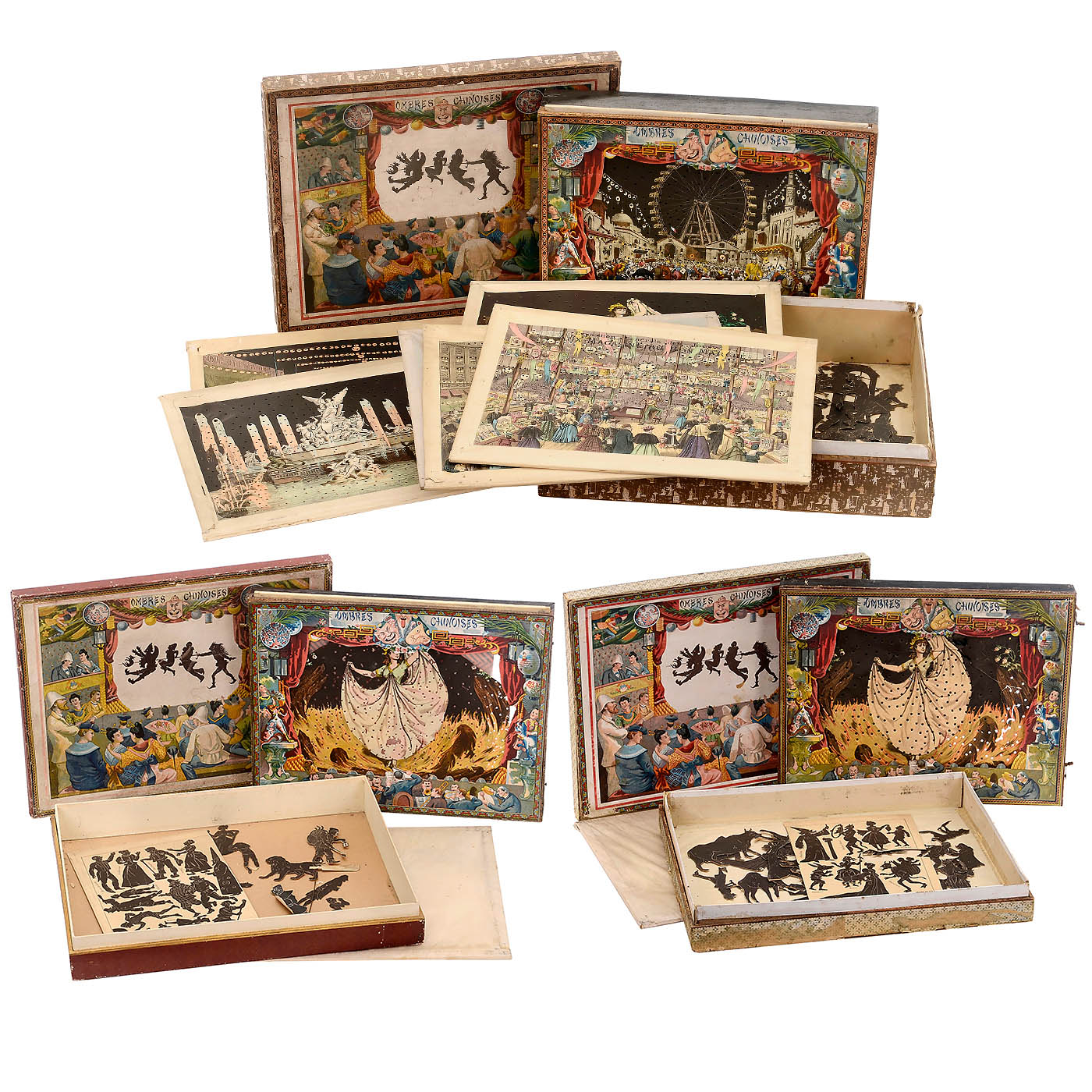 M.-D., Publisher, Paris. All for 44 cm wide background slides and with a crank-operated effect roller with stripes. 1) "Ombres Chinoises à Grand Effet," instructions and contents listed on the lid, a portable theater with a musical mechanism (mounting screws replaced), running, 6 slides: La Loie Füller ou la Danse serpentine; Une Fête villageoise; L’Embrasement du Trocadero à Paris; Les Fontaines lumineuses; Bataille de Confetti Place d’Opera; (different motif than text on the lid:) Exposition Générale des Jouets aux Magales du Bon Marché. All in good condition. Includes a blank canvas and various movable figures. Box 39.7 x 50.3 x 12 cm with gold-colored exterior decoration. A very complete theater set! (3/3) – 2) "Ombre Chinoises A Grand Effet", stand-up theater, effect roll and Snake Dance insert with tears, with blank canvas and various figures. Box 38 x 49 x 7 cm with different decoration than before. (4+/4) – And: 3) Ombre Chinoises, version without instructions, stand-up theater, Snake Dance insert trimmed at the corners, with blank canvas, uncut partial sheet and various figures. Box 49 x 38 x 7 cm with red exterior decoration. (3-/3)