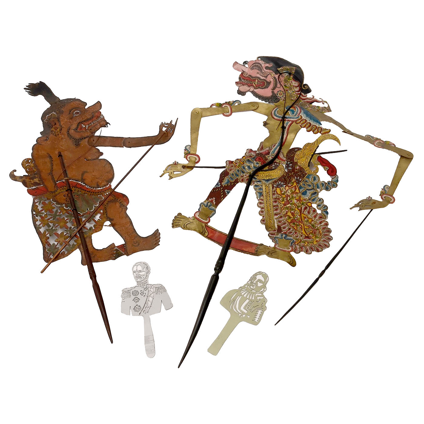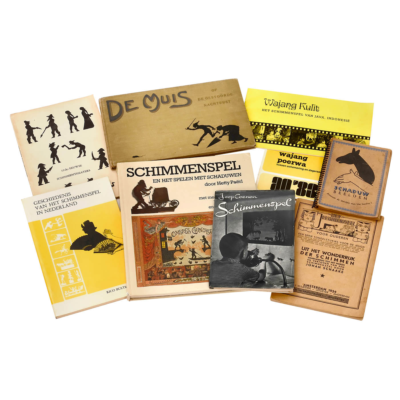 1) The Ernest Sewell Shadow Set, 35 x 41 x 3.5 cm, the stage is clamped into the cardboard box, with a collapsible stand for a flashlight and instructions. – 2) Made by J.W.S. & S., Bavaria, designed in England. Spear Series. The Zillograph, Faces with changing expressions, collapsible stage 30 x 29 cm and 14 movable figures, with cardboard box for the shadow figures 19 x 30 cm, storage box for the stage included. – 3) D. KL, Netherlands. Wij makeen zelf ons Schimmentheater, 27 x 27 cm. – 4–5) Metal shadow figures of a monarch c. 1900 and a Baroque nobleman, height with handle 19 cm, high-quality work of utmost precision. – 6–7) Javanese figures, a prince, length with handle 72 cm, and a demon, length with handle 65 cm. – And: 8) 9 books and instructions from 1920 to 1970 on shadow puppetry, all in Dutch.