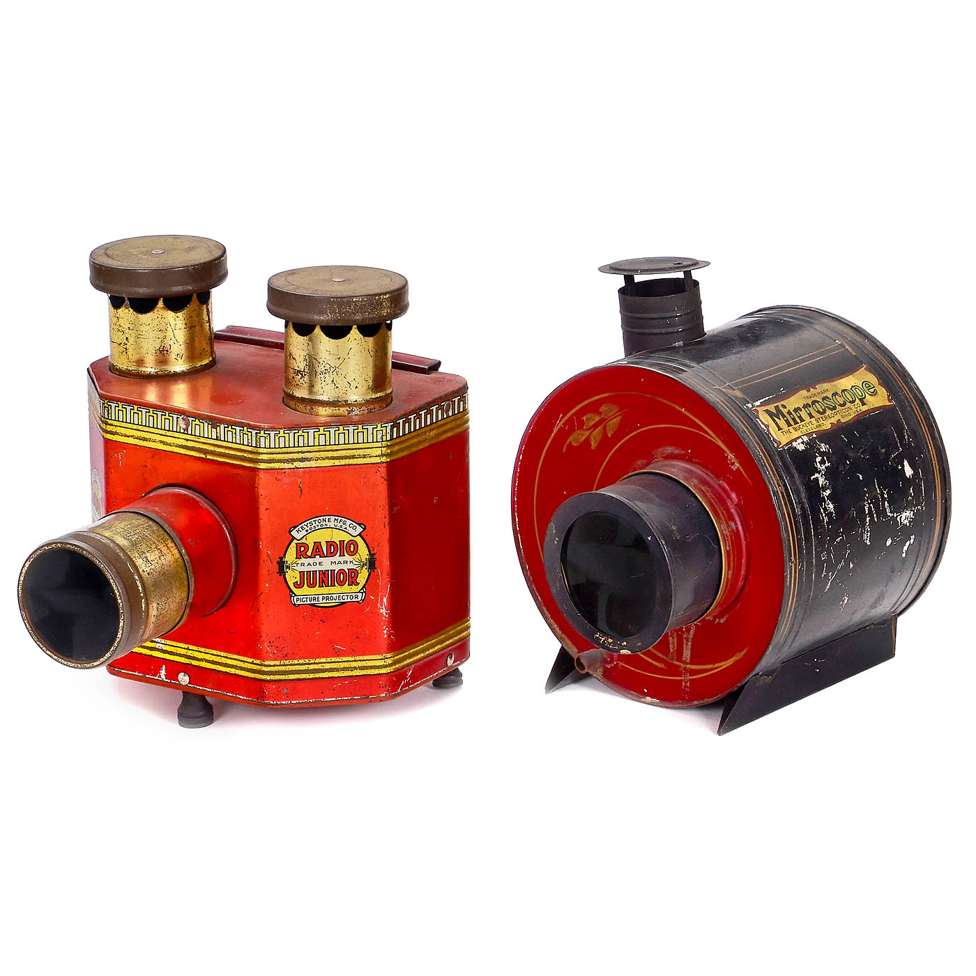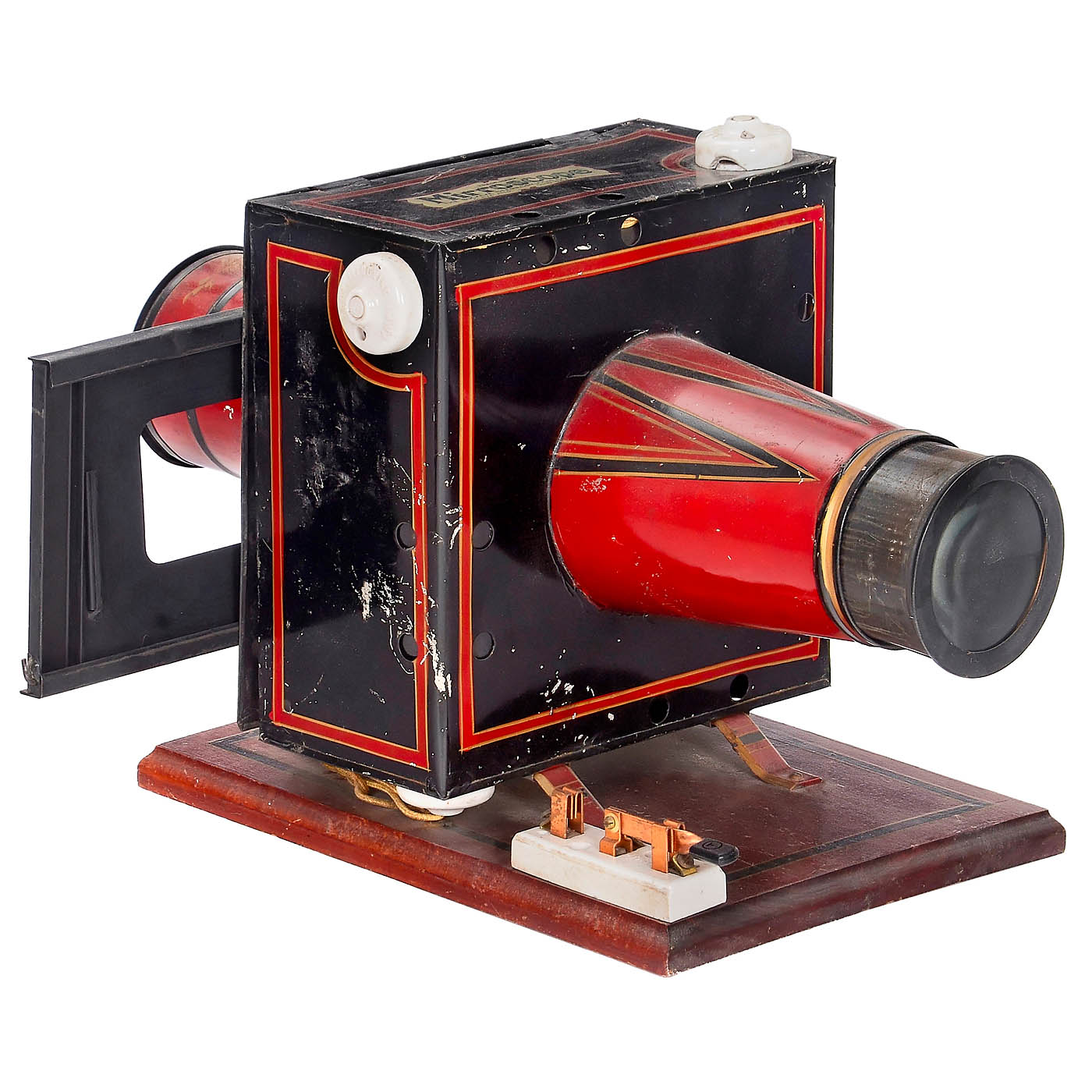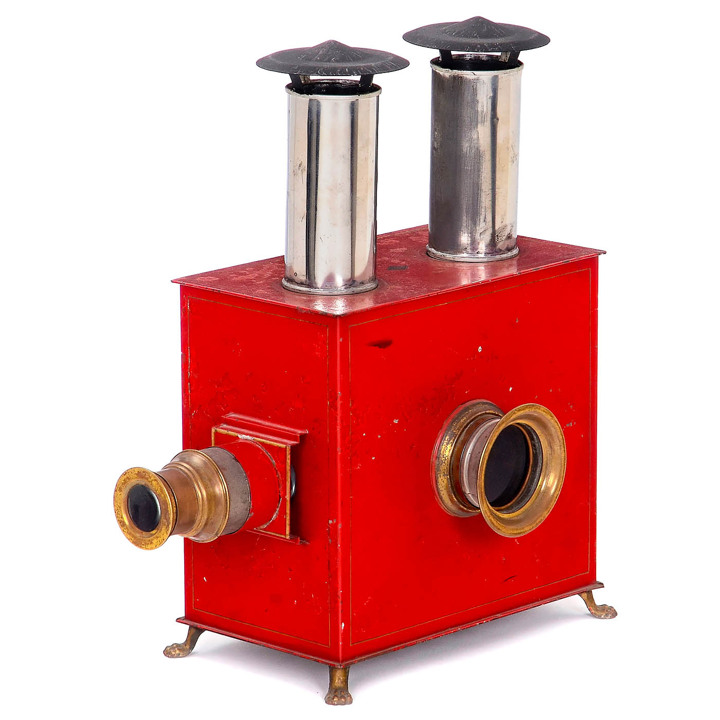 All with red/black painted metal parts and gold-colored decorative strips. 1) Ernst Plank. Megascop, 41 cm high, for cartes de visite/photographs 7 x 5 cm and 7cm glass slides. – 2–3) The Buckeye Stereopticon Company, Cleveland. The small "Mirrorscope" c. 1910, projector for 8.5 x 14 cm postcards, 30 cm high; and the large, deluxe "Mirrorscope" for postcards, as well as a rear-projection slide projector for 10 x 10 cm slides, with slide changer, 30 cm high, for 3 light bulbs, still with original fabric-covered cables. A beautiful display piece. – And: 4) Keystone, Boston. Radio Junior Picture Projector, for postcards, 28 cm high.