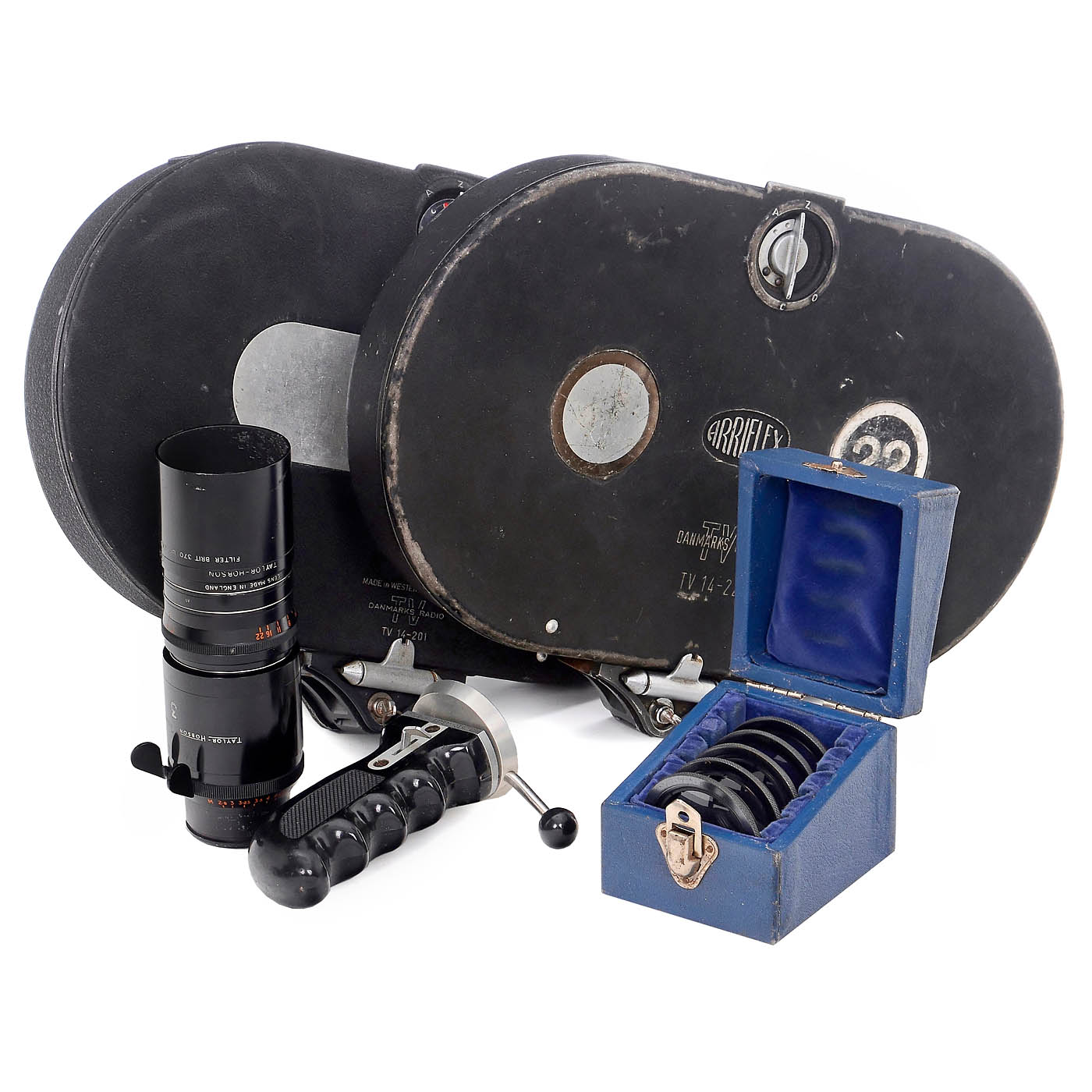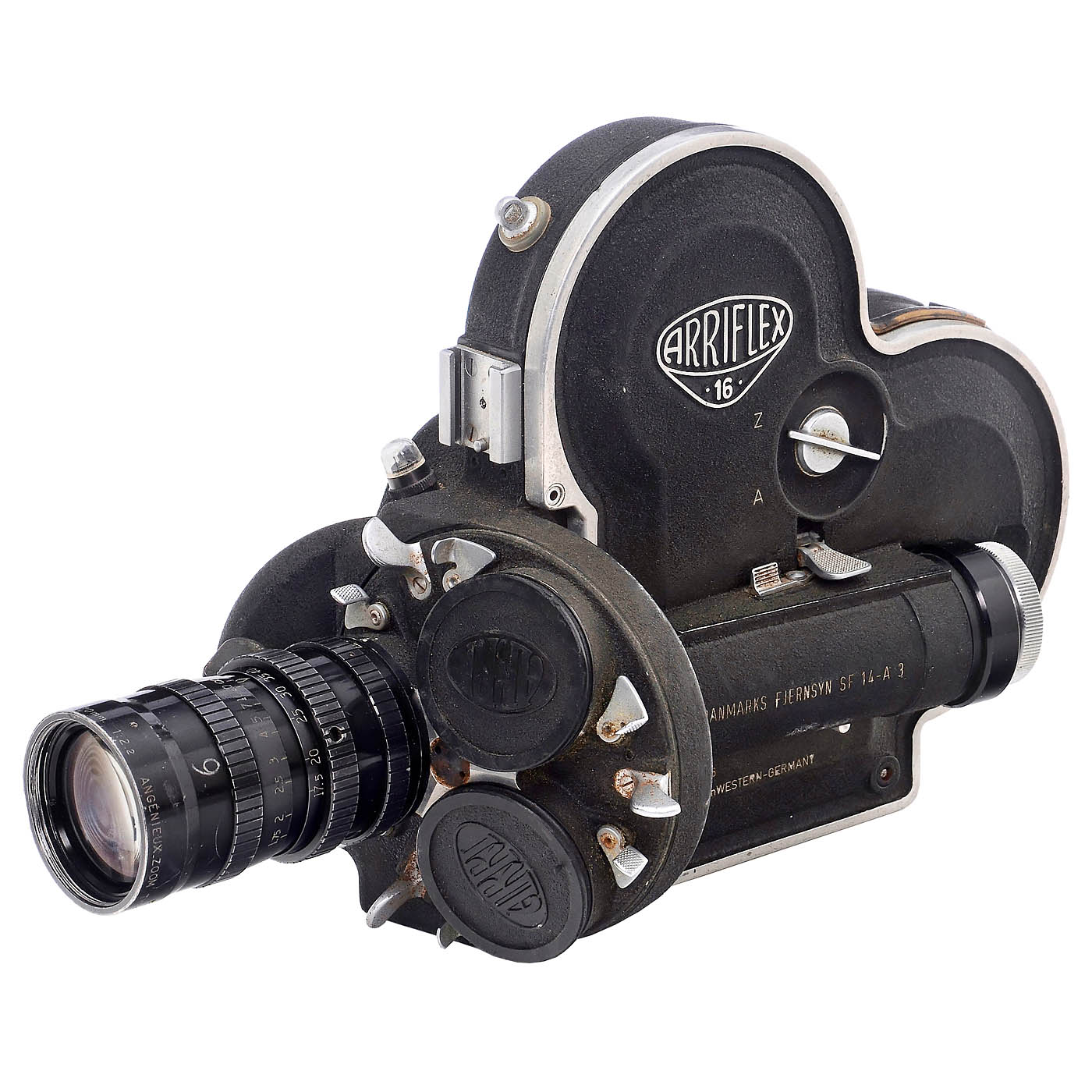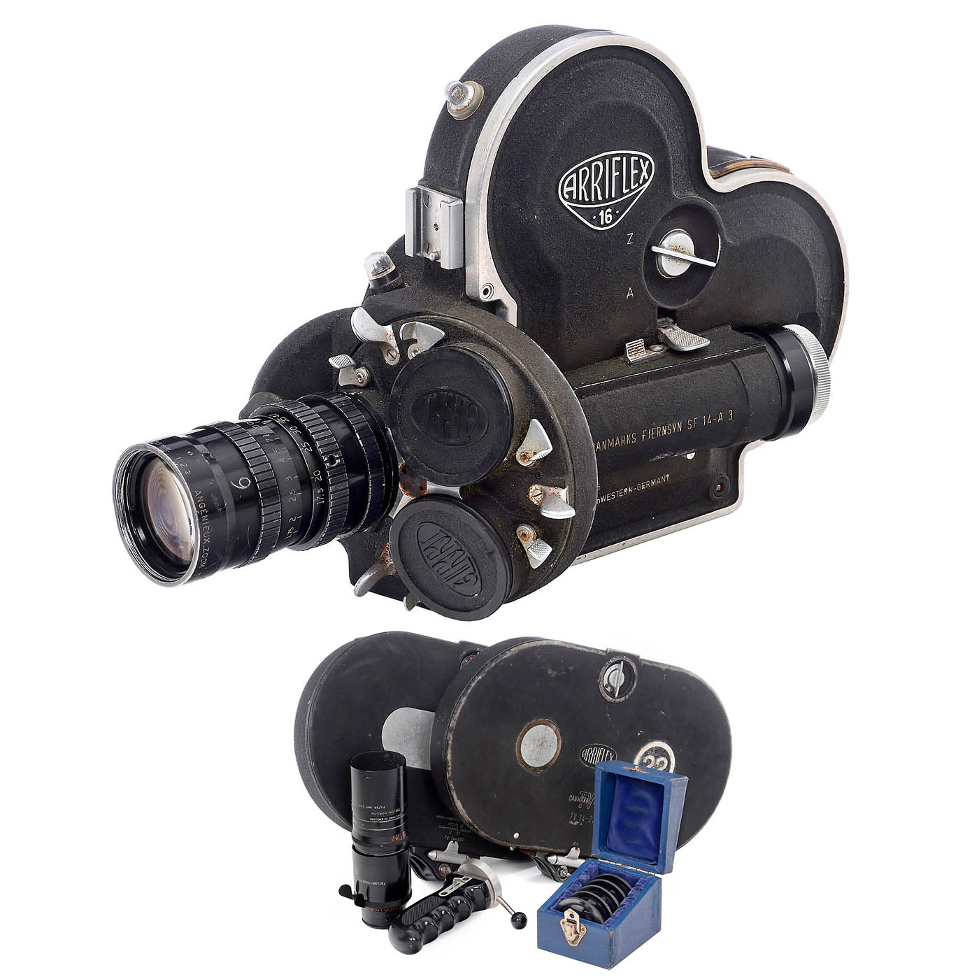 Arnold & Richter, Munich. SLR camera for 16mm film on 30m daylight spools or for 120 m film in an additional cassette. Revolving head for three lenses, equipped with: Angenieux Zoom 2.2/17.5-70 mm. A second lens, a Cooke Kinetal 3.8/150 mm, is in good condition. –Note: The camera is missing the screw-on viewfinder magnifier (can be added). Accessories: Two cassettes for 120 m film with a cassette motor, numerous small parts such as handles, etc.