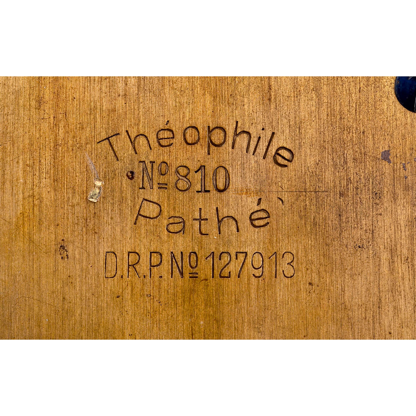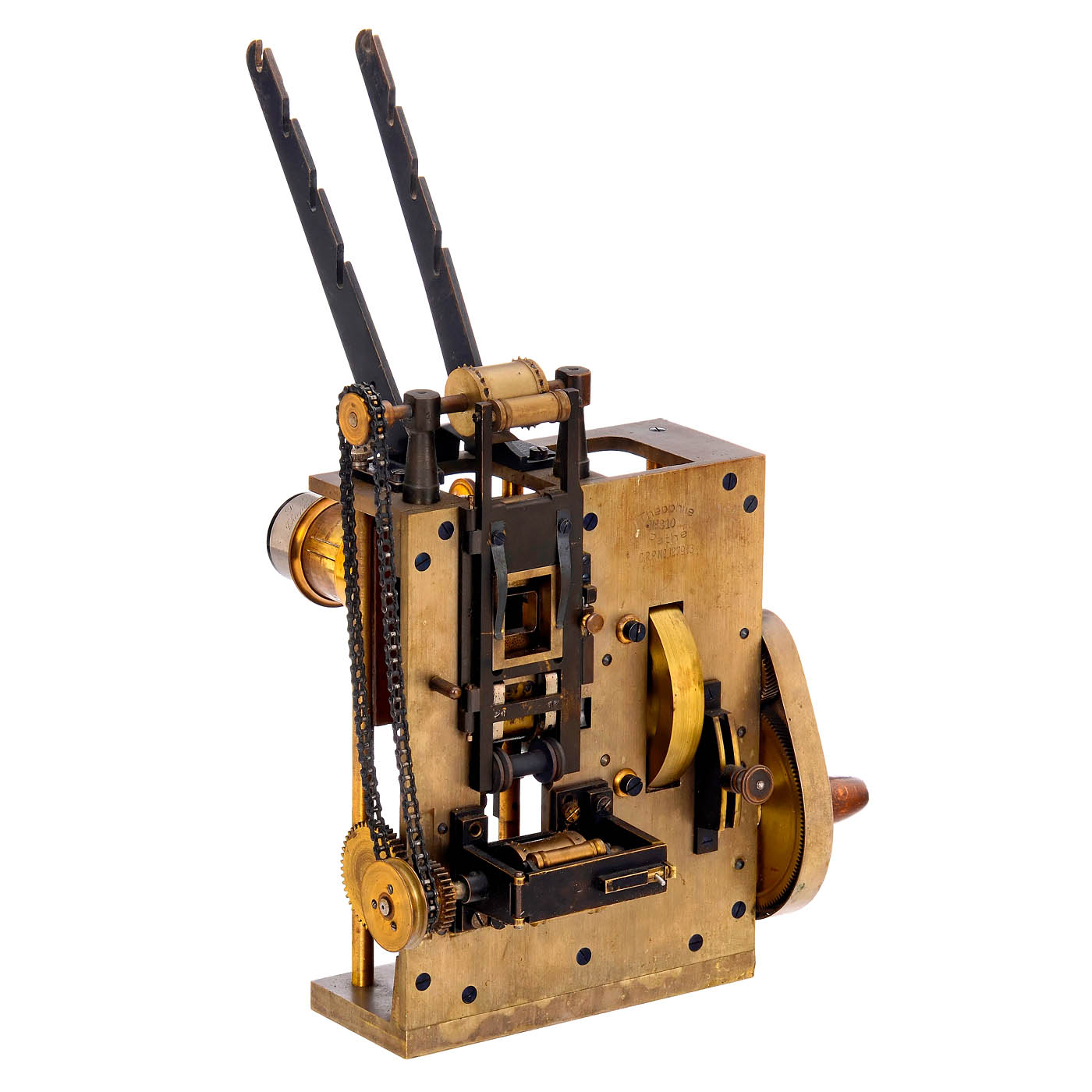 Pathé, Paris/Berlin. Brass only, engraved "Théophile Pathé No. 810 D.R.P. 127913", without specifying a place of manufacture. The patent could refer either to its manufacture by Oskar Messter, or to the fact that the film pioneer Messter was the first to use a Maltese cross for film projectors. Head of a 35mm film projector. Step mechanism: Maltese cross. Drive by original handcrank. Rotating sector axis for front shutter (not present). Lens: Pathé Théophile 55 mm, unknown and extremely fast Petzval-type 1.8/55 with sliding halves, either for the well-known principle of a slight change in focal length or for film grain reduction through minimal softening. Slotted guides on the top of the head for hanging film reels of various sizes. Short films of the time were not wound onto reels. When placed in front of a magic lantern, the lantern became a film projector. – A very rare brass projection head still with a wooden lens mount from the beginning of cinematography.