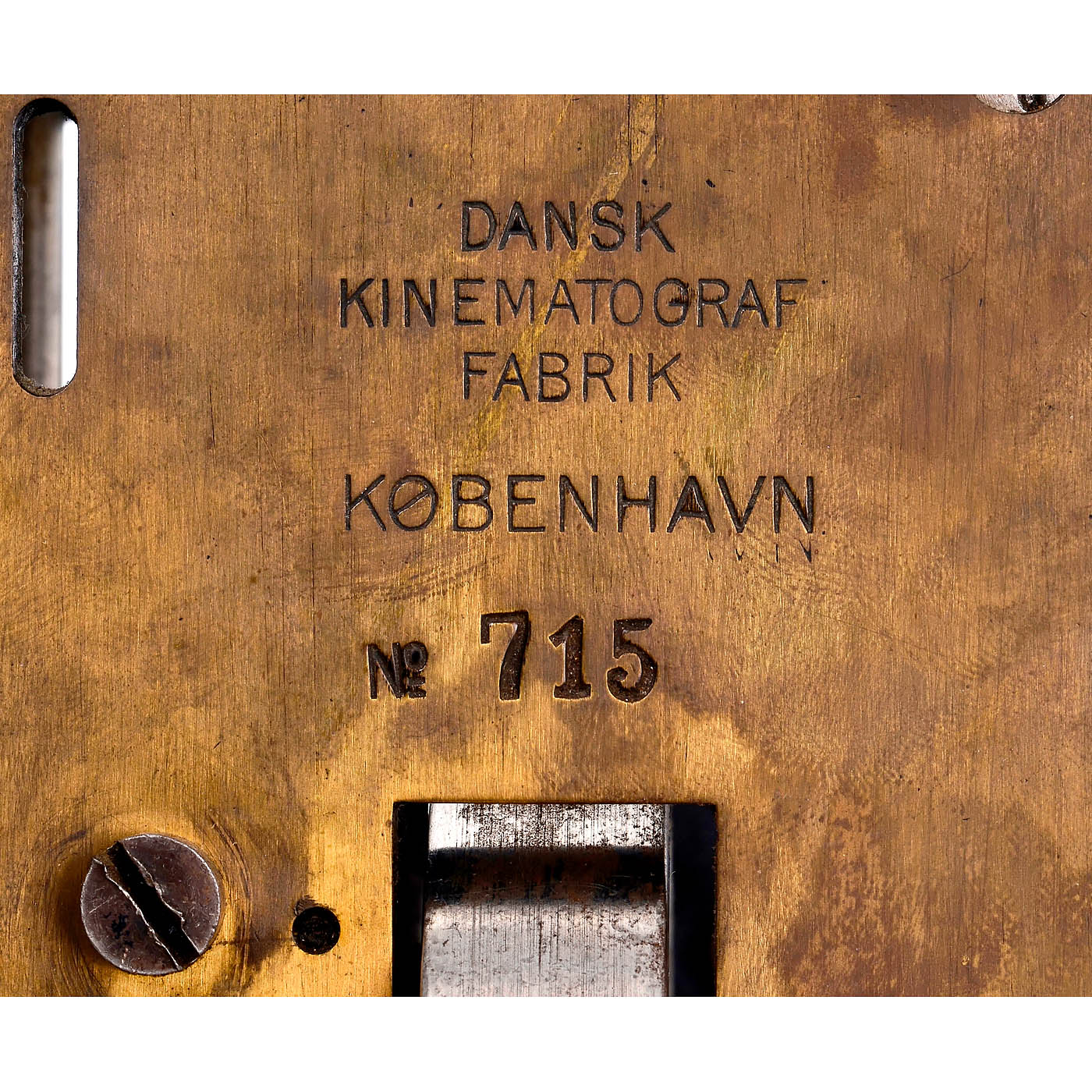 Manufactured under license by "Dansk Kinematograf Fabrik Kobenhavn No. 715". Mechanism of a 35mm film projector. Stepping mechanism: Maltese cross. Handcranked drive. Rotating sector as front shutter. Lens: Pathé Frères Paris Serie Supérieure. Reel holder for various film lengths on the head. Construction: Steel projector with brass board.