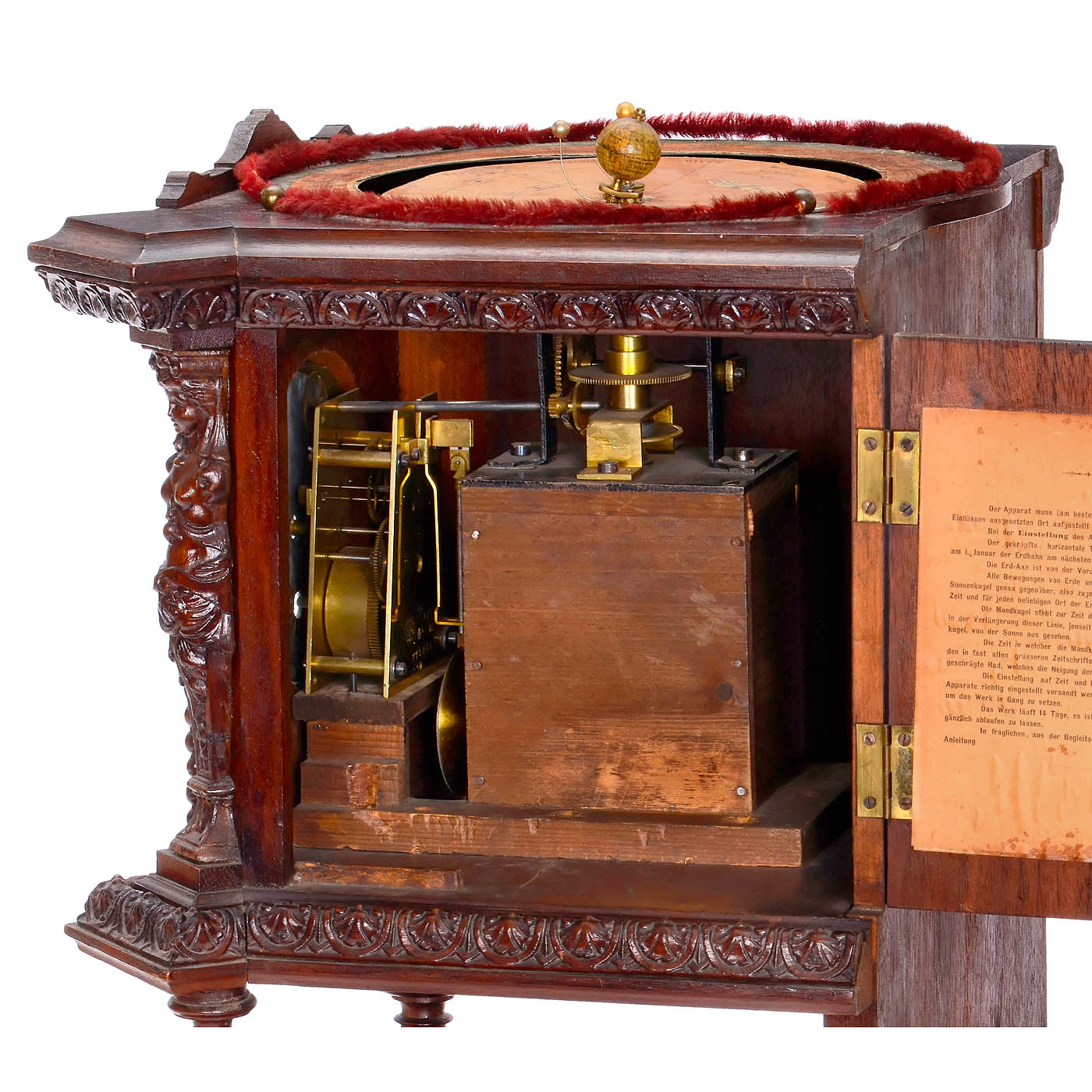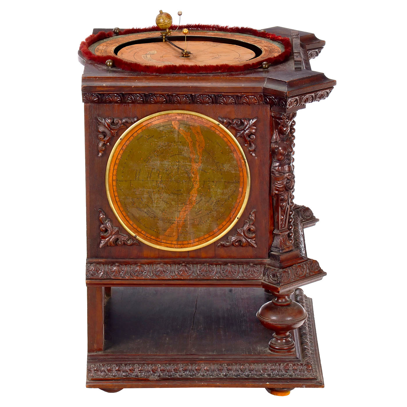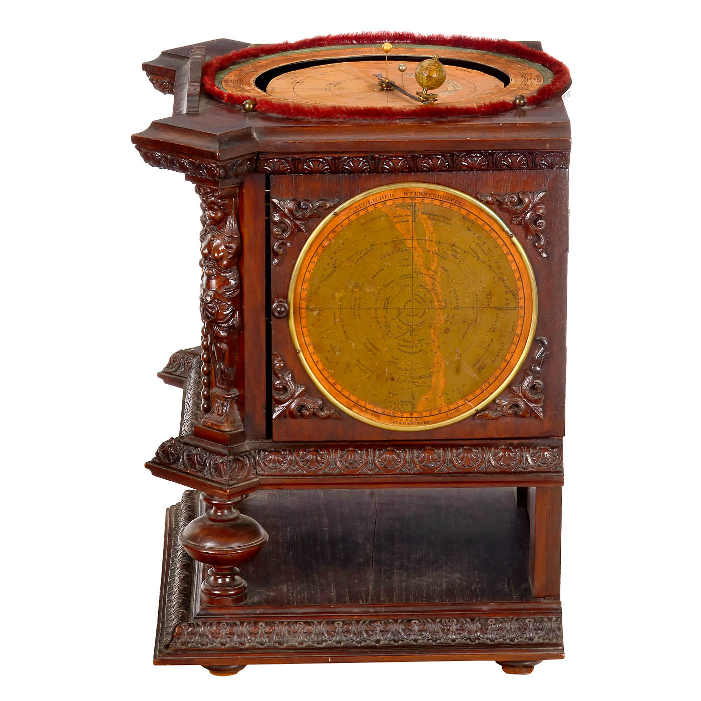 L. Deichmann, Geographical Institute, Cassel, Germany. Walnut case with carved decorations, lithographed maps of the northern and southern skies on the sides with the positions of the brightest stars and constellations in frames, door on the right-hand side, printed instructions inside, etched brass dial with Roman numerals, ? 5 in., mechanical pendulum clockwork by Gustav Becker, the clockwork is connected to the mechanism of the tellurium via brass gears, moon and sun represented by small balls, globe with lithographed paper segments on wooden sphere, above paper scales with season, date and signs of the zodiac, under glass dome, overall dimensions 14 ? x 12 ? x 21 2/3 in., in working order (no guarantee on running time or accuracy).