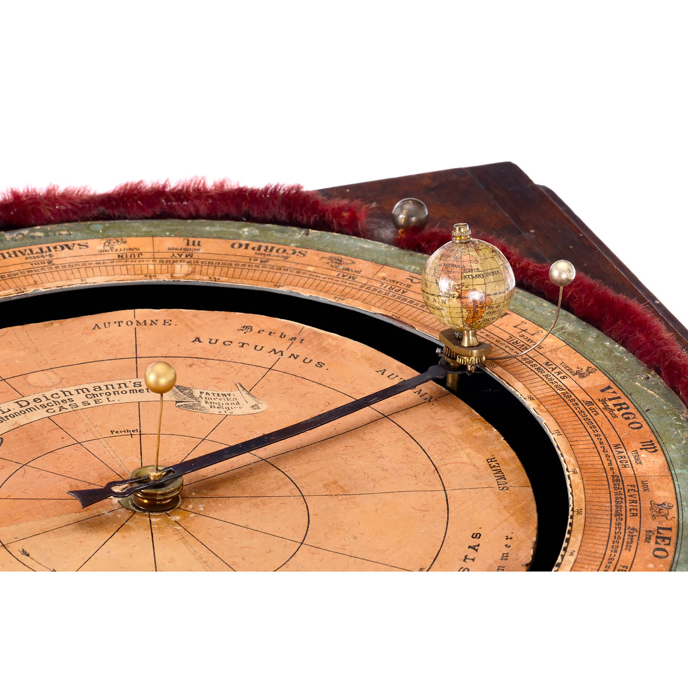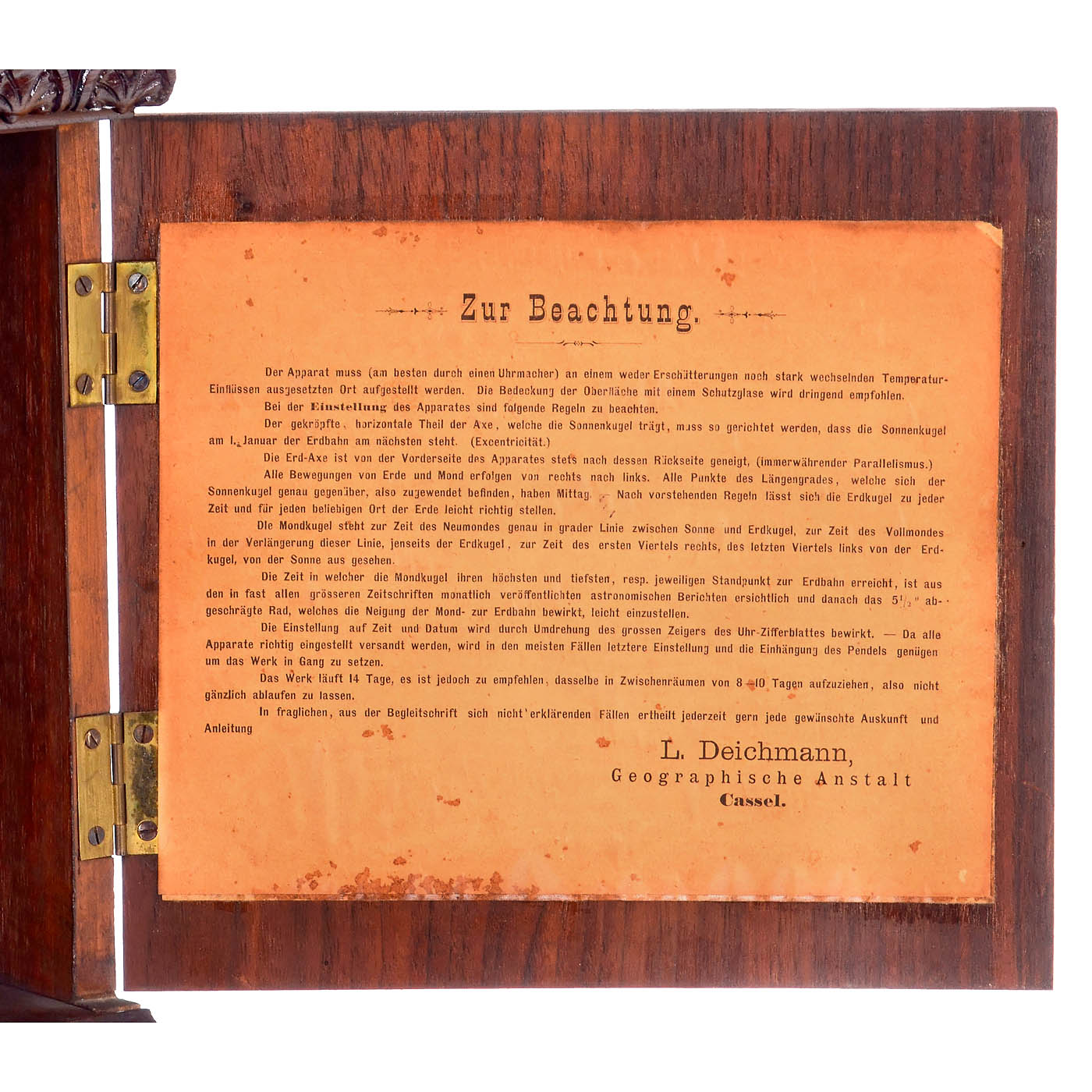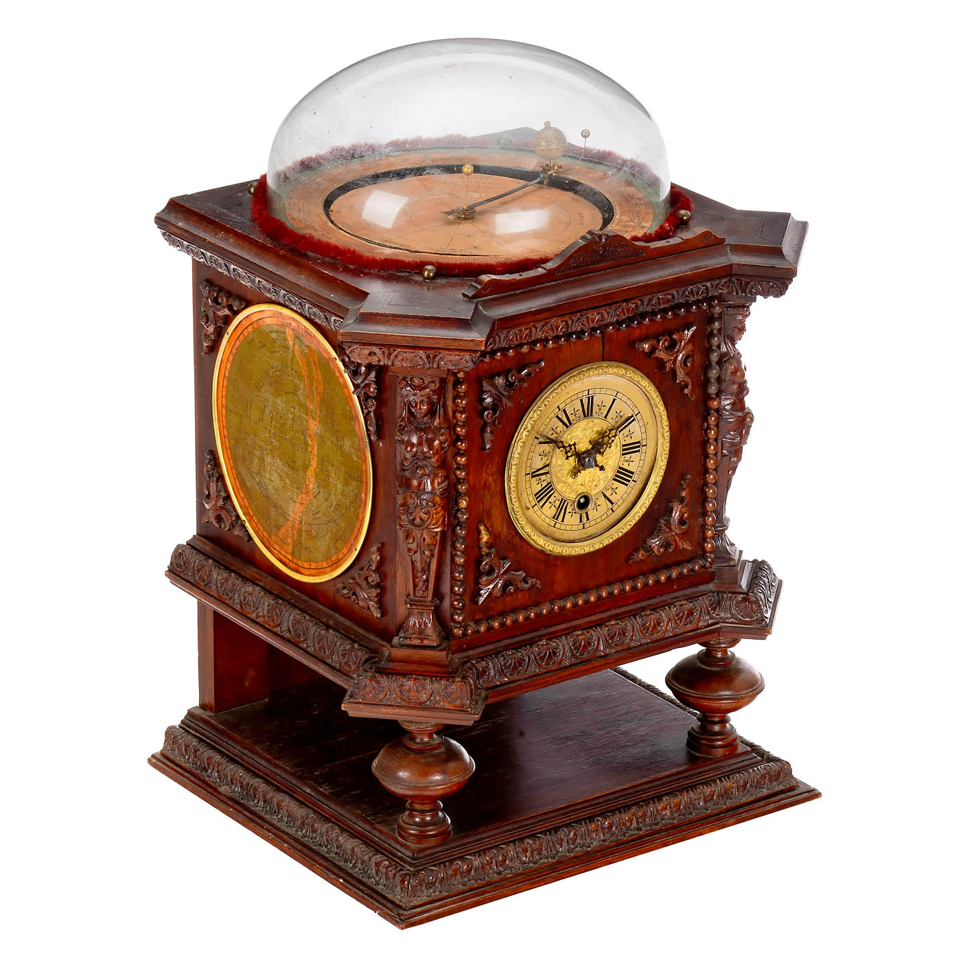 L. Deichmann, Geographical Institute, Cassel, Germany. Walnut case with carved decorations, lithographed maps of the northern and southern skies on the sides with the positions of the brightest stars and constellations in frames, door on the right-hand side, printed instructions inside, etched brass dial with Roman numerals, ? 5 in., mechanical pendulum clockwork by Gustav Becker, the clockwork is connected to the mechanism of the tellurium via brass gears, moon and sun represented by small balls, globe with lithographed paper segments on wooden sphere, above paper scales with season, date and signs of the zodiac, under glass dome, overall dimensions 14 ? x 12 ? x 21 2/3 in., in working order (no guarantee on running time or accuracy).