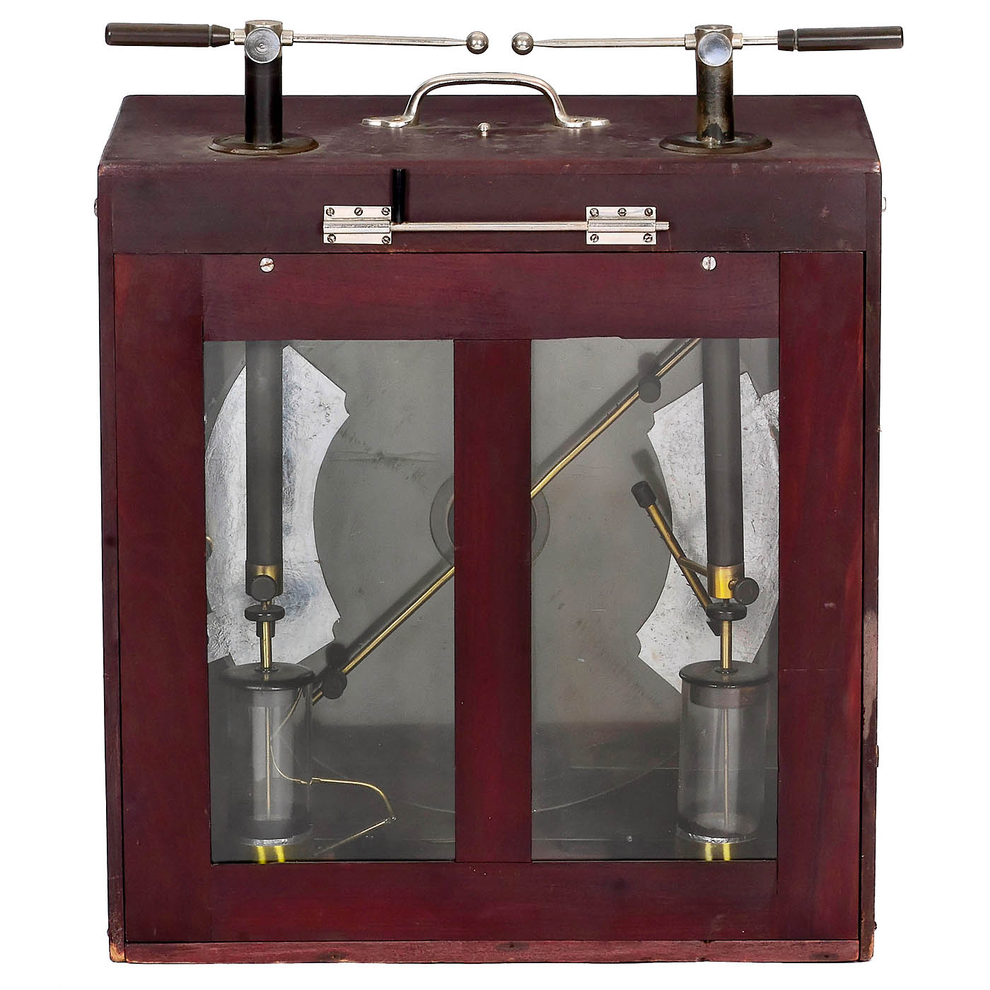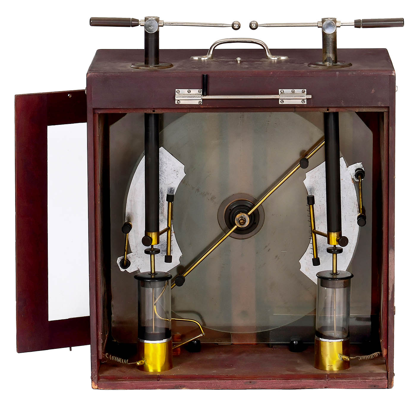 Large influence machine after Holtz, consisting of a fixed glass plate and a rotating glass disc, diameter 15 in., hand crank drive on the rear, 2 Leyden jars, in wooden case with glass front, dimensions 20 x 10 ? x 21 2/3 in.