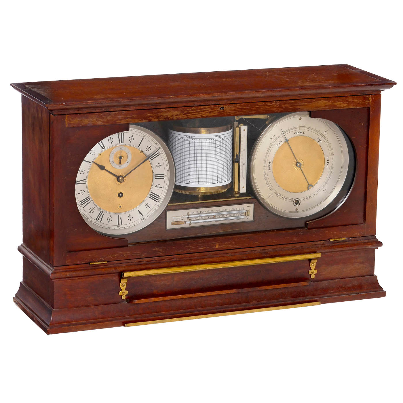 London, oak case, with mechanical clock, 8-day brass plate movement, pendulum, Roman numerals, subsidiary seconds, ? 8 in., eight-day fusee movement which is mechanically linked to a revolving drum that records the fluctuations in the barometric pressure, right side with aneroid barometer, coupled with the recording drum, in the center is an alcohol thermometer that displays the maximum and minimum temperatures, case dimensions 26 x 8 x 15 ? in. – With two keys.