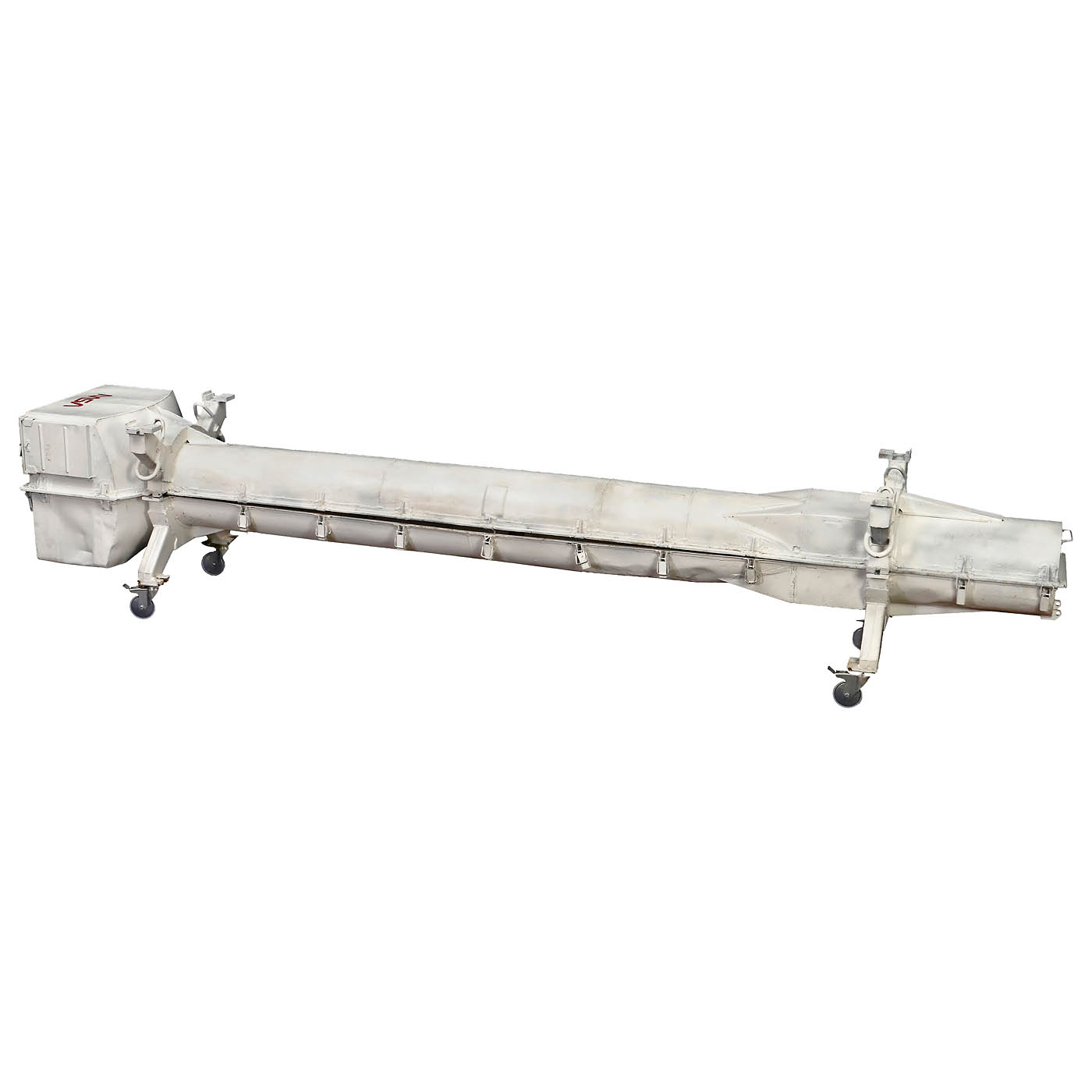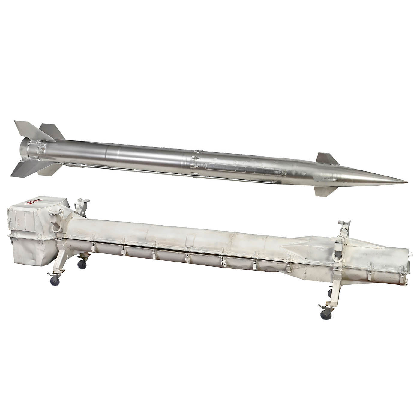 Fiberglass and steel, high-gloss silver metallic paint, length 125 in (316 cm), ? 26 in., 4 rotating tailfins and 4 fixed nosefins. In heavy-duty NASA steel transport case, length 129 in. (325 cm). – An aero-dynamic wind tunnel test model, used in the Central Institute of Aviation Motors (CIAM)in Moscow. Constructed in a joint effort between the American National Aeronautic and Space Administration (NASA) and the Russian Central Institute of Aviation Motors (CIAM) in Moscow. – An amazing and rare artefact for space flight history collections!
