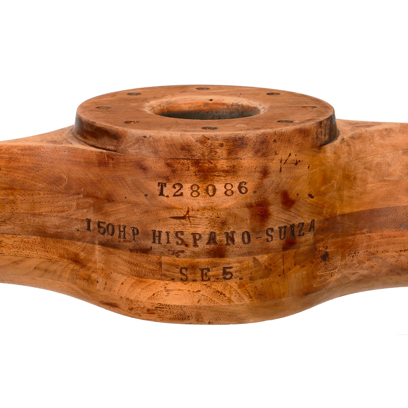 Clearly legible manufacturer's details are stamped into the wood on the side of the hub: "T. 280 86, I50 HP HISPANO-SUIZA, S.E. 5." and "I 9 G.10. I7 I 901". Length 93 ? in. – The propeller is in excellent condition (no cracks or breakages). – Alongside the Camel, the S.E. 5/5a was the most famous English fighter aircraft of the WWI. In 1915, the 150 hp engine was completed in Barcelona and, after testing, went into production in France in 1916. The 150 hp 8-cylinder engine from Hispano-Suiza was used in various aircraft. In England, it was installed in the S.E. 5, which was developed especially for the engine. Only 59 of these biplanes were manufactured. – In addition: Small wooden propeller, probably from the WWI, the propeller is glued 9 times, length 45 in., very good condition.