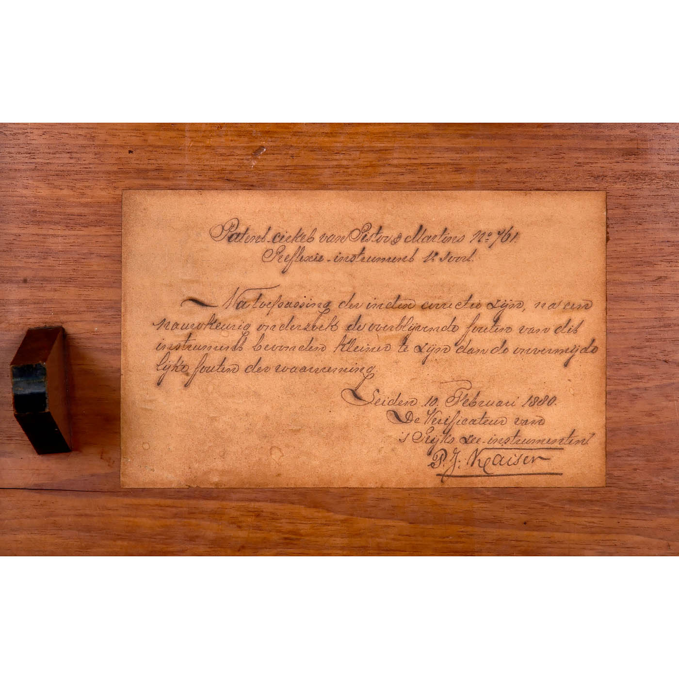 Mirror circle, signature on the outer ring "Pistor & Martins Berlin", opposite this signature the number "761", original lacquered brass, the inner frame is burnished (all original), mahogany handle, diameter 10?1/5 in.; silver scales, with prism and 4 fold-out half filters, a telescope, a focusable reading magnifier, optically and mechanically in good condition (perfectly functional), original mahogany case with inscription from 1880 (by the owner) in the lid. – Instead of the 60-degree scale of the sextant, the full-circle sextant has a full circle and is used to determine the angular distances of astronomical objects. This improvement was introduced by the mathematician and astronomer Tobias Mayer in 1755. – One of the rare examples of this mirror instrument is located in the Astronomical-Physical Cabinet in the Orangery in Kassel.