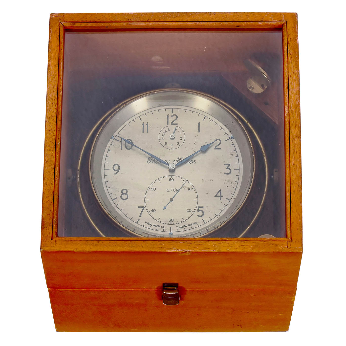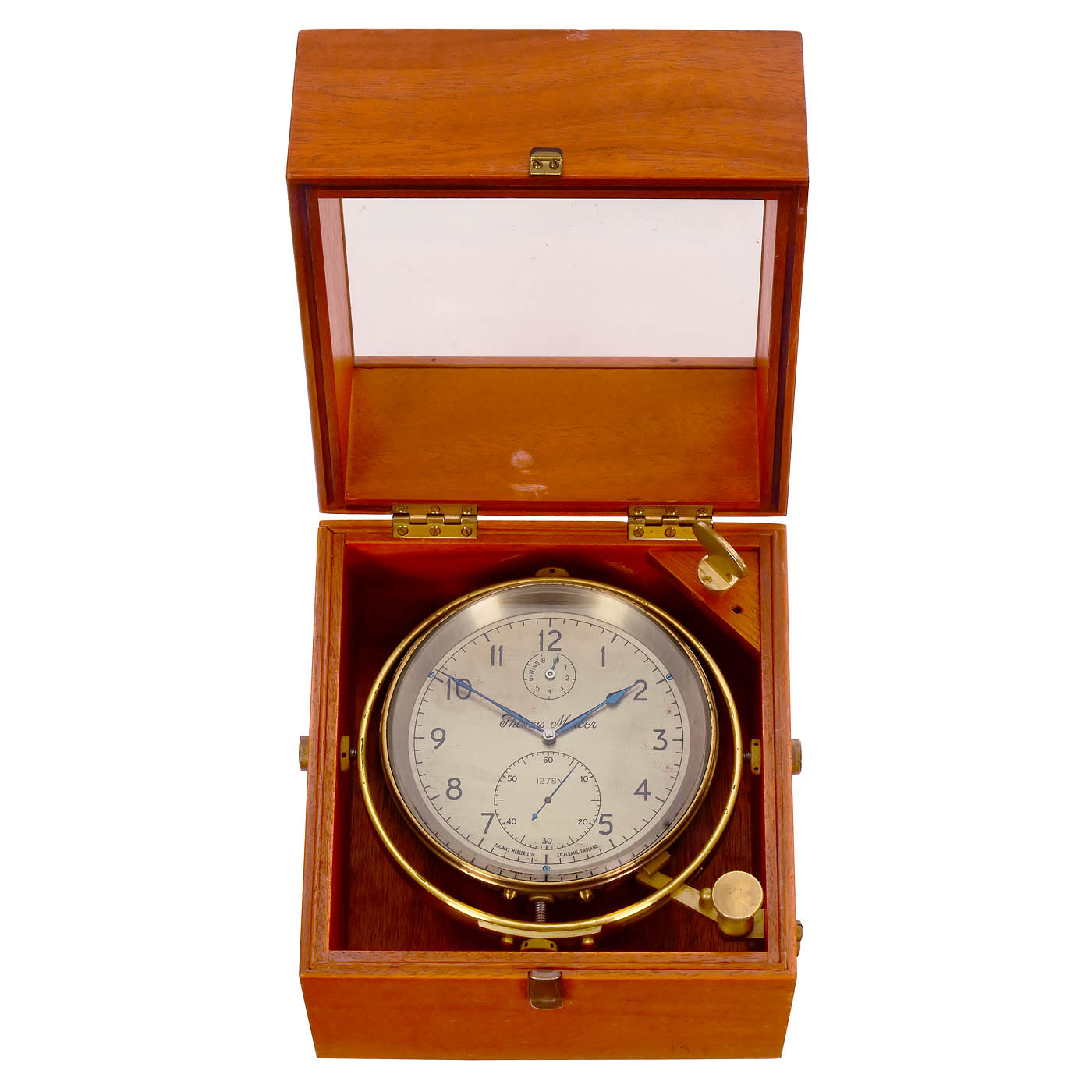Signed "Thomas Mercer Ltd, St Albans, England", no. 1278N, with gilt full-plate brass single-string fusee movement, silvered dial, outer minute ring, Arabic numerals, subsidiary seconds, 8-day winding indicator, blued hands, gimbal-mounted in glazed mahogany deck box, with key, defective, the balance bearing needs to be repaired.