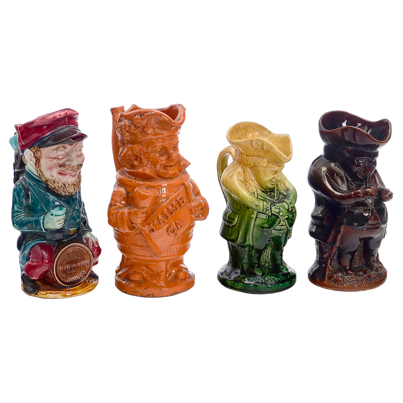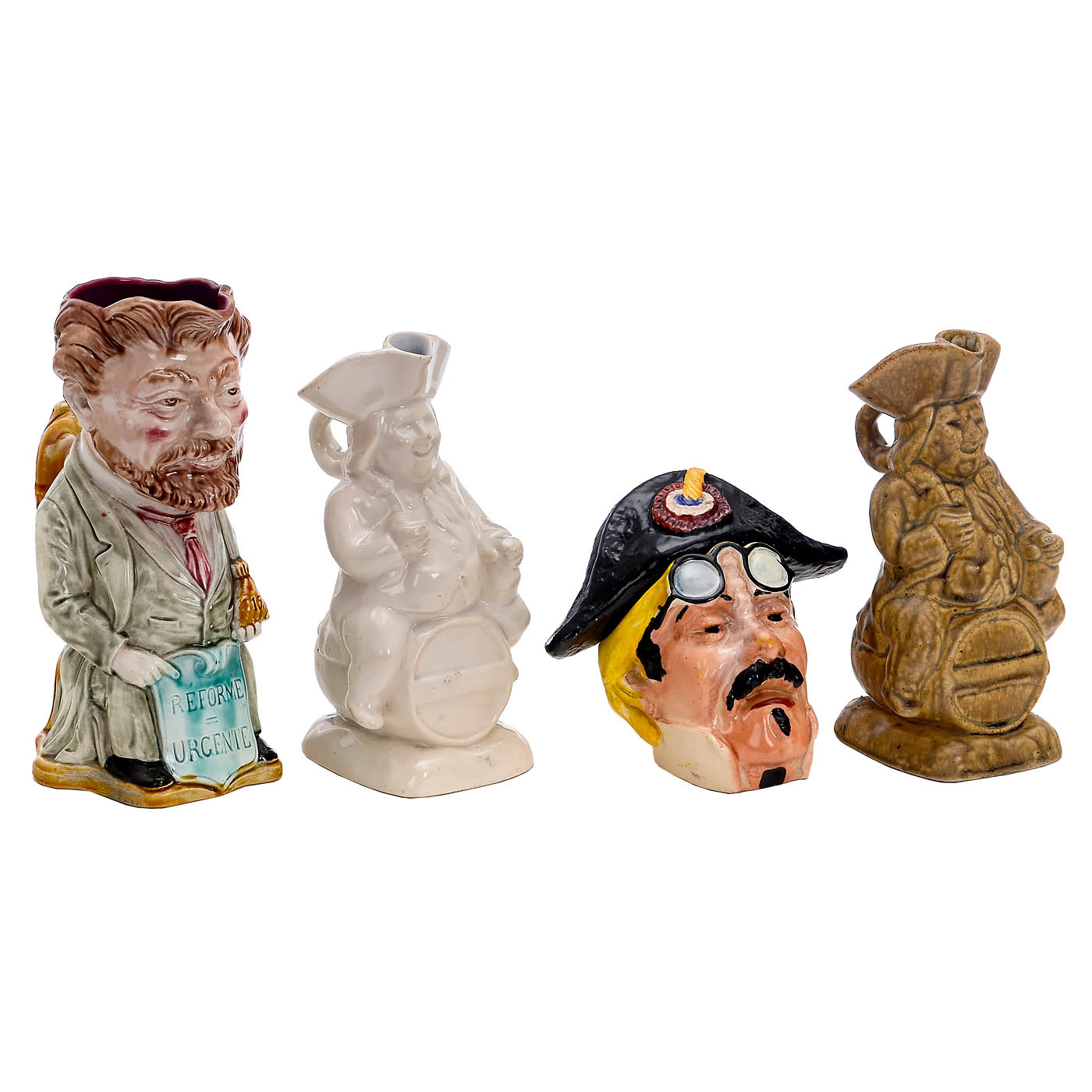 1) 5 English Staffordshire sailor figures: Large figure "Sailor", with ship on his shoulder and boy at his side, height 15 3/5 in. – "The Sailor's Return", waving his hat with his bride at his side. – Sailor, with wide-brimmed hat, crack in the neck, height 13 in. – 2 additional figures, height 8 ? and 10 ? in. – In addition: Minton Majolika, tobacco box, with sailor sitting on top and drinking. – And: 2) Ceramic jug collection: Onnaing-Barbotine, model no. 752, "Vive la Réduction des Périodes" (Long live the reduction of service periods) depicting a French soldier sitting on a barrel, height 11 in. – Onnaing faience factory, France, model no. 41, depicting a politician sitting on a sign with the inscription ‘Réforme Urgente’ (Urgent Reform), height 11 ? in. – Staffordshire, England, Toby jug, depicting a caricature of a man in 18th-century clothing, height 9 ? in. – 4 additional Toby jugs, various English manufacturers, height up to 11 in. – In addition: Head with removable bicorne hat, France, marked with no. 350, height 6 in.