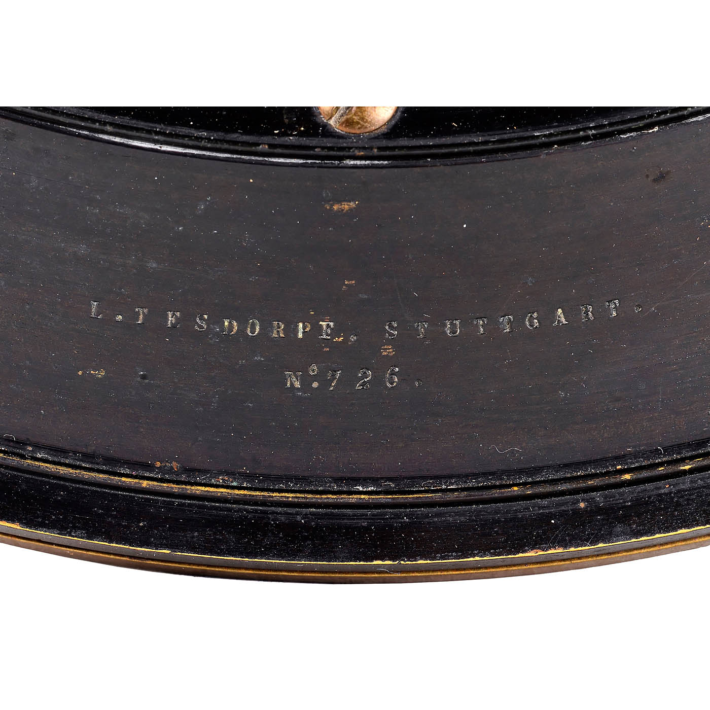 Signed: "L. Tesdorpf, Stuttgart", no. 726, original lacquered and oxidized brass, silvered scales, 2 reading magnifiers, 3 bubble levels, telescope with rack-and-pinion focusing, length: 11 in., overall height: 15 3/4 in., in fitted case.