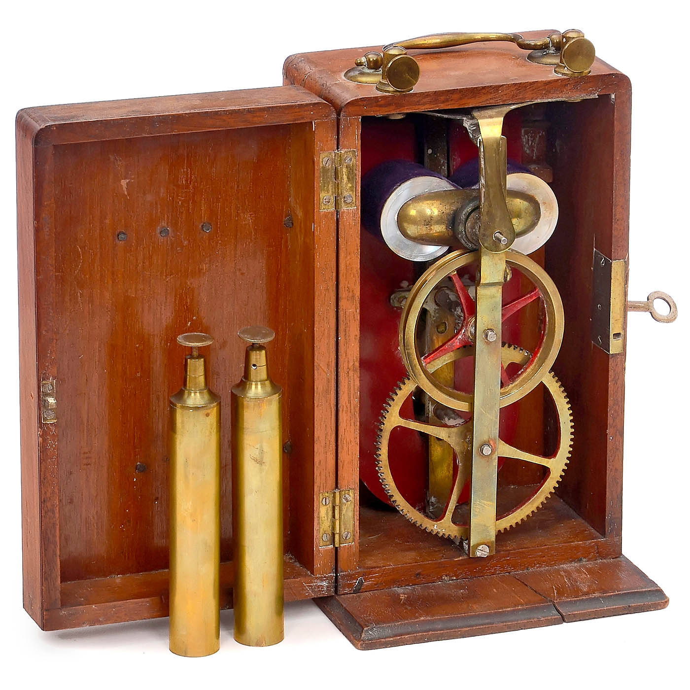 1) Electro-magneto machine, vertical mahogany case, with horseshoe magnet and two coils, hand-cranked, with two electrical connections and two handles. – 2) Electro-magneto machine, horizontal mahogany case, with horseshoe magnet and two coils, hand-cranked, with two electrical connections and two handles, improved magnetic indicator on the lid. – And: 3) Electro-therapy apparatus, small model, with dry battery units, drawer with accessories, size 5 x 5 x 5 in.