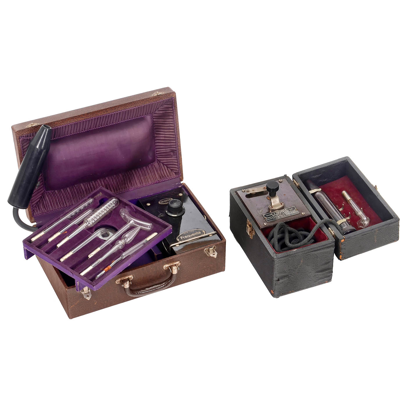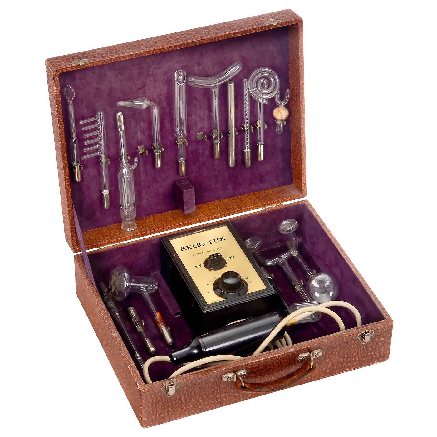 1) "Emax", one transformer and one Tesla coil for generating high-frequency voltage, 20 different gas-filled glass electrodes. – 2) "Helio-Lux", one transformer and one Tesla coil, 15 different gas-filled glass electrodes. – 3) "Frequenta", one transformer and one Tesla coil, 6 different gas-filled glass electrodes. – 4) "Heider", one transformer and one Tesla coil, 4 different gas-filled glass electrodes. – And: 5) "Branston", one transformer and one Tesla coil, 1 gas-filled glass electrode. – Devices of this type were used in quackery, but also in sedative therapy. Untested. – Good condition.
