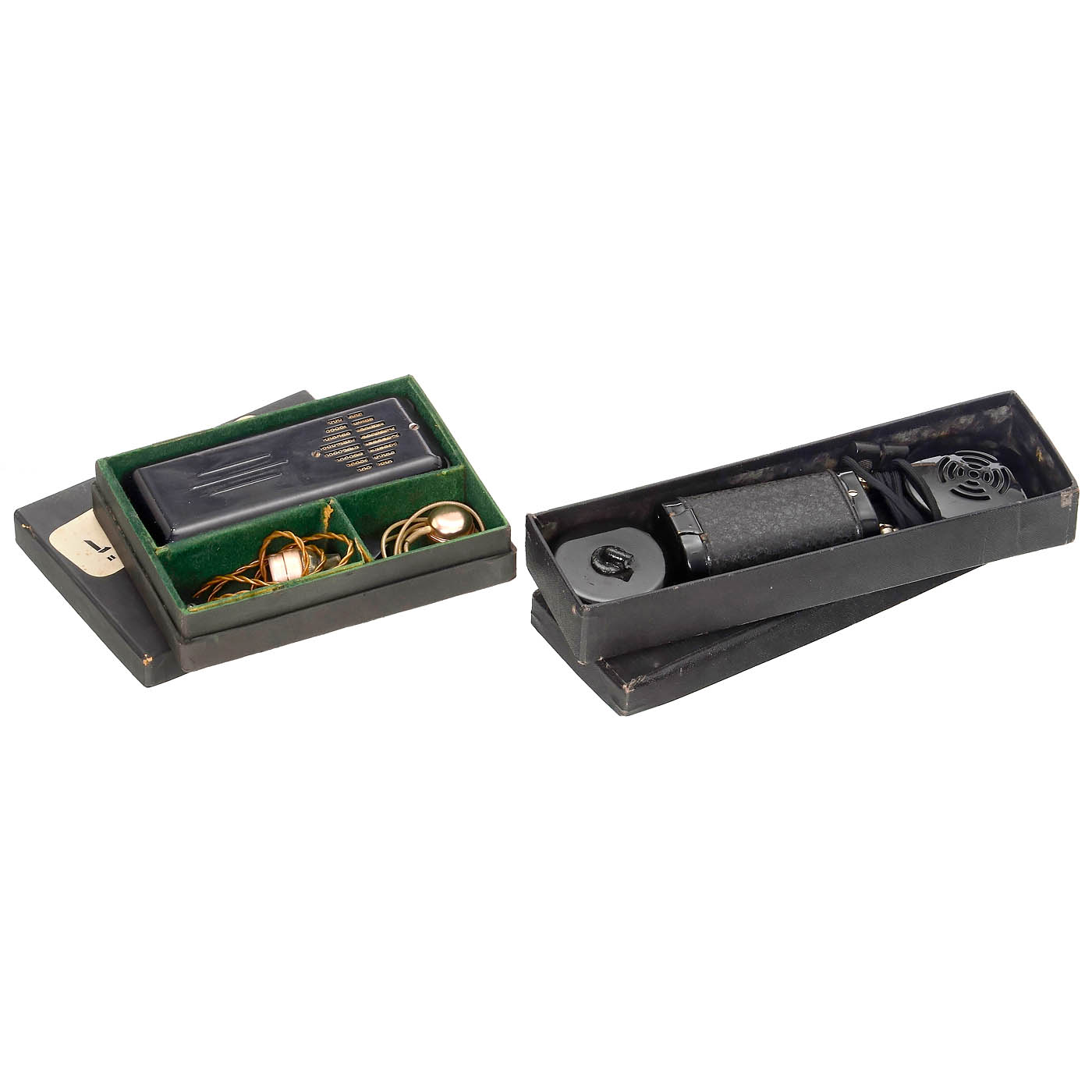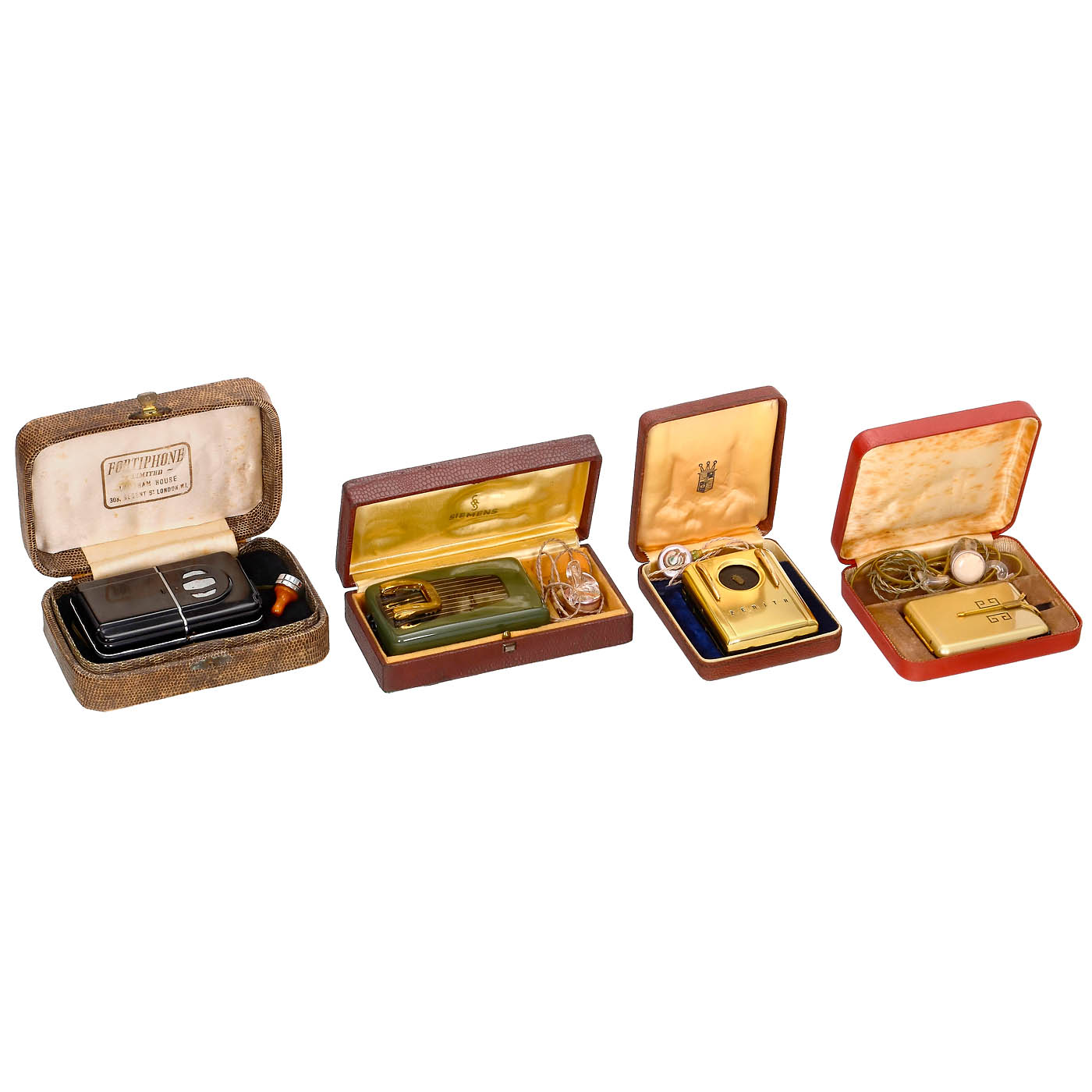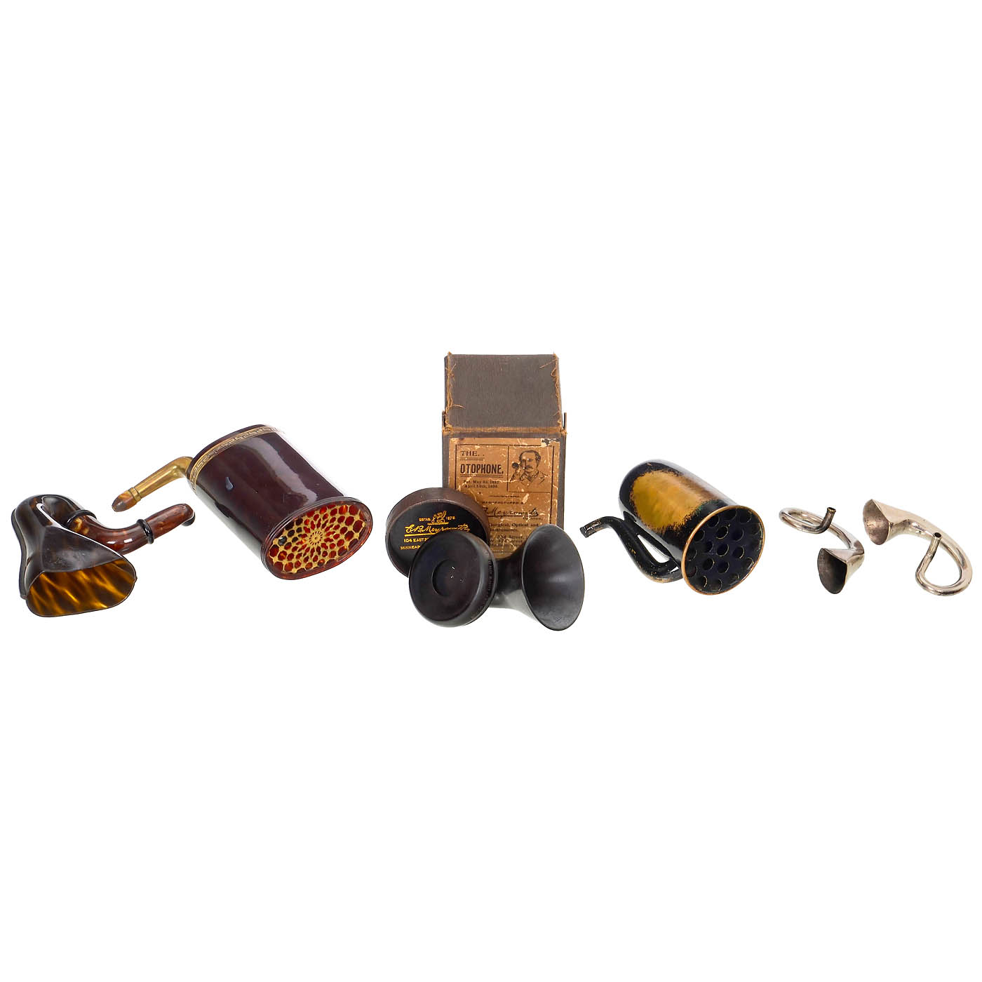 1) Pocket ear trumpet, c. 1880, tortoiseshell and brass, collapsible. – 2) London Dome ear trumpet, c. 1870, black lacquered brass, paint partially worn. – 3) 2 small ear cups, c. 1920, nickel-plated. – 4) "The Otophone", c. 1900, E.B. Meyrowitz, USA, consisting of a funnel opening and a membrane earpiece attached at a right angle, in box. – 5) Model "KW", c. 1920, celluloid. – And: 6) 5 transistor hearing aids, c. 1960, battery-operated, all in boxes: "Zenith Royal", "Siemens Phonophor Beta", "Fortiphone Model 18", "The New Lectron Model L" and "Aditone Transistor 551".