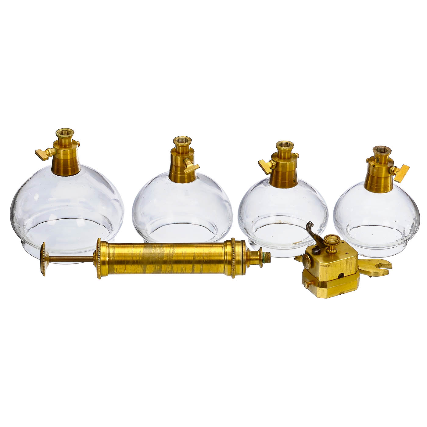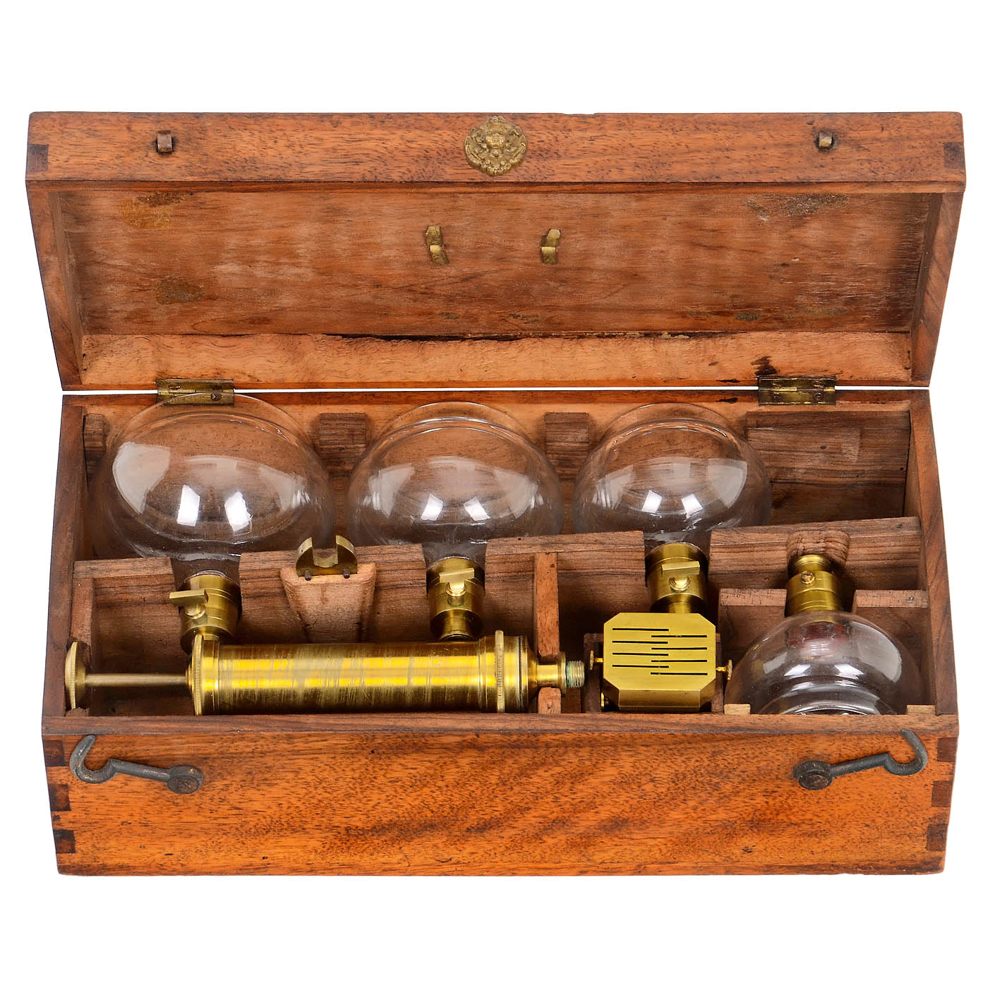 1) Scarificator, brass and steel, for human medical purposes, with 8 blades, clamping lever and knob for adjusting the depth of the incision. – And: 2) Set of 4 mouth-blown cupping glasses, with brass valves, matching hand pump, glass diameters 1 ?, 2, 2 1/3 and 2 ? in., in matching walnut box.