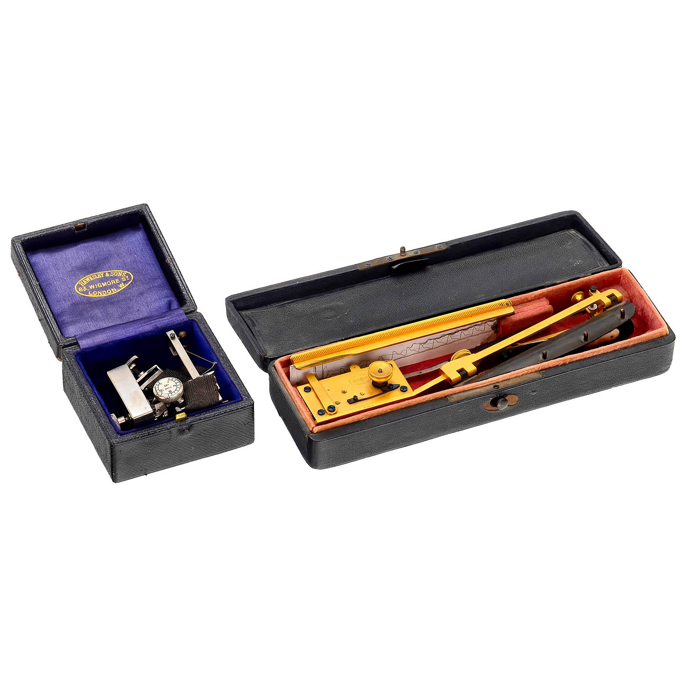 1) Breguet brass Dr. Marey's sphygmograph, late 19th century, French, with clockwork movement recording the pulse via a bone sensor, in velvet-lined fitted leather-covered case, length 8 ? in. – And: 2) Dudgeon-type sphygmograph/pulseometer, c. 1890–1910s, Hawsley & Sons, London, small clockwork mechanism, for paper strip. The pulse causes a needle to oscillate and mark the paper for each pulse beat, with fabric strap in velvet-lined and leather-covered case.
